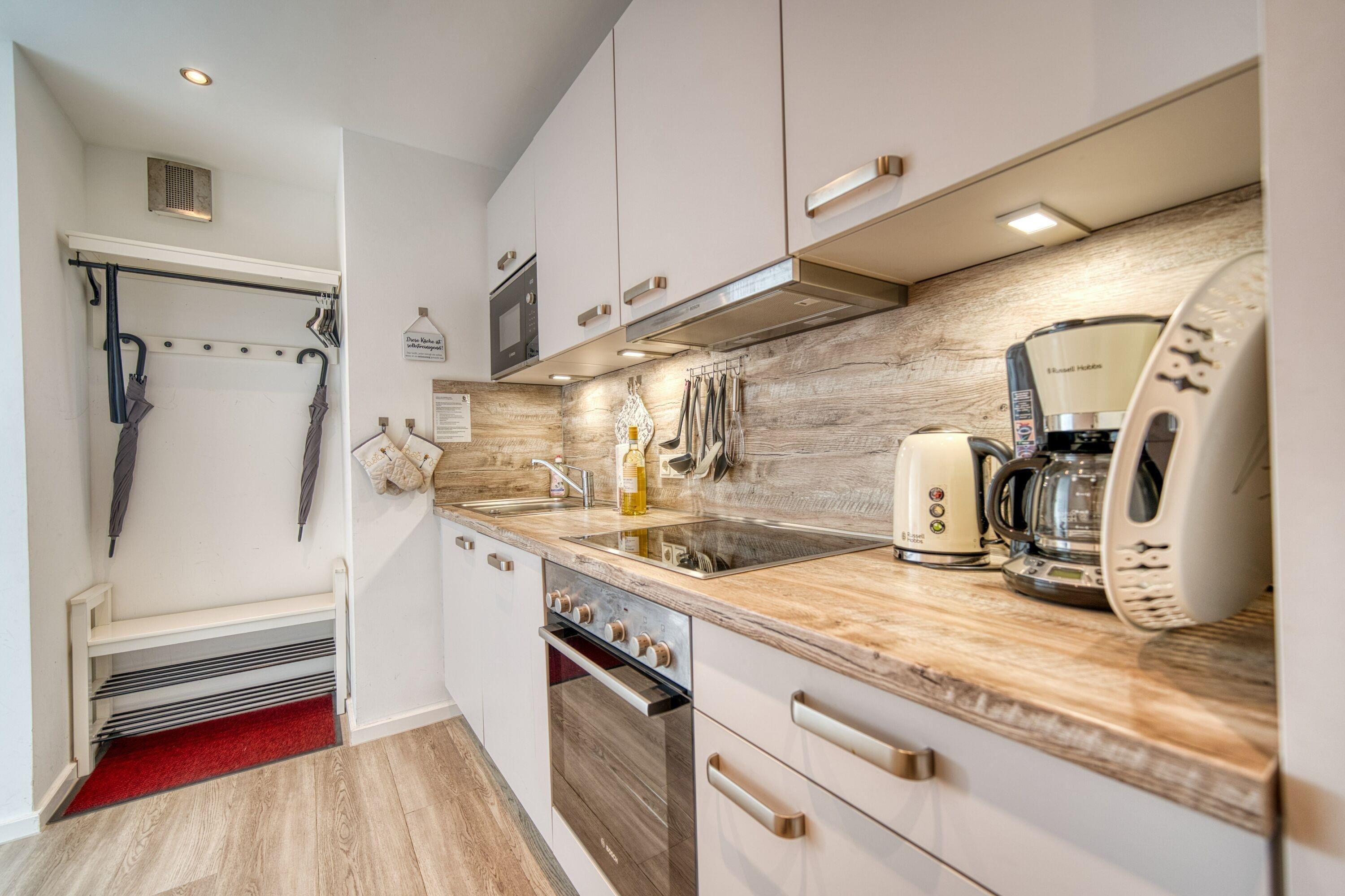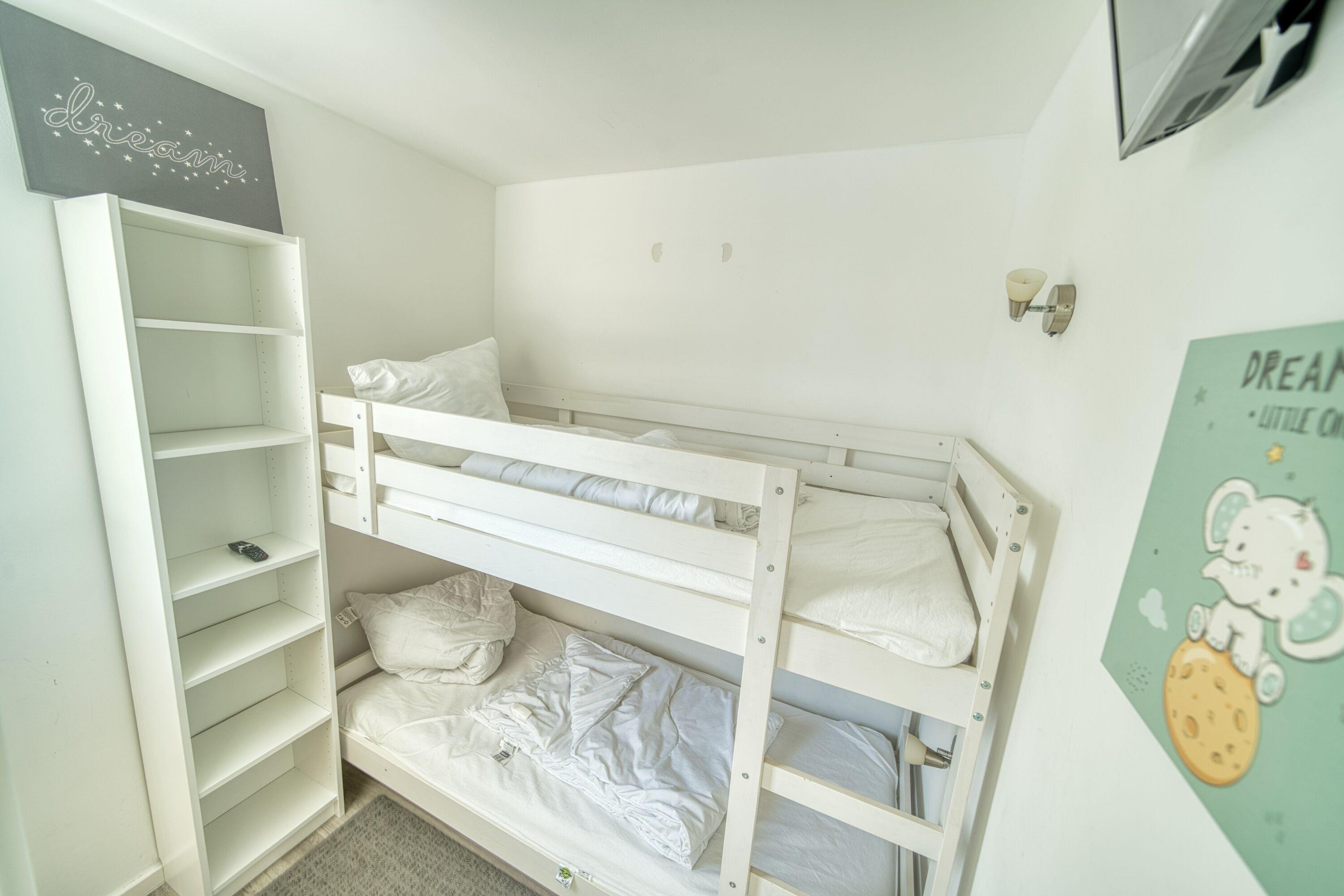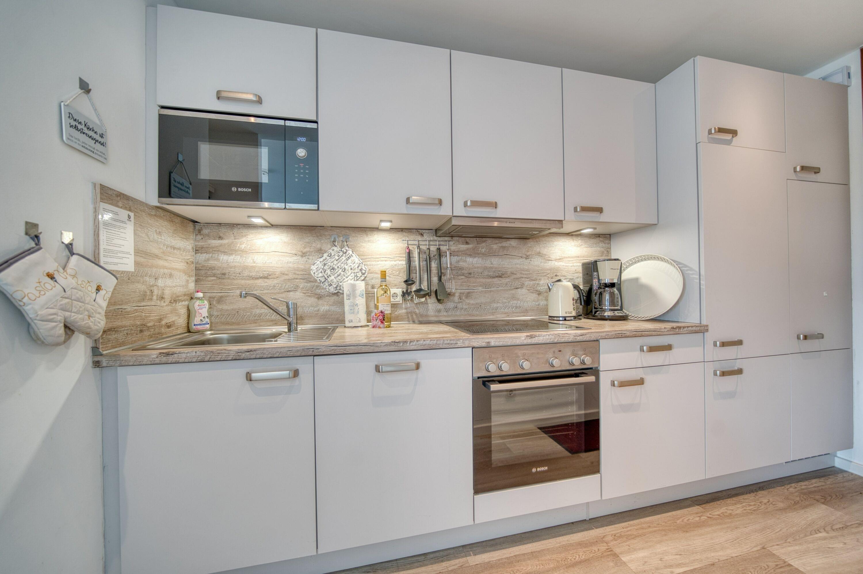 Liebevoll eingerichtete 45?m² Ferienwohnung im 5. OG des Hauses O für bis zu 4 Personen. Wohnbereich mit Sofa, Flachbild-TV und Esstisch vor dem Südbalkon. Separates Schlafzimmer mit Doppelbett und TV, Kinderzimmer mit Etagenbett und TV. Küche mit Ceranherd, Kühlschrank mit Gefrierfach, Backofen, Mikrowelle, Toaster, Wasserkocher. Modernes Bad mit Duschkabine und Handtuchtrockner. Vinylboden in der gesamten Wohnung.
