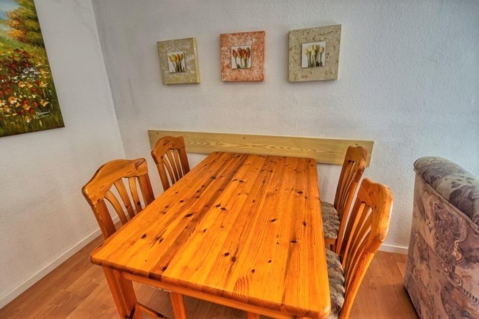Wohn-Esszimmer mit TV und Radio, separates Schlafzimmer mit Doppelbett, Kinderzimmer mit Etagenbett. Küche mit Kühlschrank, Gefrierfach, 4-Platten-Herd. Bad mit WC und Dusche. Nichtraucherwohnung, keine Haustiere, kein WLAN, nicht allergikerfreundlich. Balkon mit Seeblick. Wohnung älteren Baujahrs. Bis zu 4 Personen. Strand ca. 300?m, Aktiv-Hus mit Schwimmbad, Wellness und Restaurants in der Nähe.