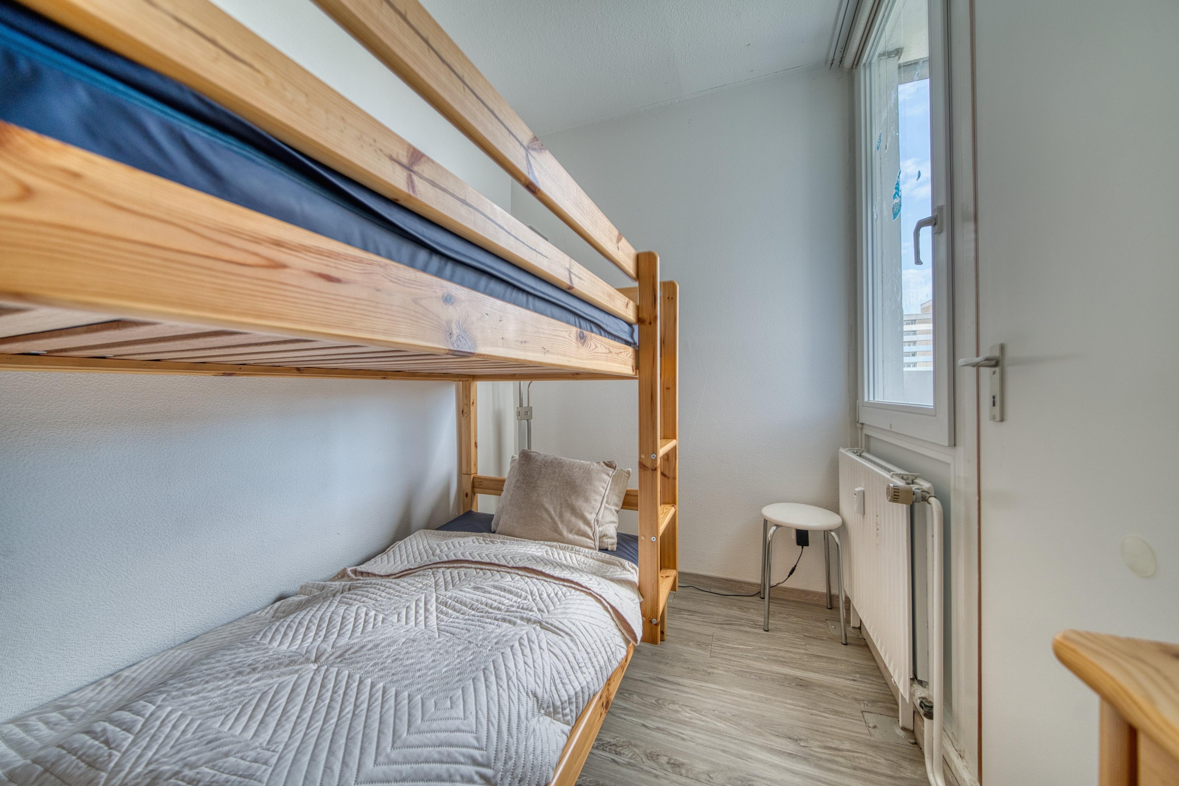 Der Wohn-/Schlafbereich verfügt über ein Doppelbett (optisch abgetrennt), Sofa und Flachbild-TV. Ein separates Schlafzimmer mit Etagenbett eignet sich ideal für Kinder. Der Esstisch steht direkt am Balkon.