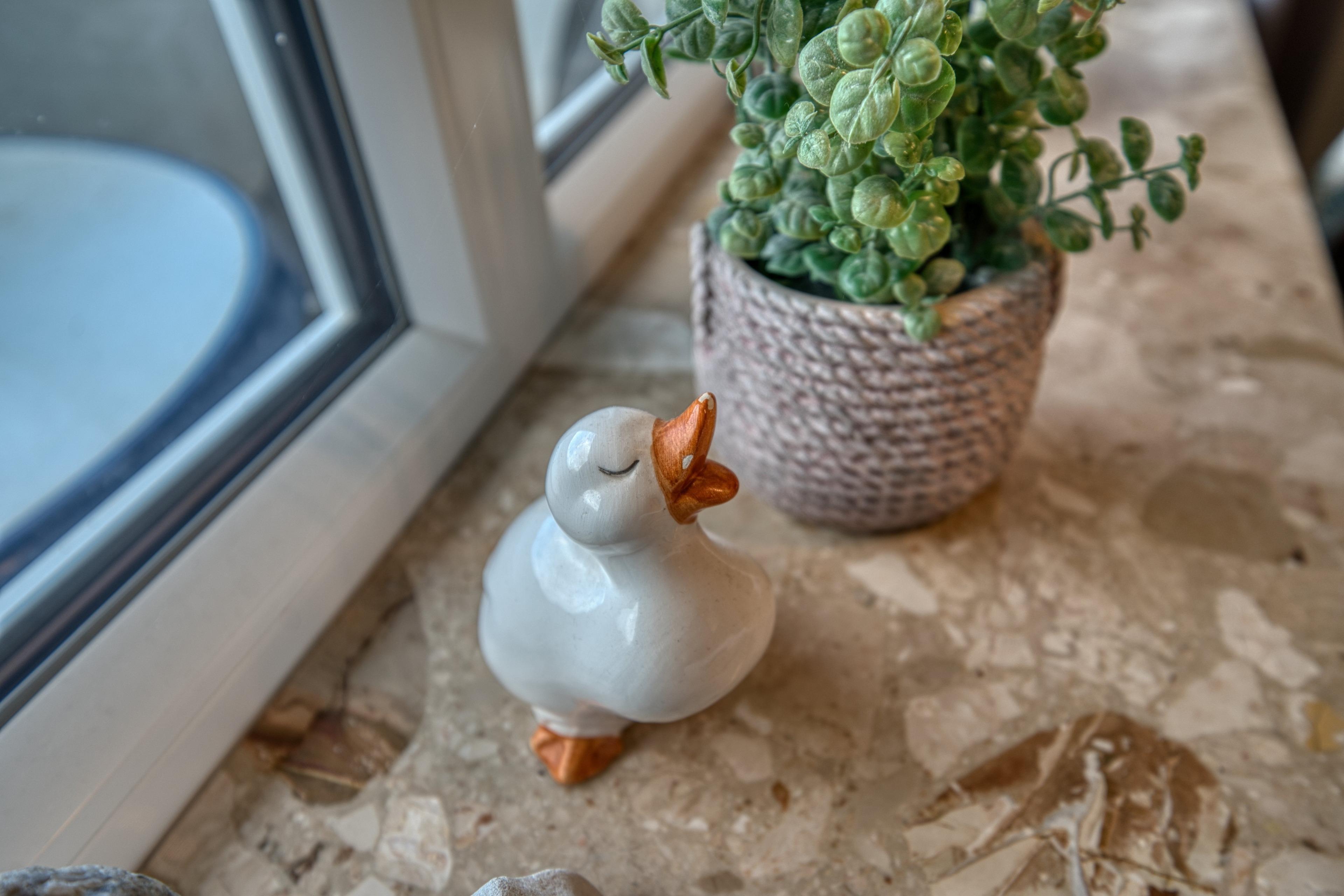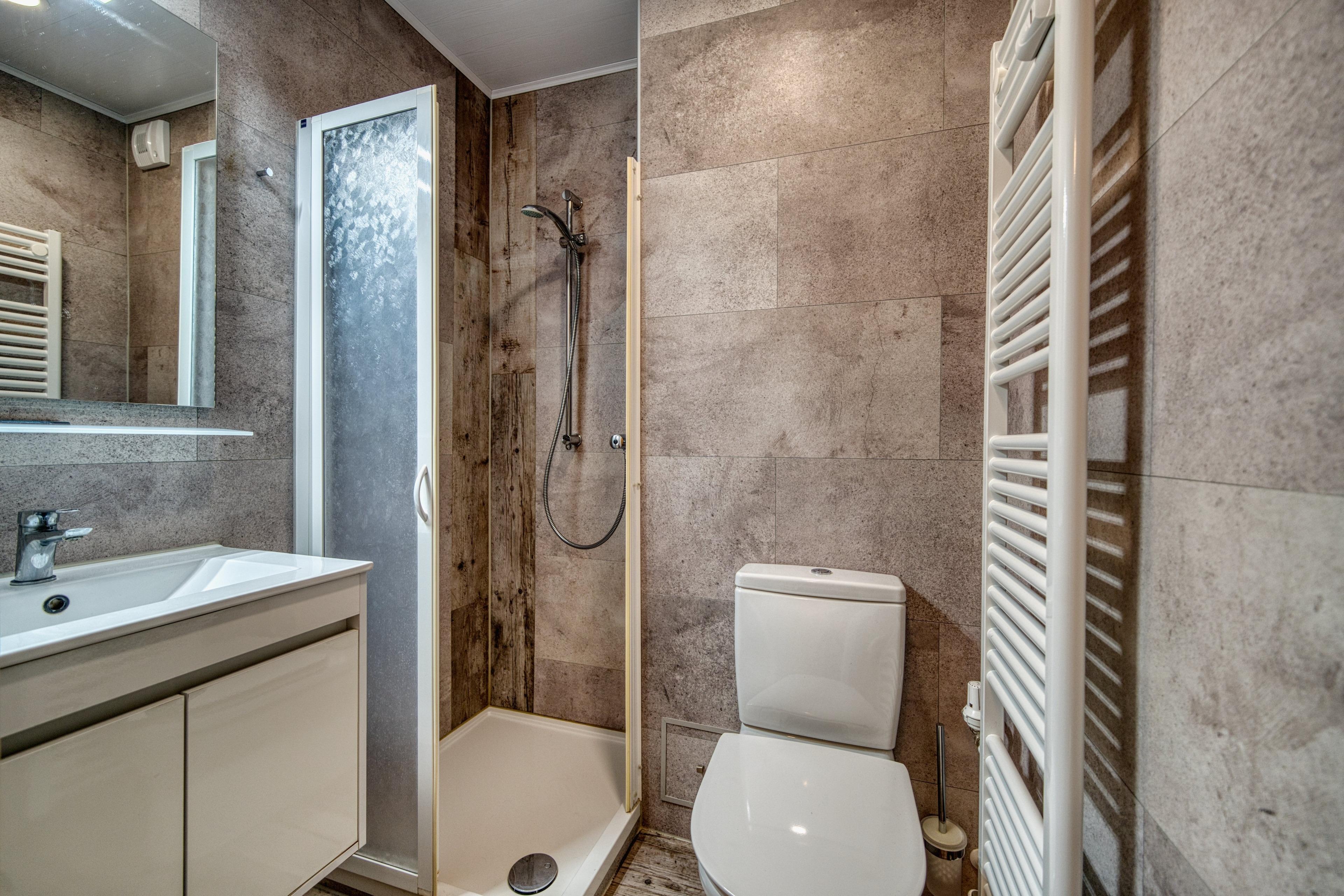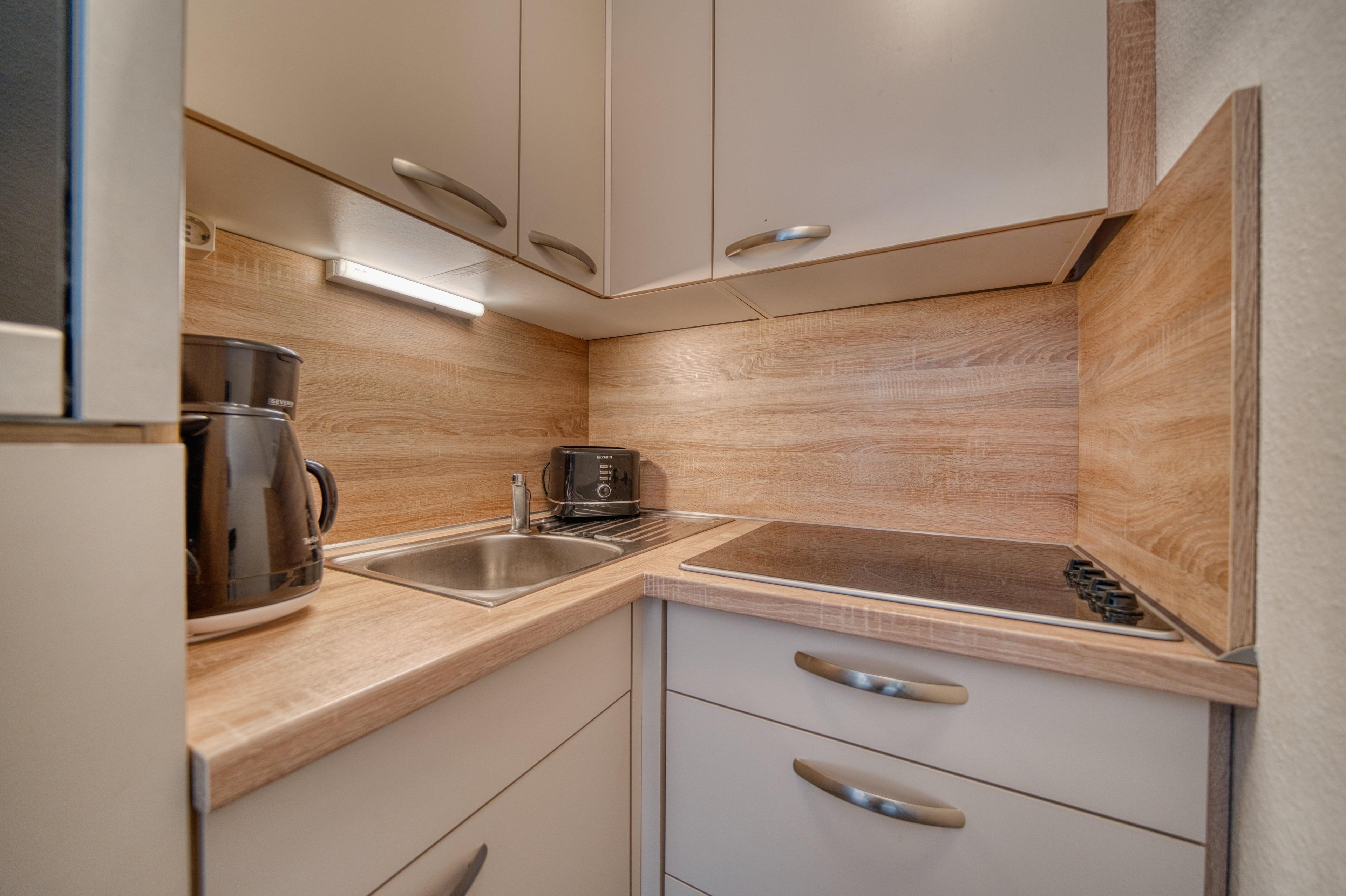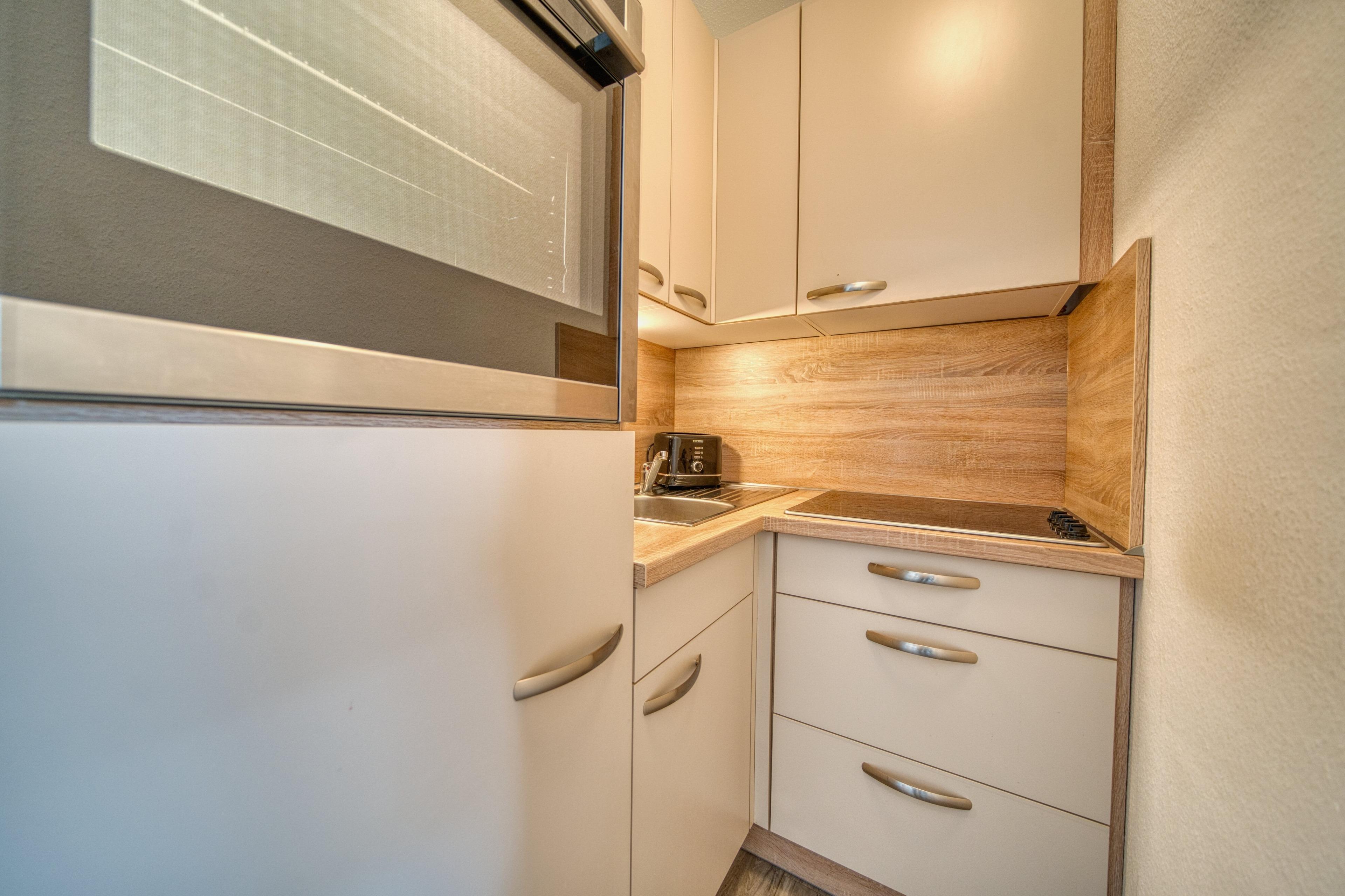 Die Küche ist ausgestattet mit Ceranherd, Backofen, Kühlschrank mit Gefrierfach sowie Toaster, Filterkaffeemaschine und Wasserkocher. Das Badezimmer bietet Dusche, WC und Handtuchtrockner.
