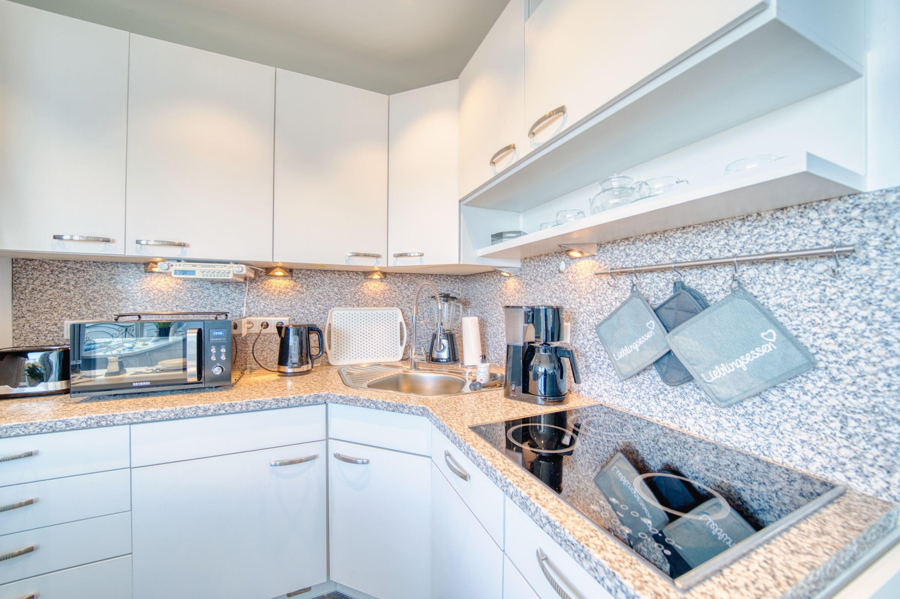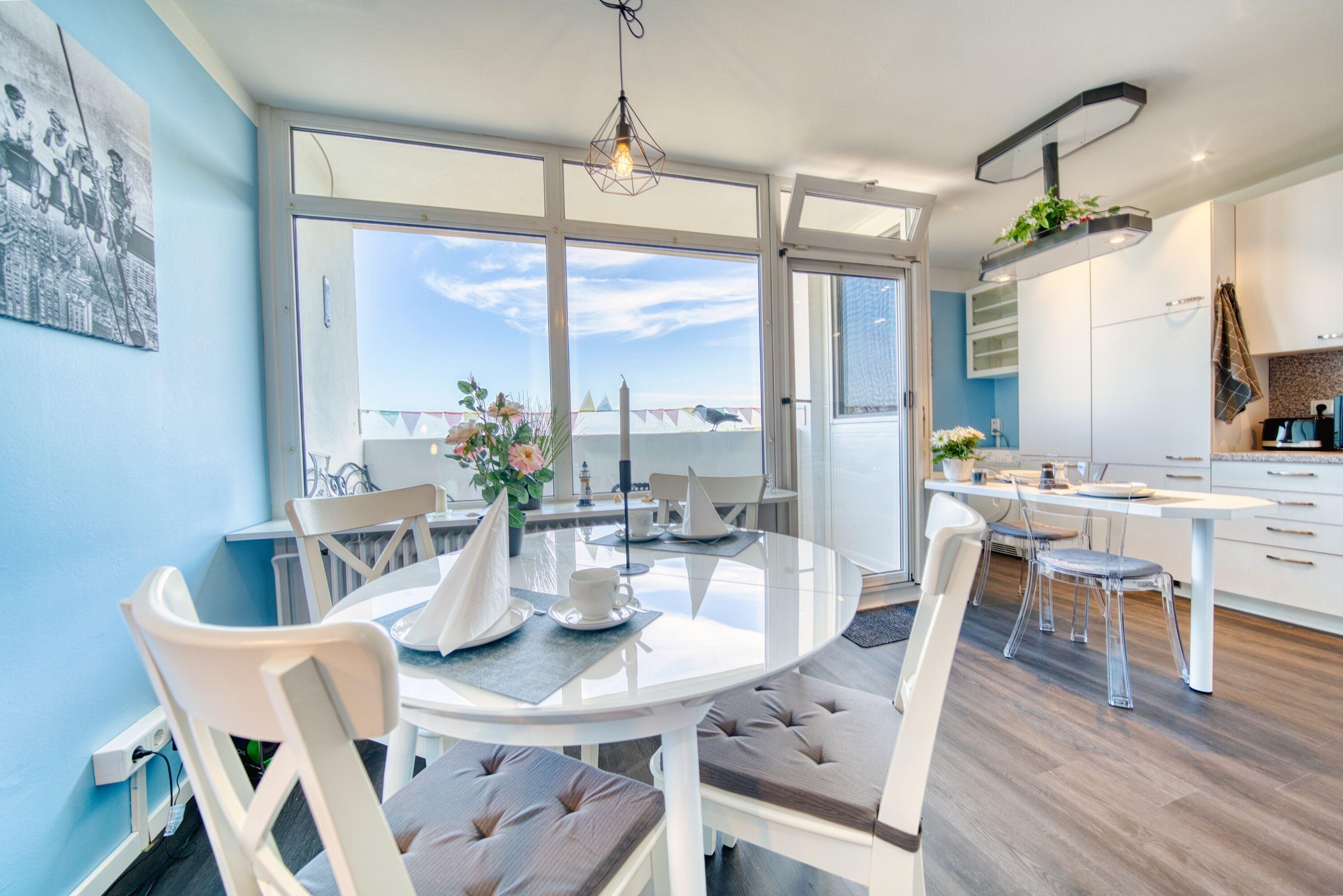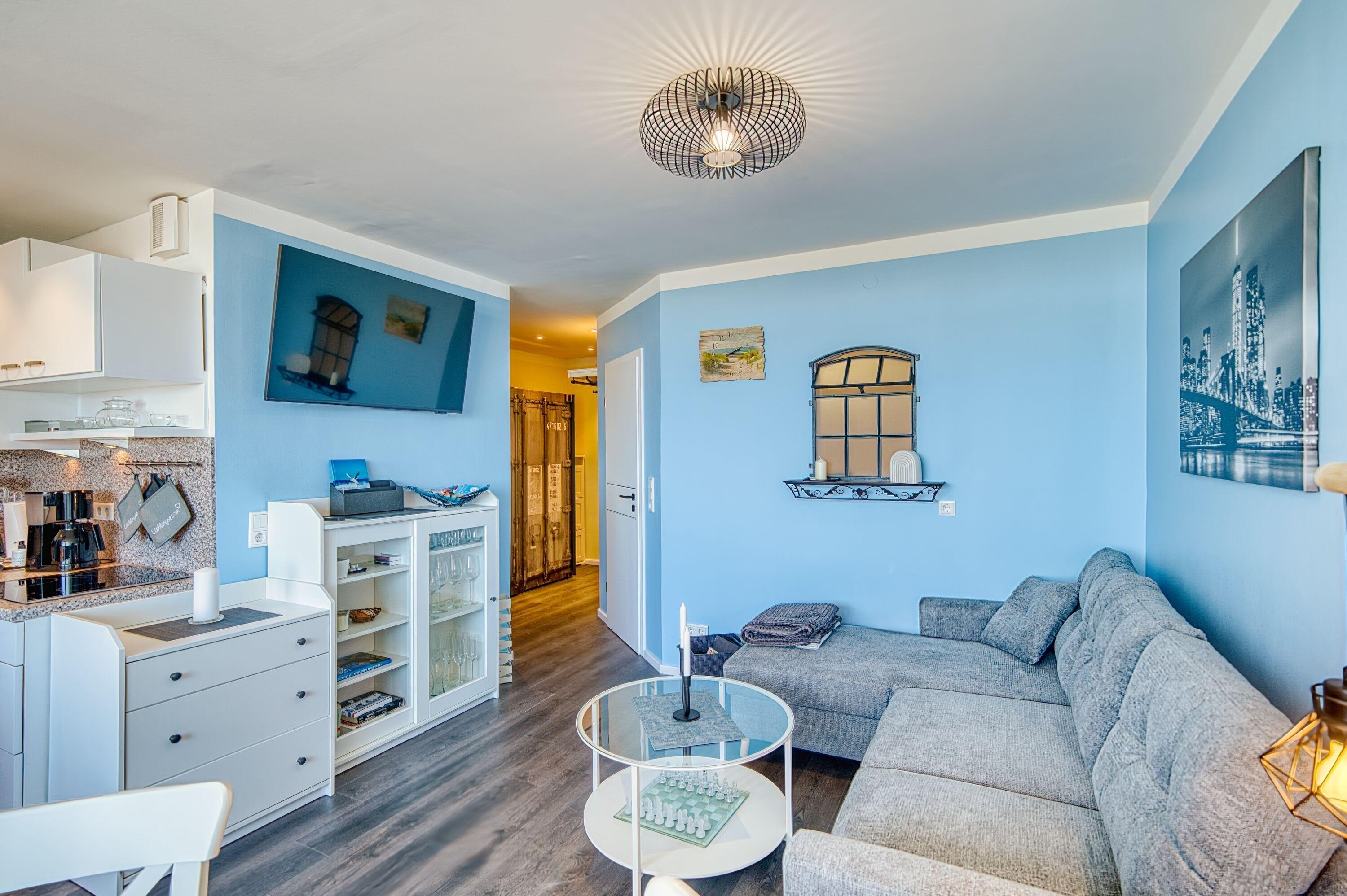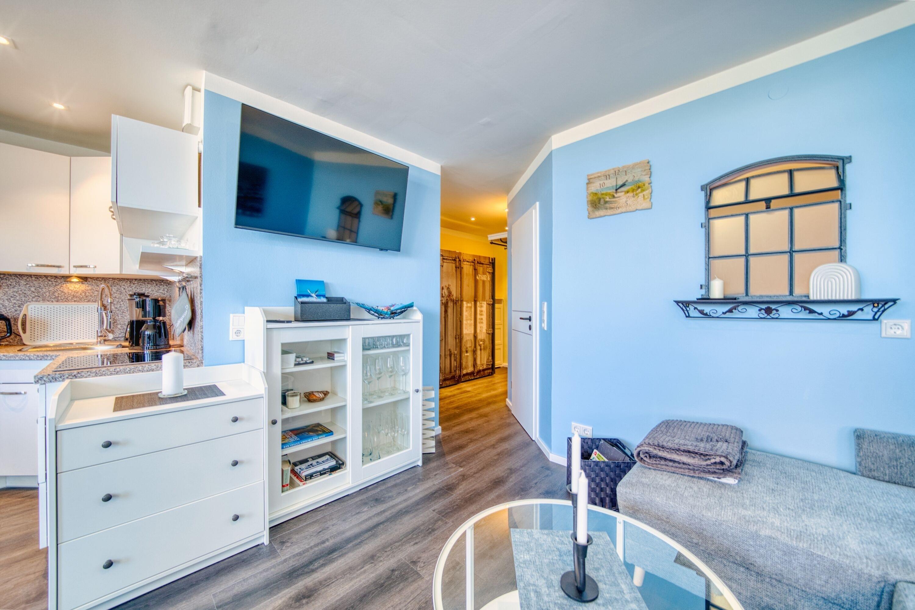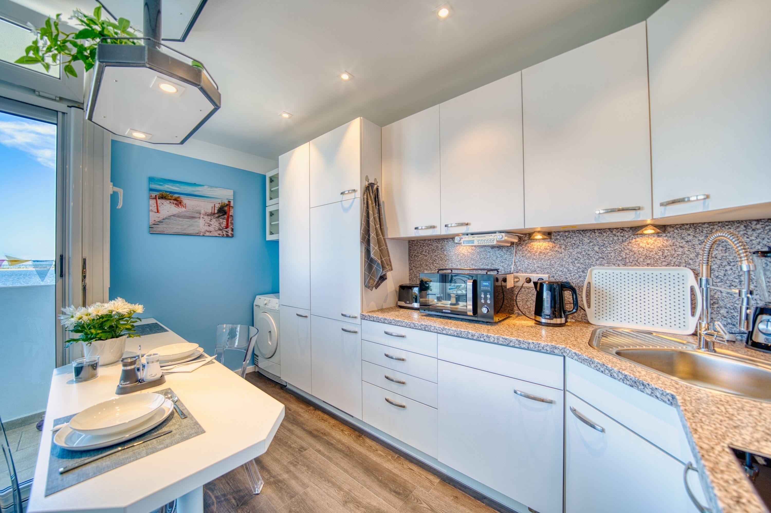 Separates Schlafzimmer mit Doppelbett und TV, Wohnbereich mit Sofa, großem Flachbild-TV und Esstisch vor dem Balkon. Küche mit Ceranherd, Mikrowelle, Backofenfunktion, Kühlschrank mit Gefrierfach, Geschirrspüler, Standmixer, Wasserkocher, Toaster und Filterkaffeemaschine. Bad mit Duschkabine, Handtuchtrockner. Bonus: WLAN, Waschmaschine mit Trocknerfunktion, Fahrstuhl, Fahrradräume, ca. 300?m zum Strand, Parkplatz kostenlos. Nichtraucherwohnung, keine Haustiere.
