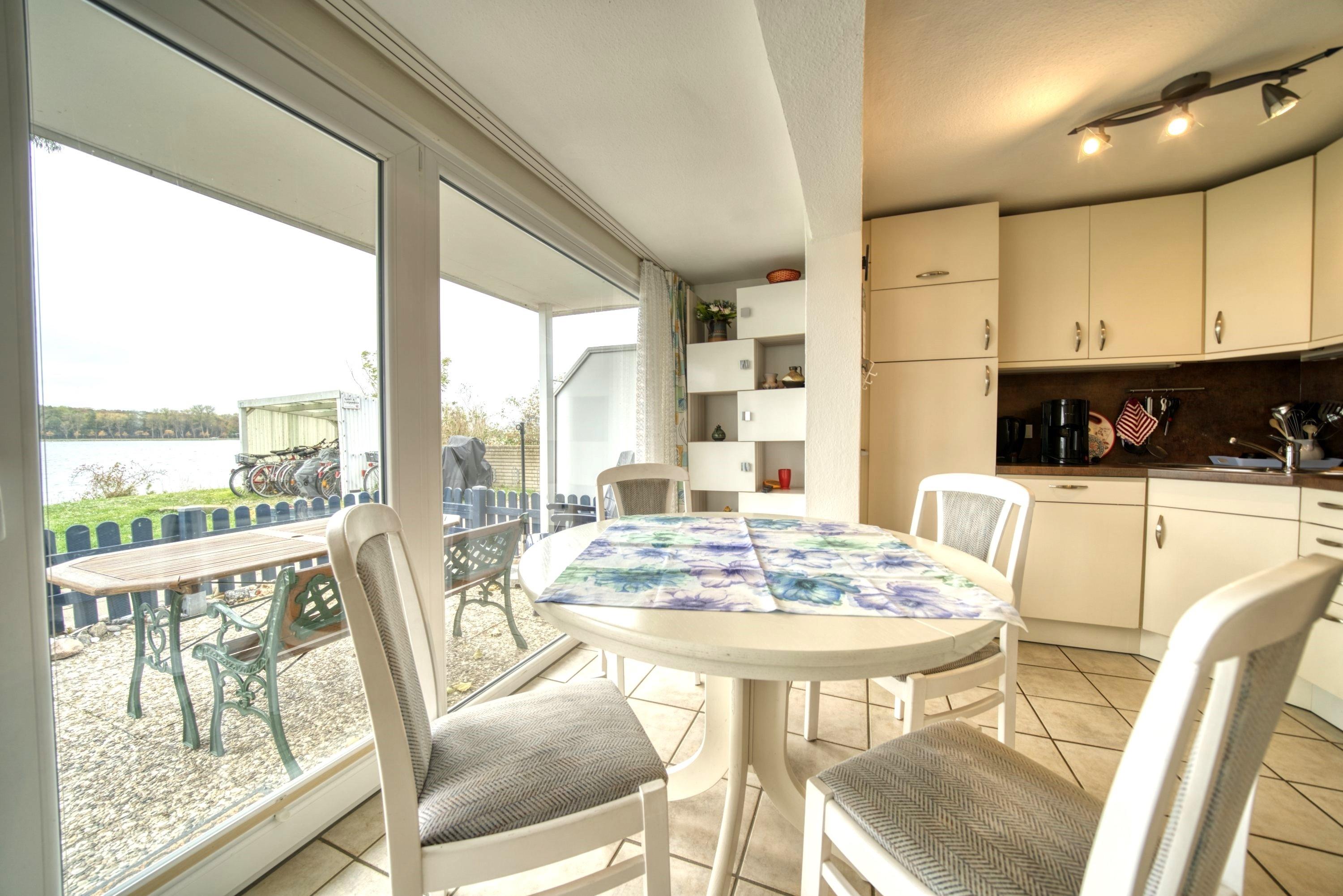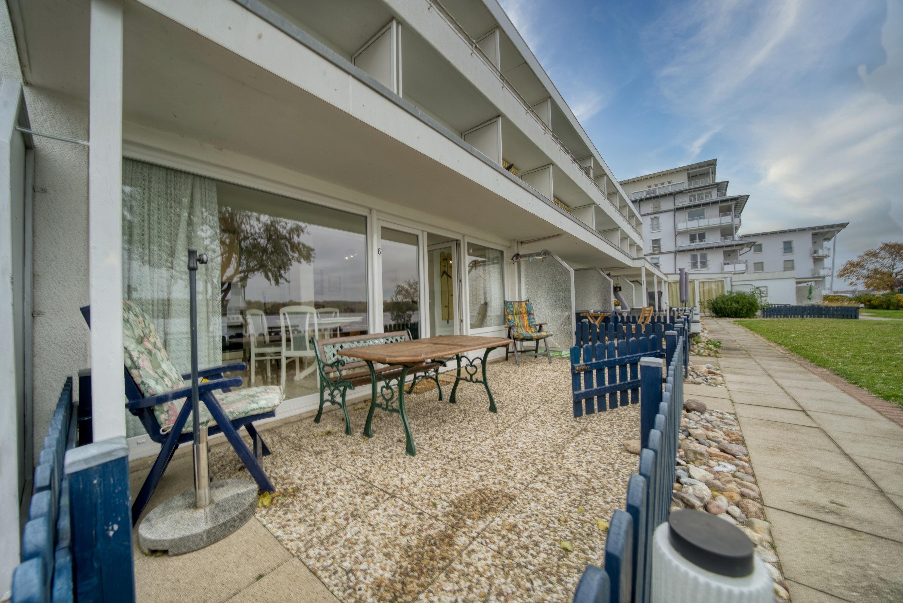 Gemütliches Erdgeschossapartment mit Terrasse und Blick auf den Binnensee, nur 100 Meter vom Strand in Heiligenhafen entfernt.