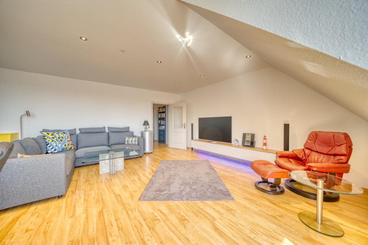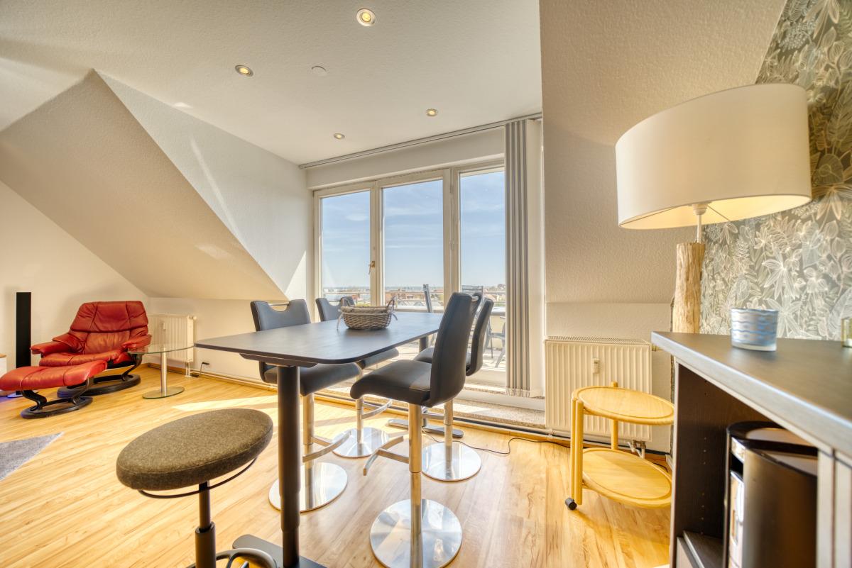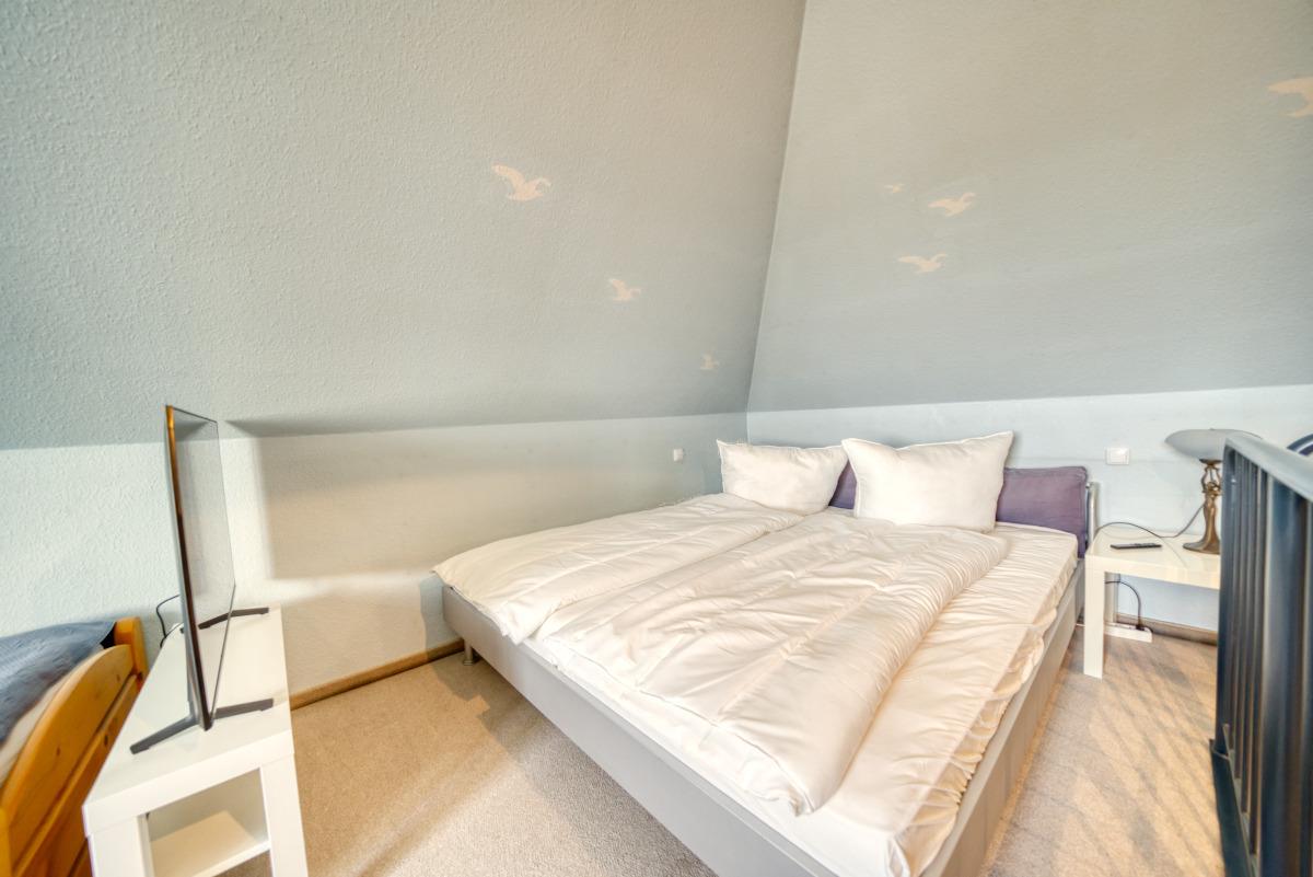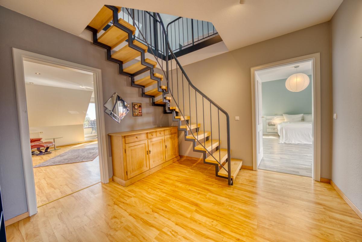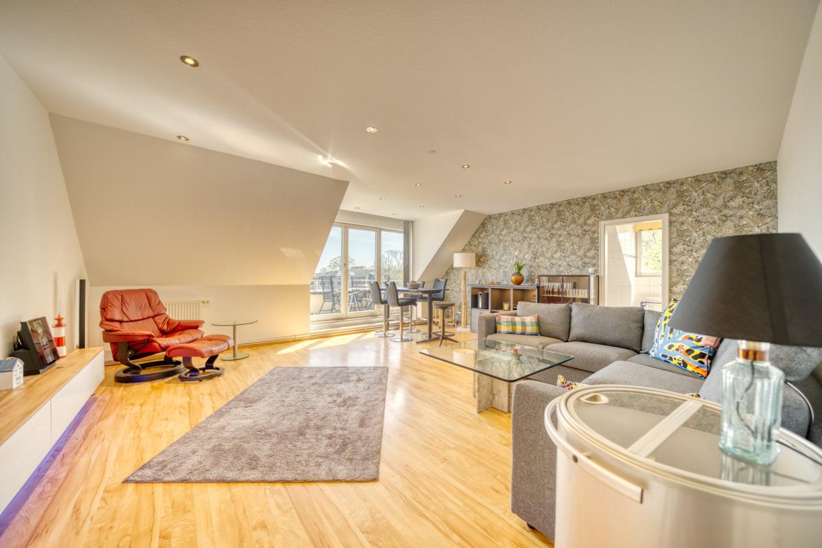 Ausstattung: Zwei Etagen, 2 Balkone mit Ostseefernblick. Wohnbereich mit Schlafcouch, TV, höhenverstellbarem Esstisch und Barhockern. Dachgeschoss mit 3 Schlafmöglichkeiten, TV und französischem Balkon. Schlafzimmer mit Boxspring-Doppelbett, TV, Kleiderschrank, zusätzlichem Schlafsessel und Zugang zum Balkon.