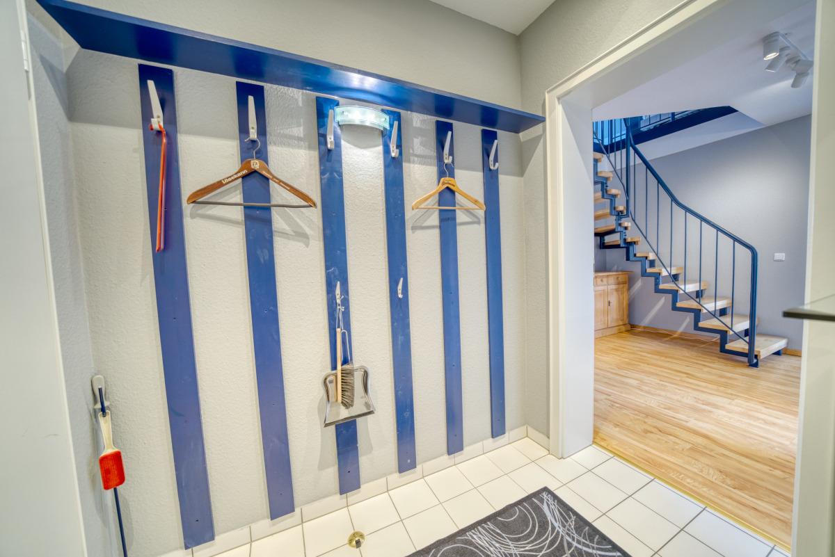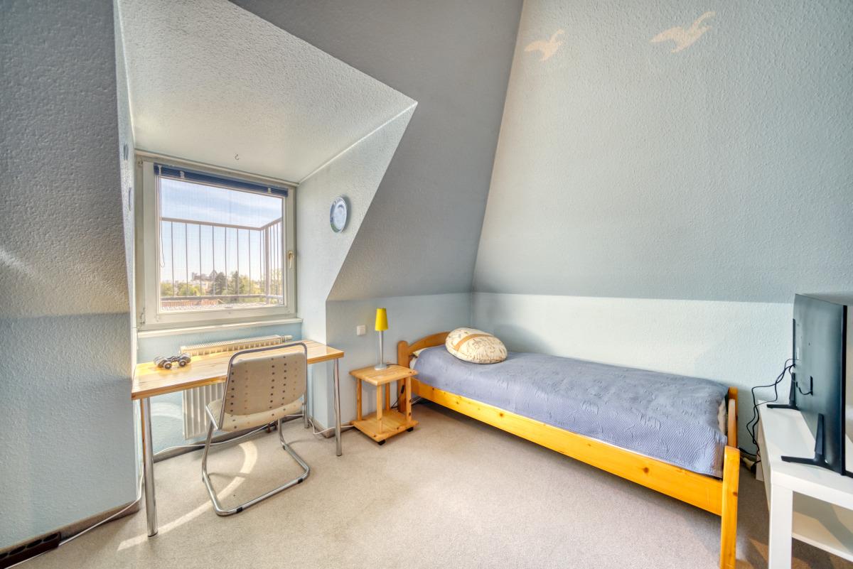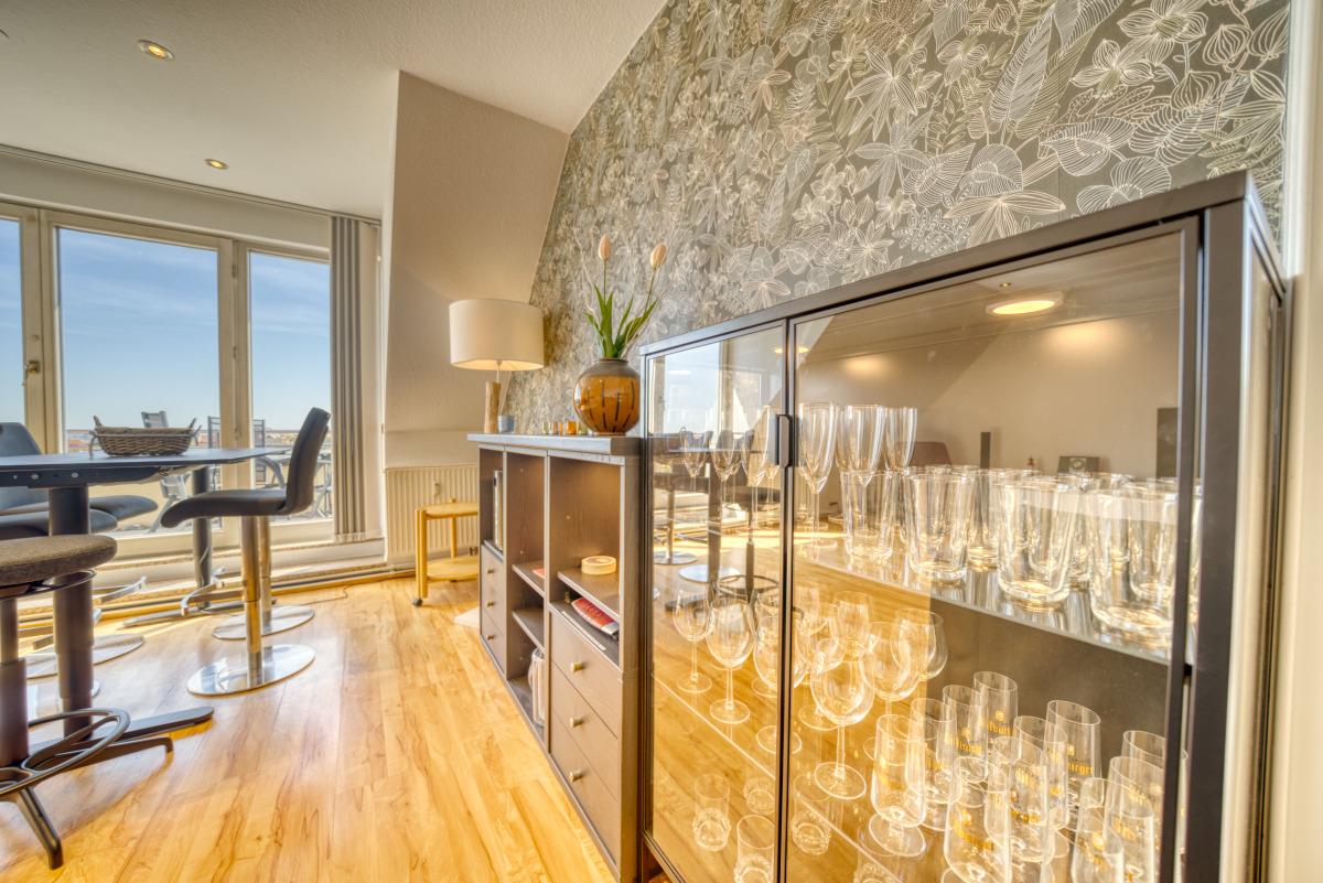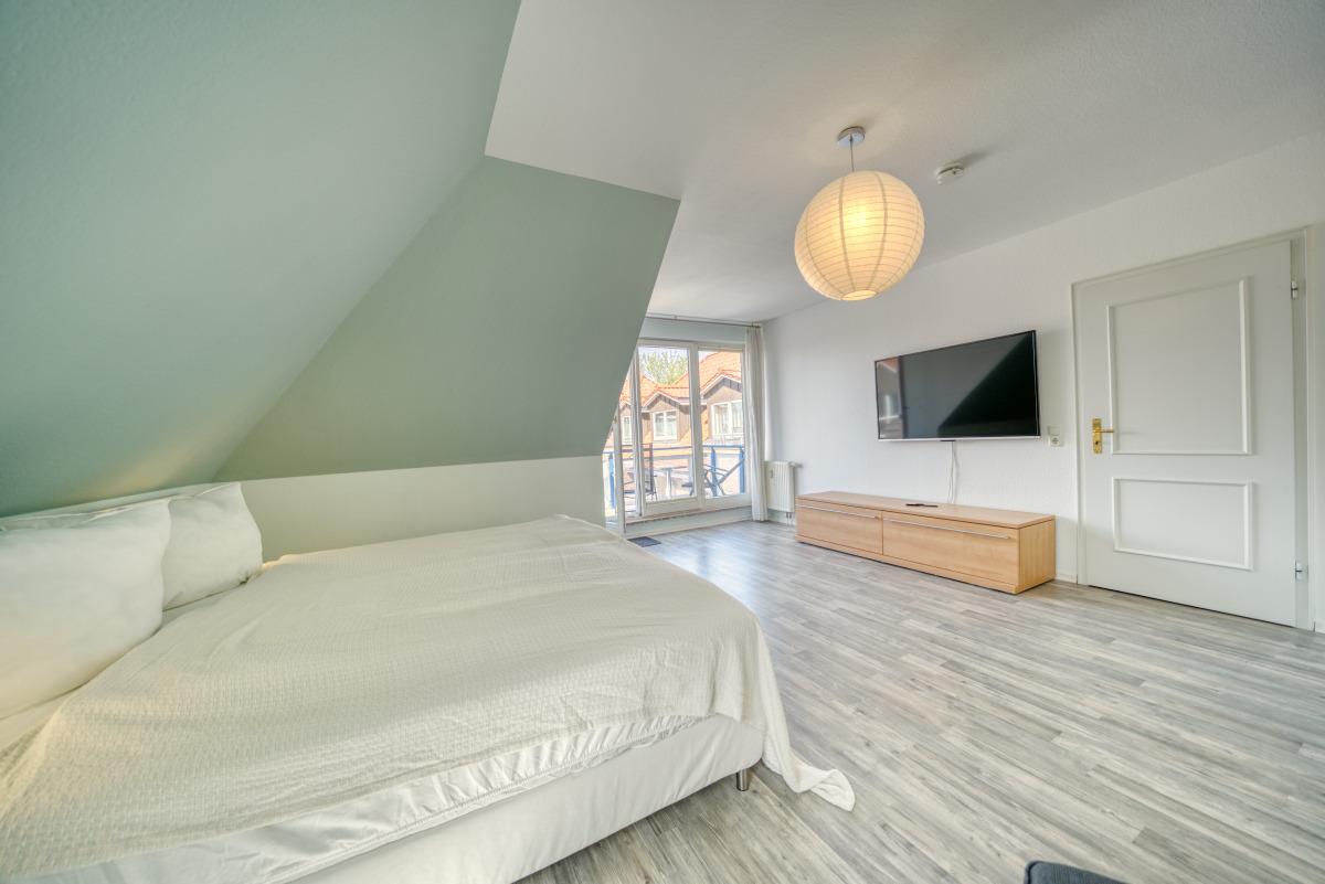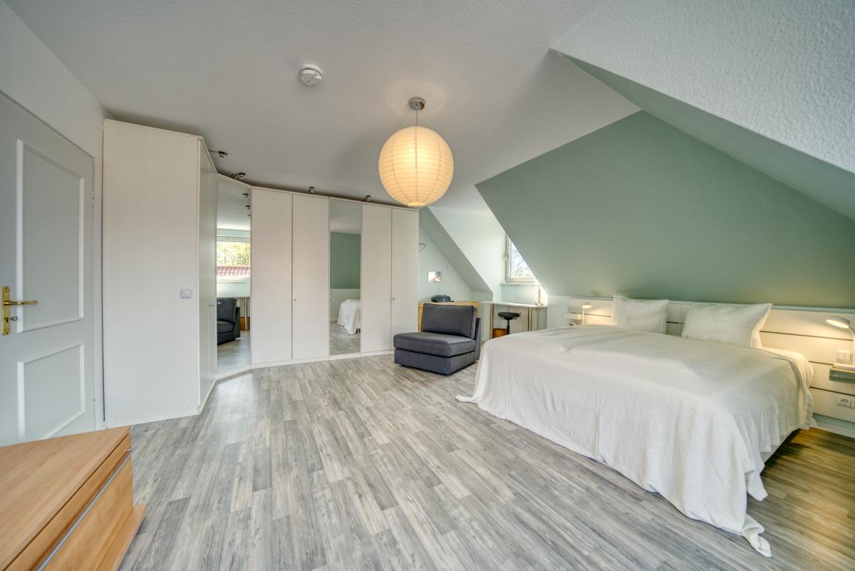 Ausstattung: Zwei Etagen, 2 Balkone mit Ostseefernblick. Wohnbereich mit Schlafcouch, TV, höhenverstellbarem Esstisch und Barhockern. Dachgeschoss mit 3 Schlafmöglichkeiten, TV und französischem Balkon. Schlafzimmer mit Boxspring-Doppelbett, TV, Kleiderschrank, zusätzlichem Schlafsessel und Zugang zum Balkon.