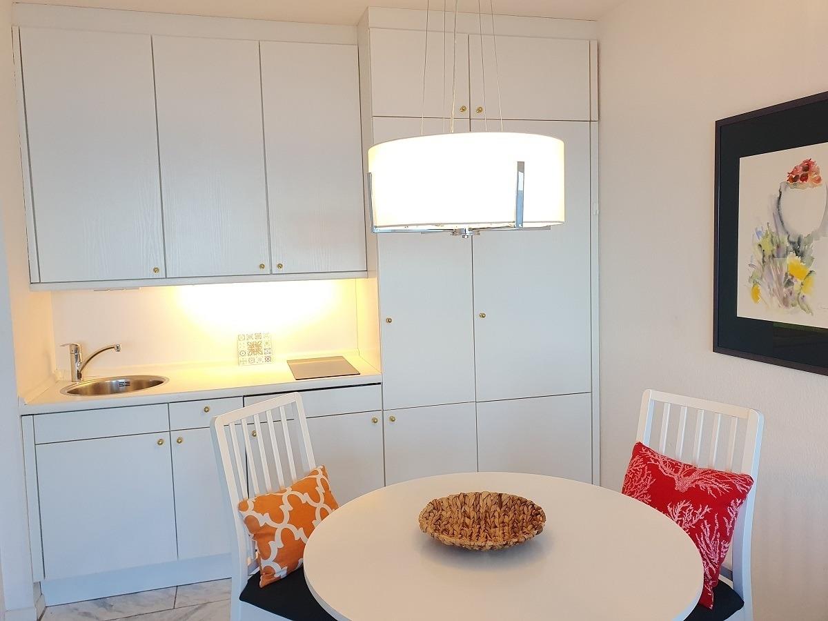 Der Wohn-/Schlafbereich verfügt über zwei Schlafcouchen, die Küche ist kompakt ausgestattet mit Cerankochfeld, Toaster, Wasserkocher, Filterkaffeemaschine und Kühlschrank. Das Badezimmer bietet Dusche und WC, TV ist vorhanden, WLAN auf Anfrage.