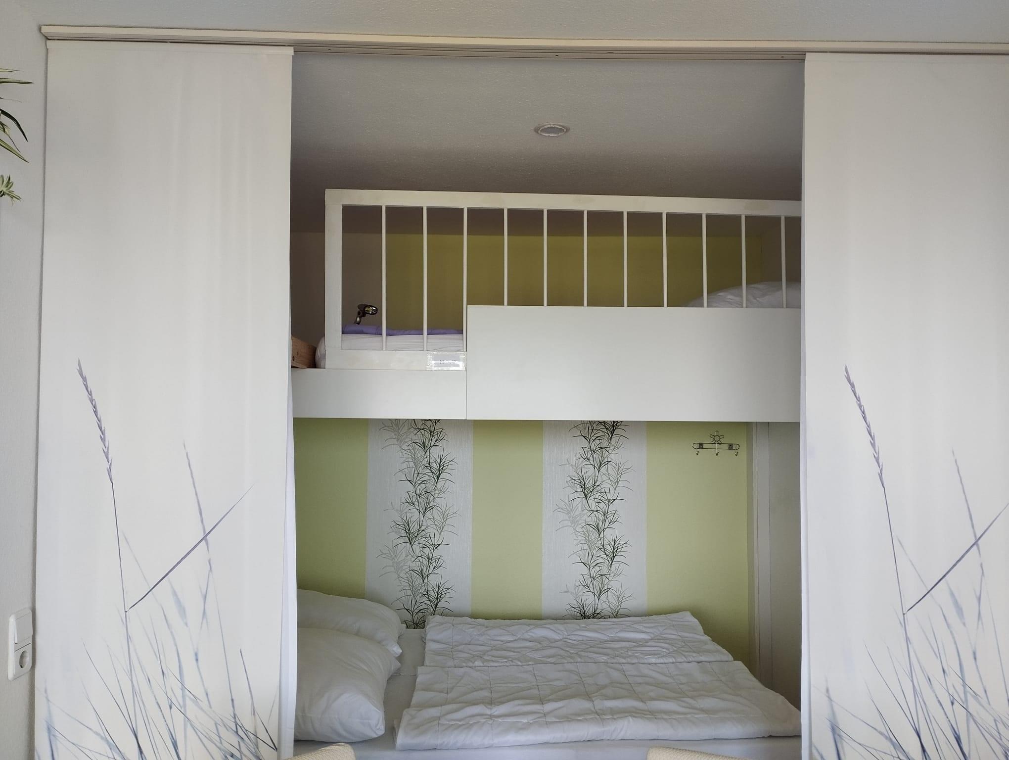 Wohn-/Schlafzimmer mit Doppelbett und Hochbett (1,20?m, max. 140?kg)