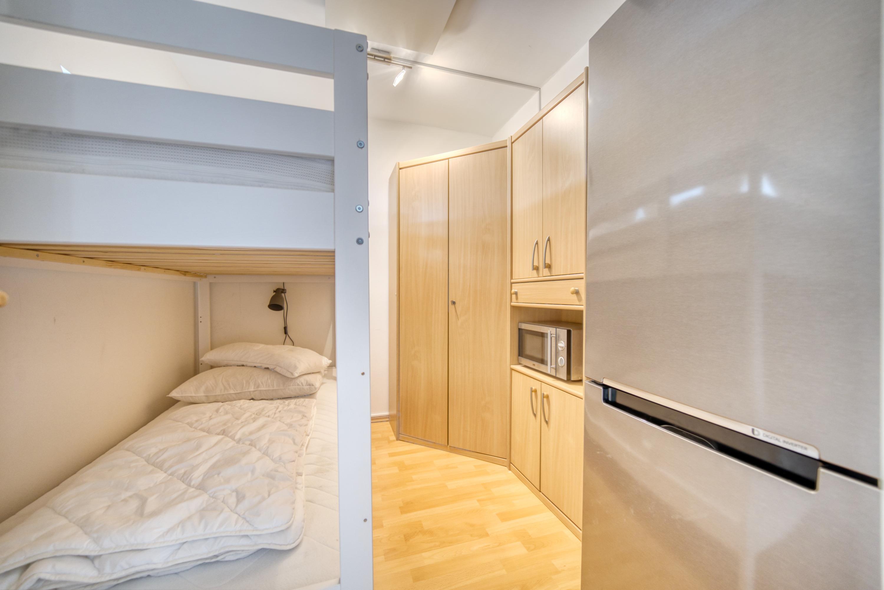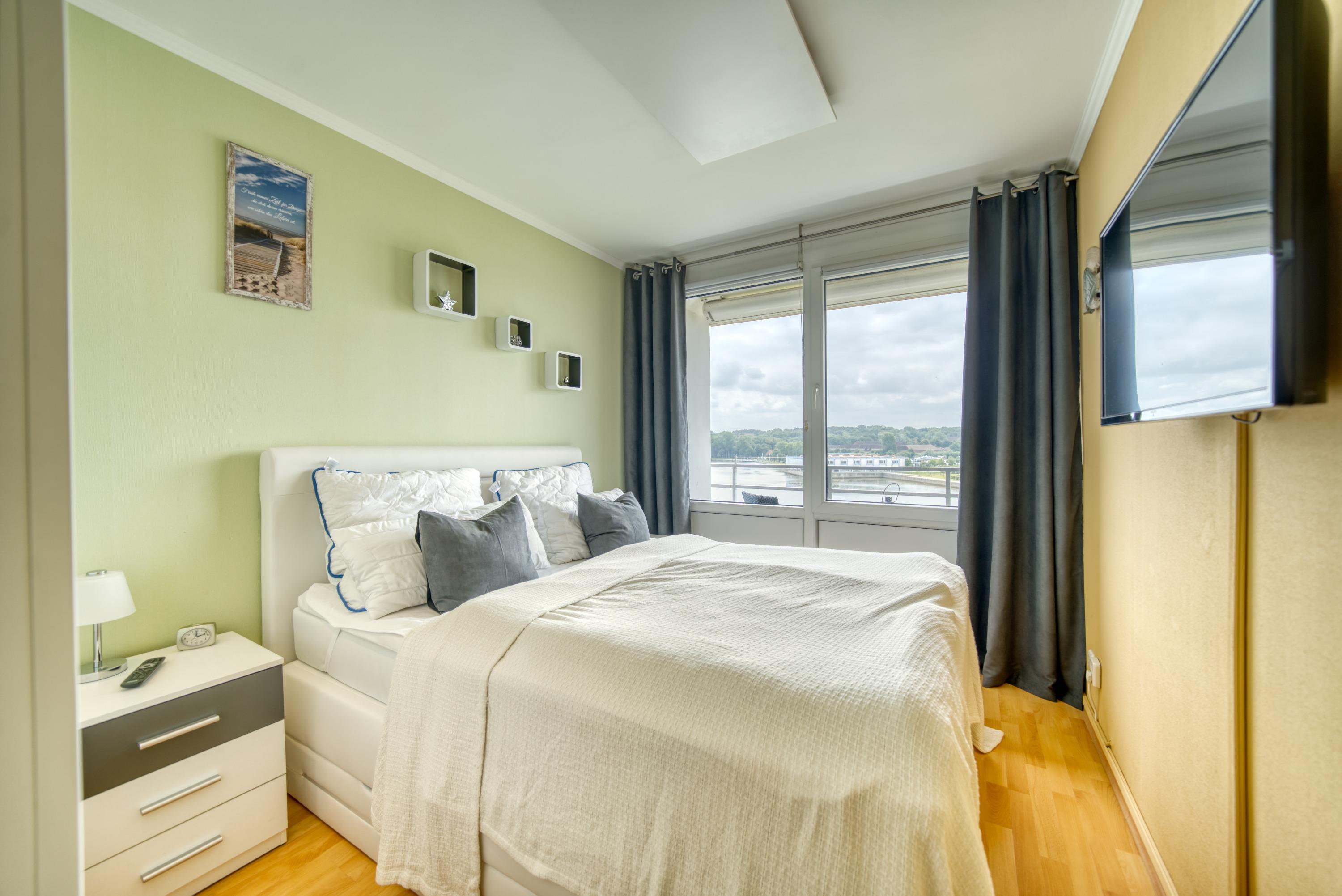 Ausstattung: Wohnzimmer mit Schlafcouch, separates Schlafzimmer mit Boxspringbett und Seeblick, zweites Schlafzimmer mit Hochbett. Küche mit Ceranfeld, Mikrowelle, Geschirrspüler und Kaffeevollautomat. Bad mit Dusche/WC, Infrarotstrahler. Südlicher Balkon mit Binnenseeblick, WLAN.