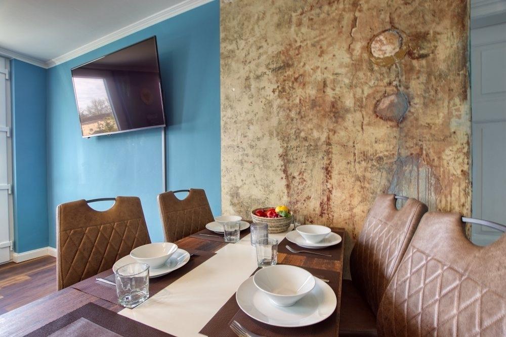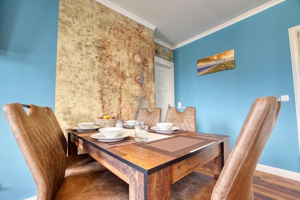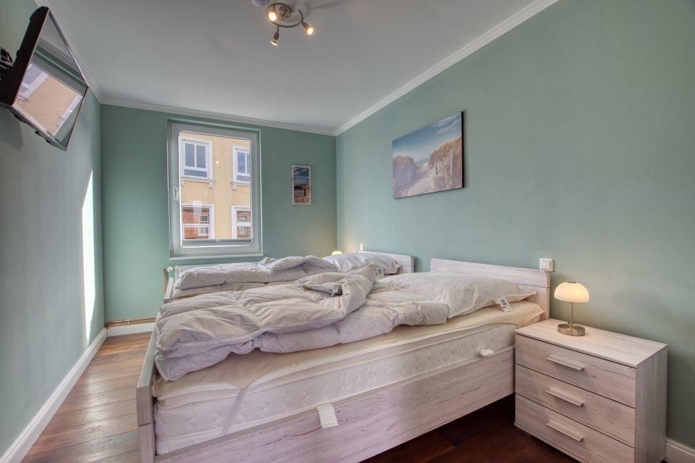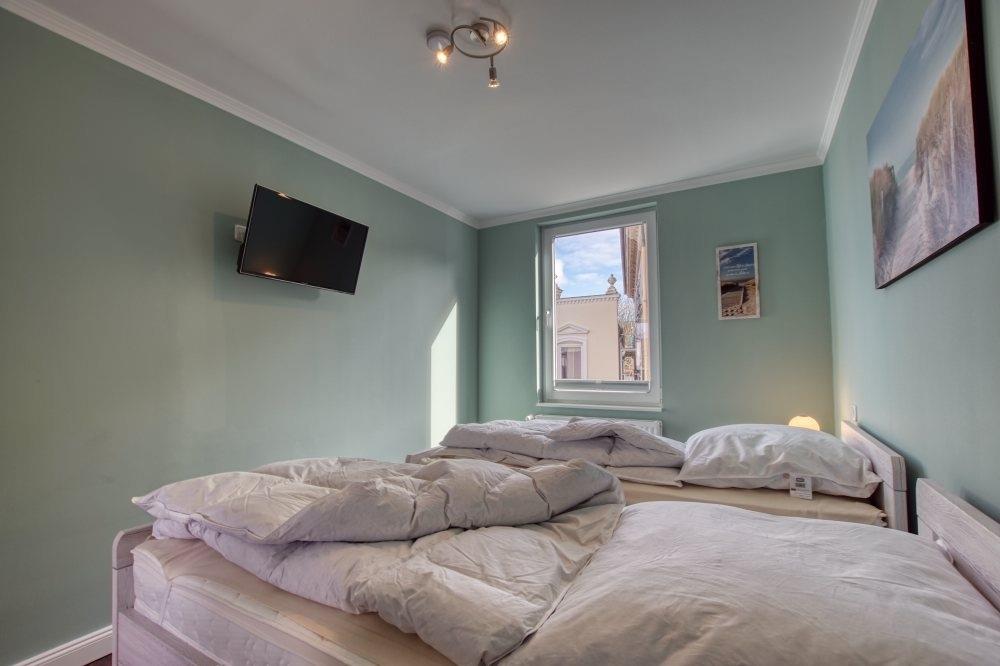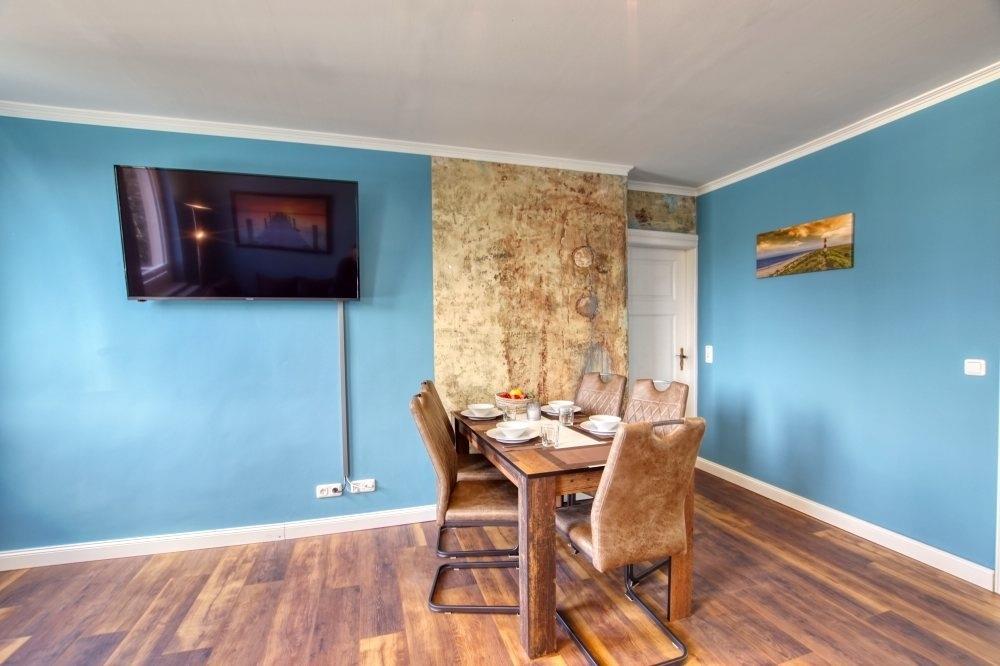 Die ca. 80?m² große Wohnung in der 1. Etage (Innenhofseite) bietet Platz für bis zu 4 Personen. Wohn-/Esszimmer mit Schlafcouch, offener Küche (Backofen, Geschirrspüler, Mikrowelle, Kaffeemaschine), Elternschlafzimmer mit Doppelbett, Kinderzimmer mit zwei Einzelbetten und TV. Modernes Bad mit Fenster. WLAN vorhanden, PKW-Stellplatz hinter dem Gebäude.