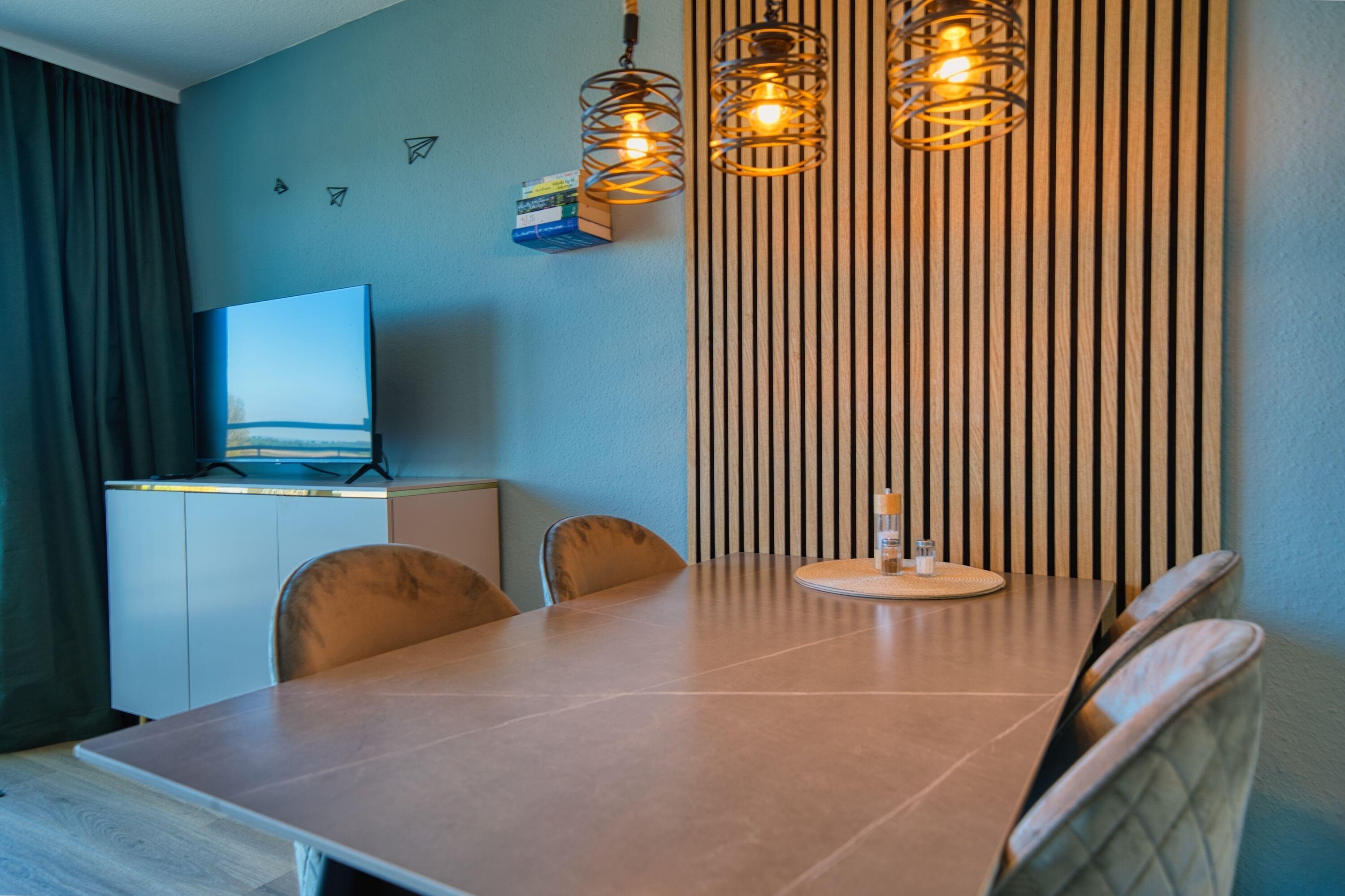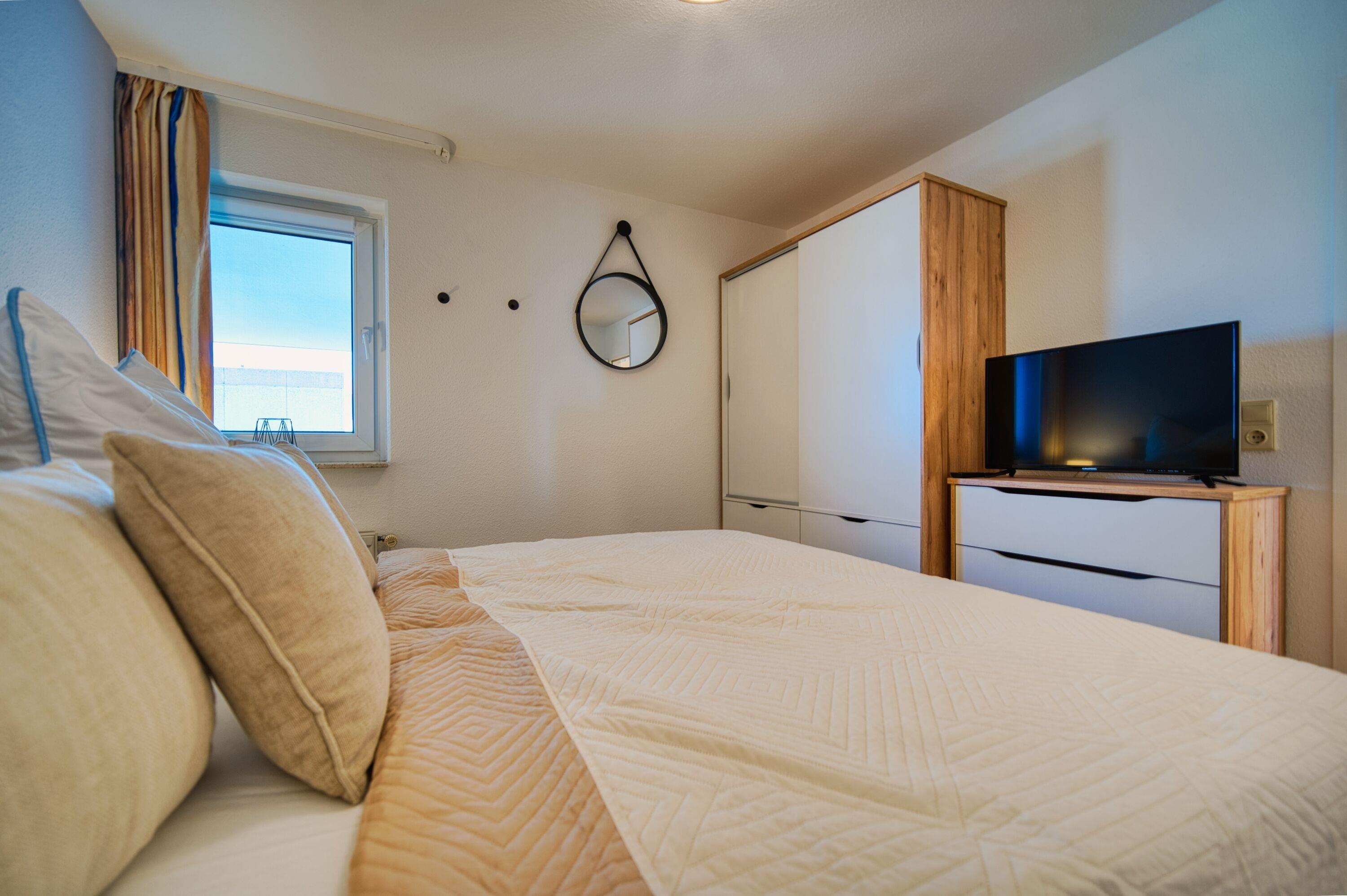 Schlafzimmer: Doppelbett, TV, Kleiderschrank; Wohnbereich: Ecksofa, Schlafsofa für 2, Flatscreen-TV