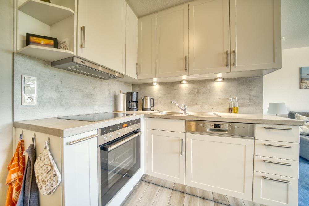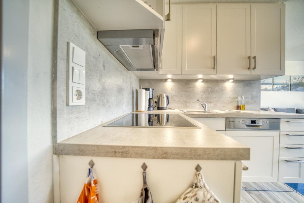 Küche: Induktionsherd, Backofen, Geschirrspüler, Mikrowelle, Kühlschrank, Kaffeemaschine, Toaster, Wasserkocher