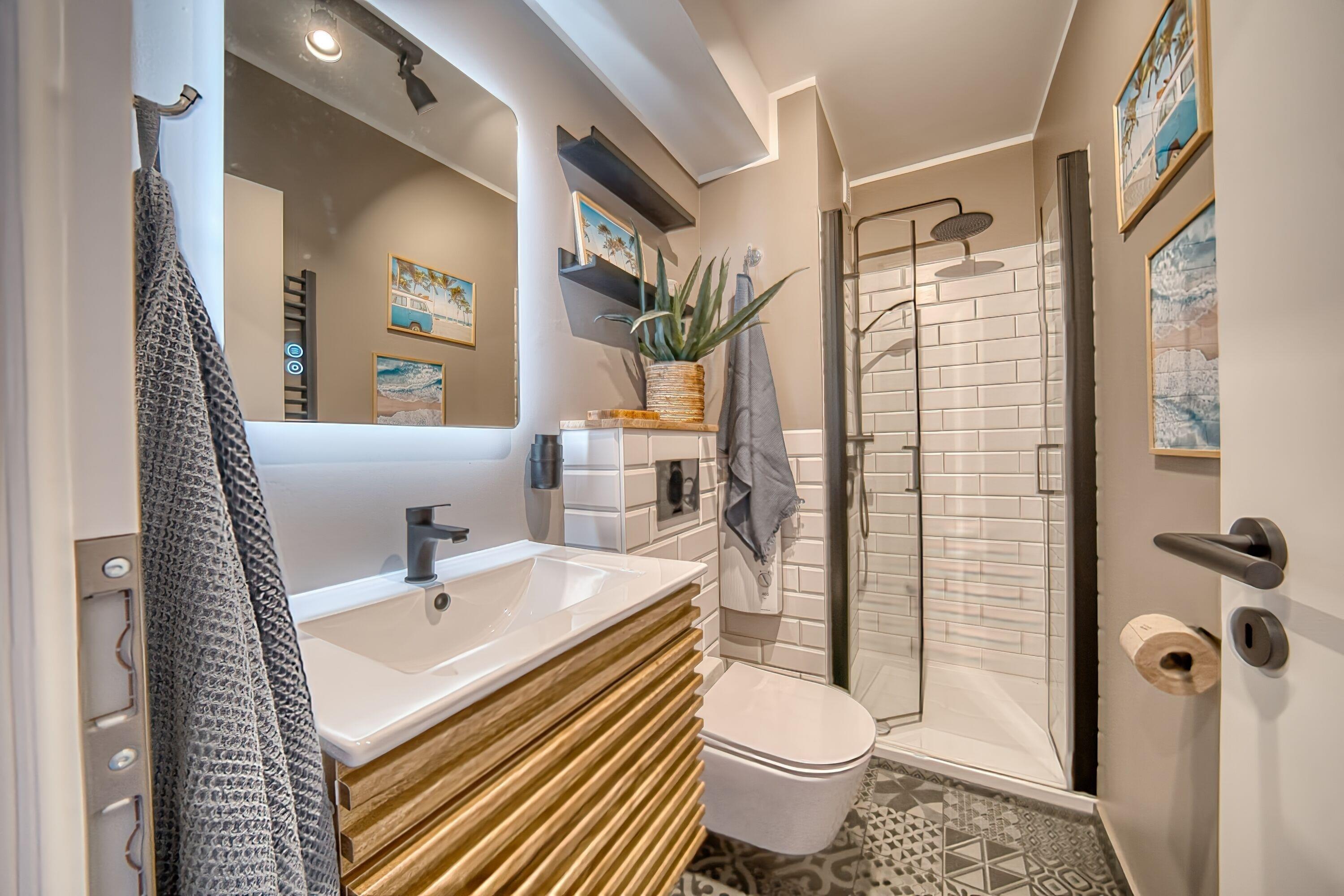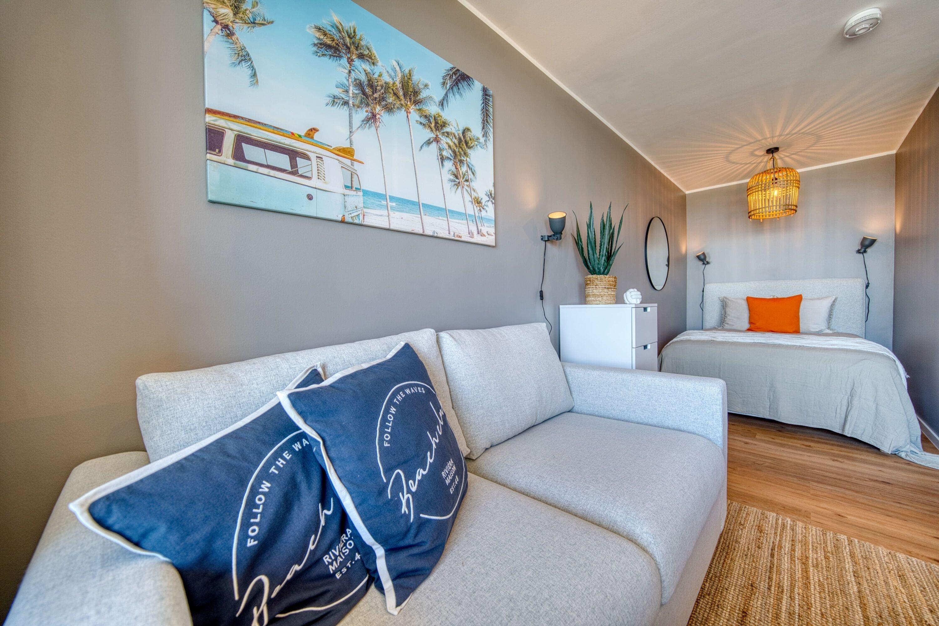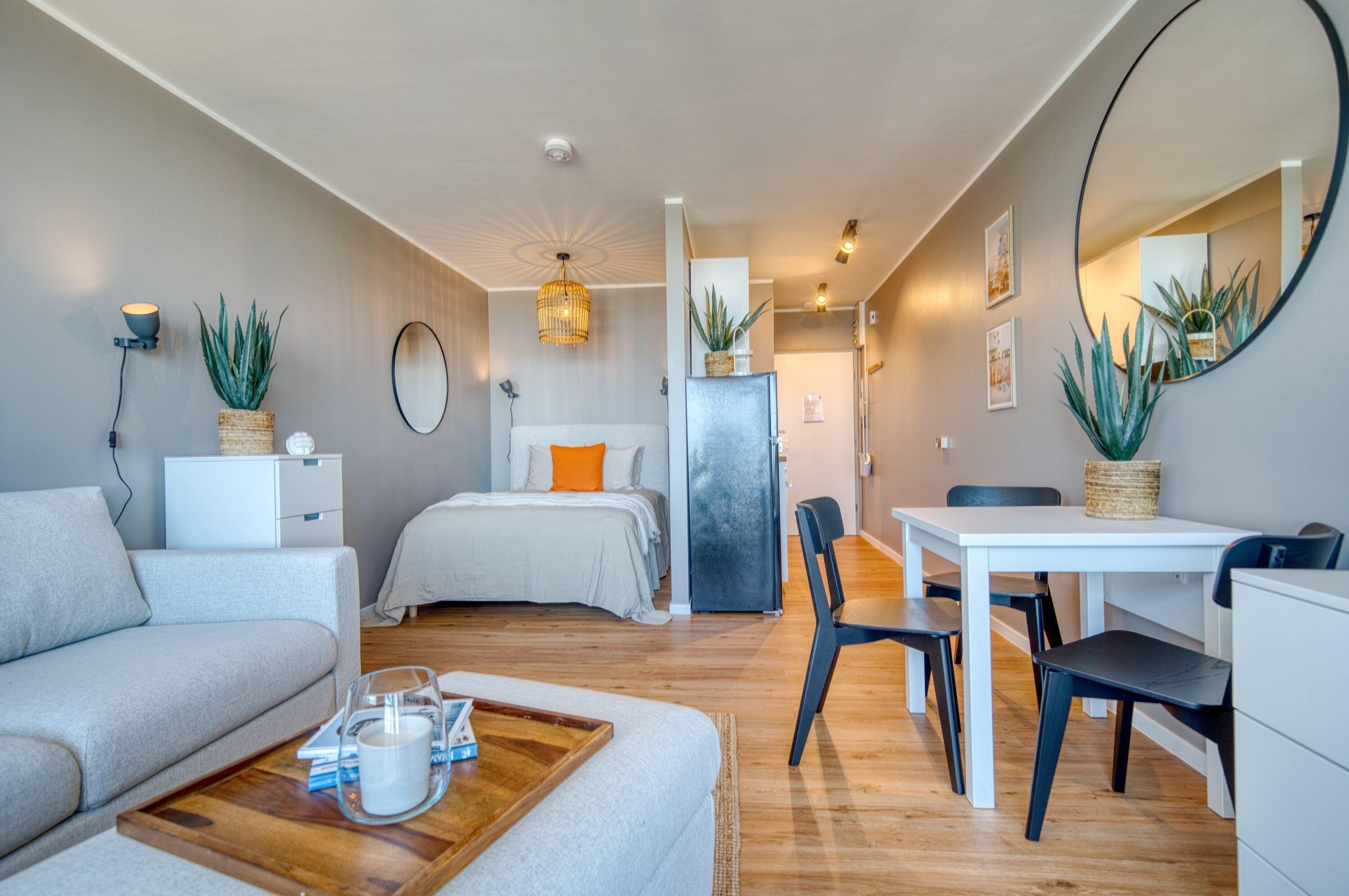 Der kombinierte Wohn-/Schlafbereich ist mit Doppelbett, Schlafcouch, Smart-TV und hochwertigem Vinylboden ausgestattet. Die moderne Küche verfügt über Kühlschrank mit Gefrierfach, Ceranherd, Backofen, Wasserkocher, Toaster und Filterkaffeemaschine. Das Bad bietet einen niedrigen Duscheinstieg und Handtuchtrockner.