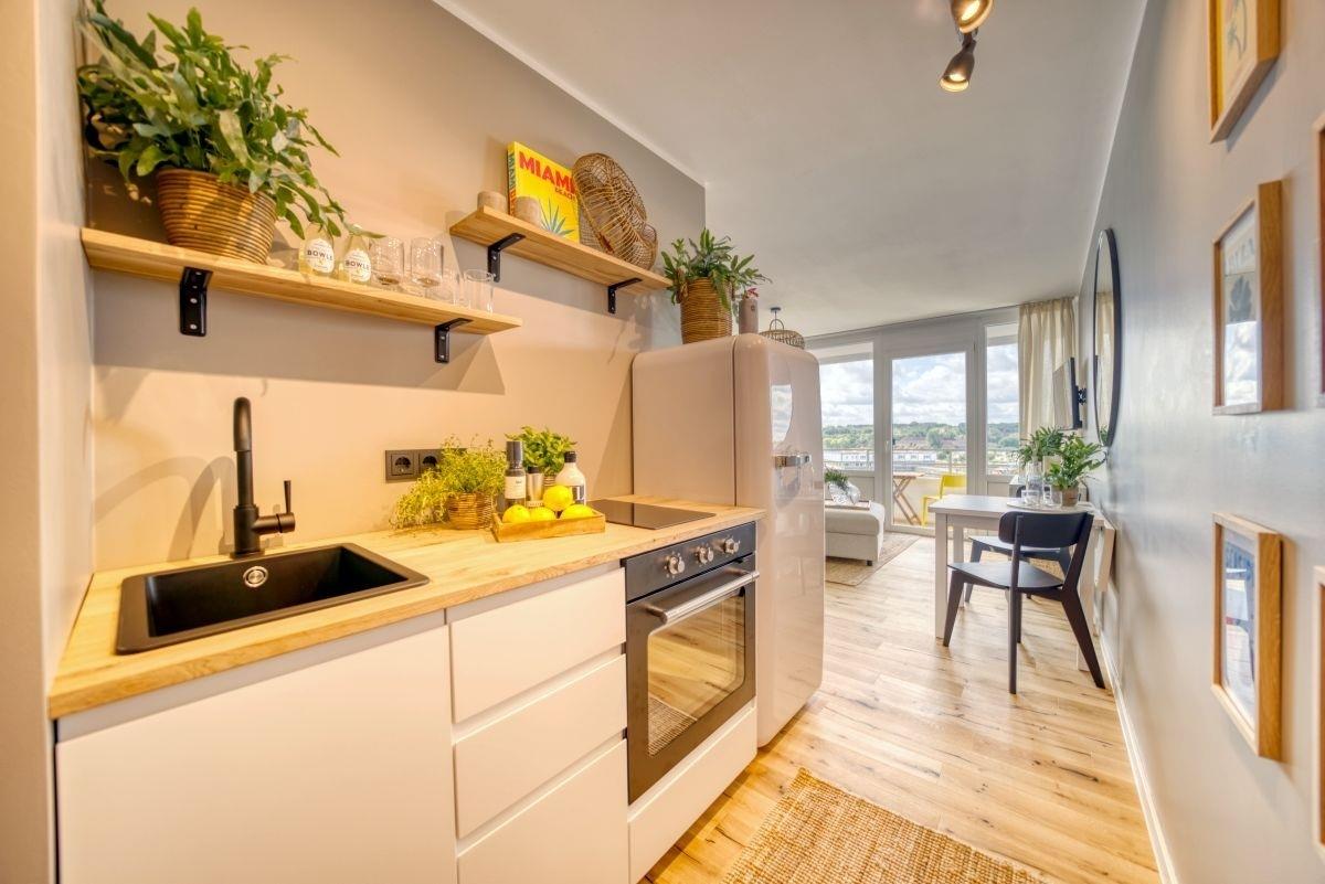 Willkommen in der modern sanierten Ferienwohnung 1SB605 im Appartementhaus „Schöne Aussicht“ in Heiligenhafen. Die ca. 30 m² große Wohnung in der 6. Etage mit seitlichem Meerblick ist ideal für Paare oder Alleinreisende und liegt nur etwa 10 Meter vom Strand entfernt.