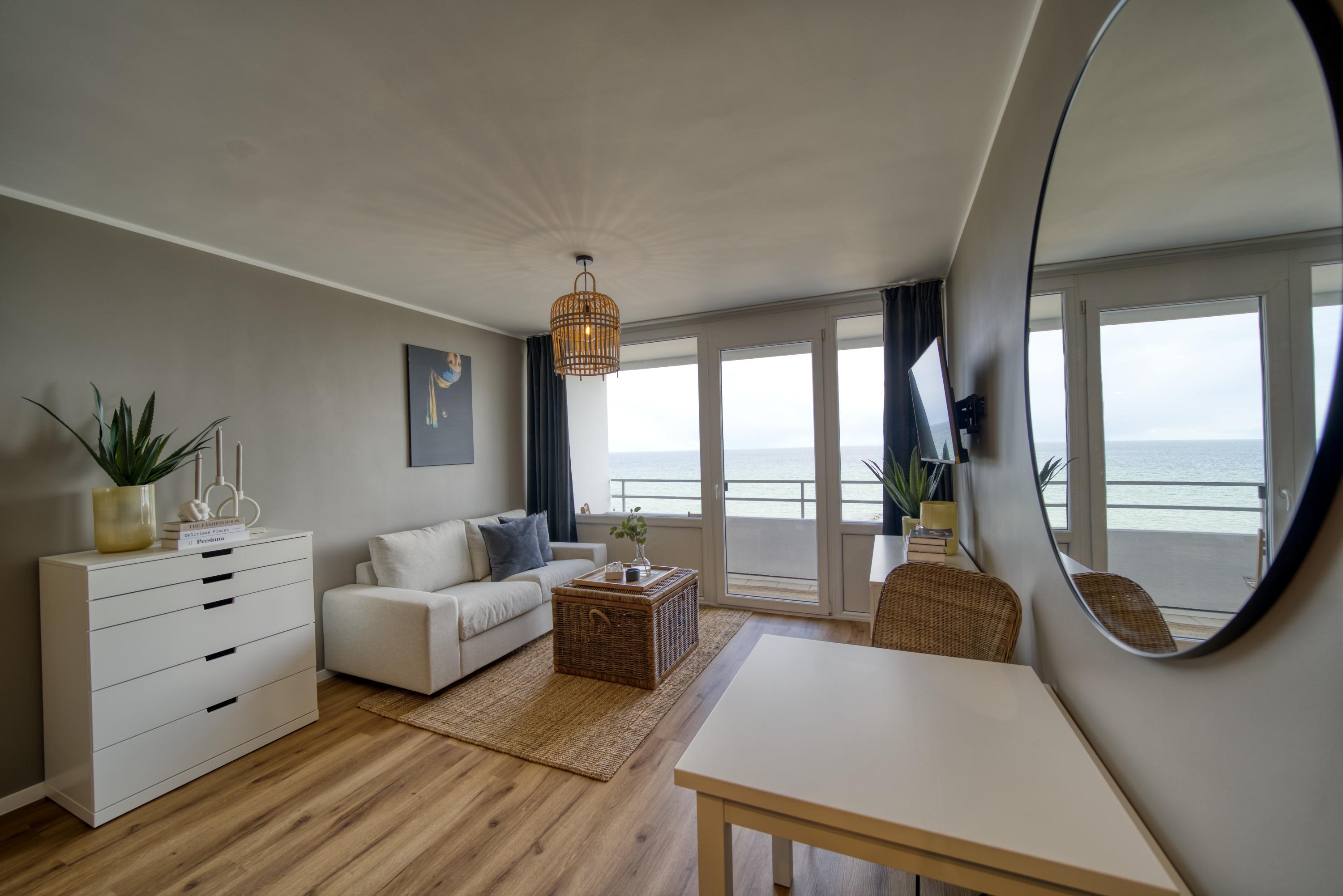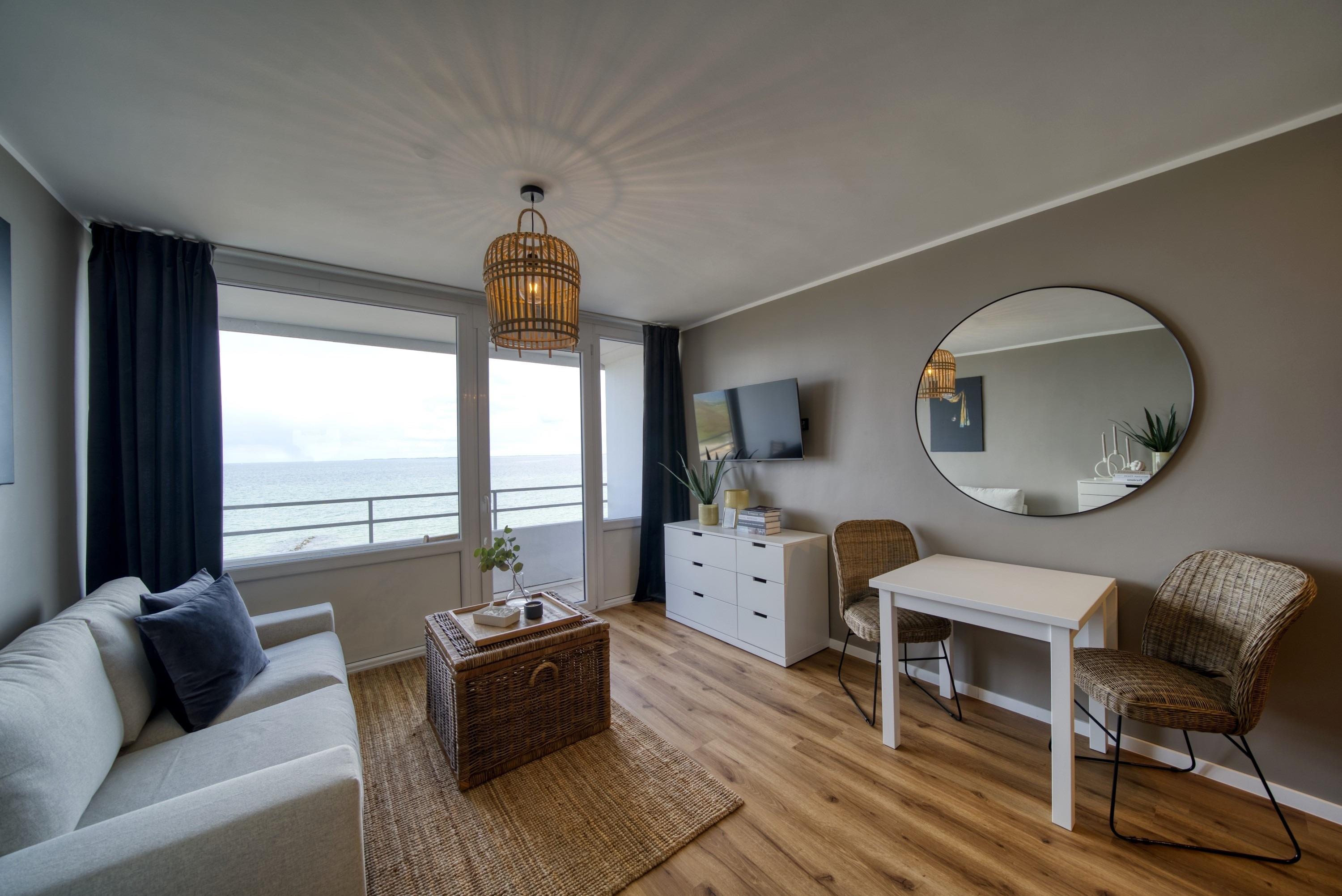 Das Haus Schöne Aussicht, App. 1SB608, liegt im obersten Stockwerk des 6-stöckigen Gebäudes auf dem Steinwarder und bietet einen beeindruckenden Panoramameerblick. Dank Fahrstuhl ist die Wohnung bequem erreichbar und Sie genießen die Nähe zum Wasser – nur ca. 10 m zum Strand.
