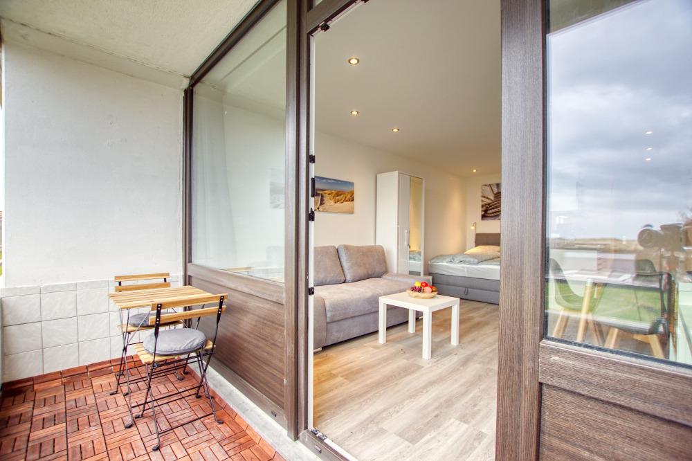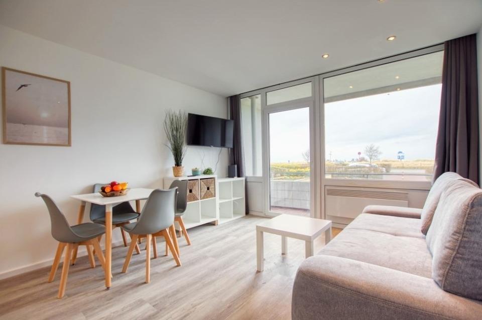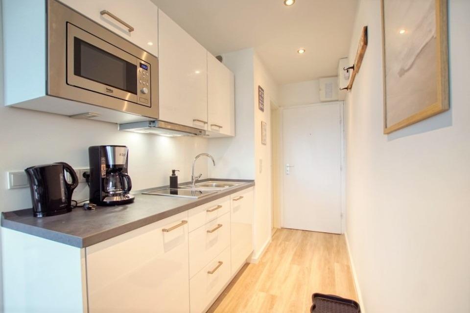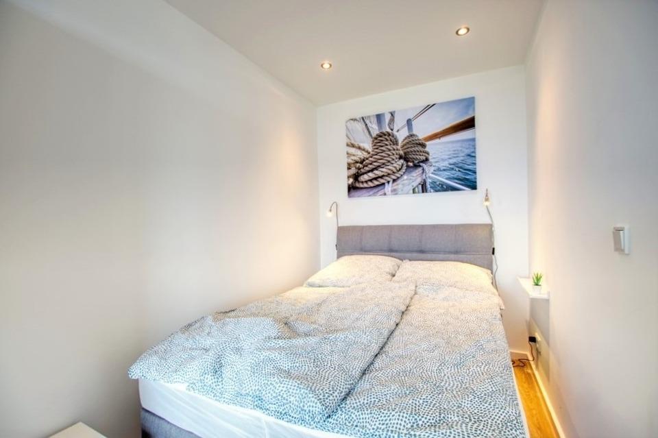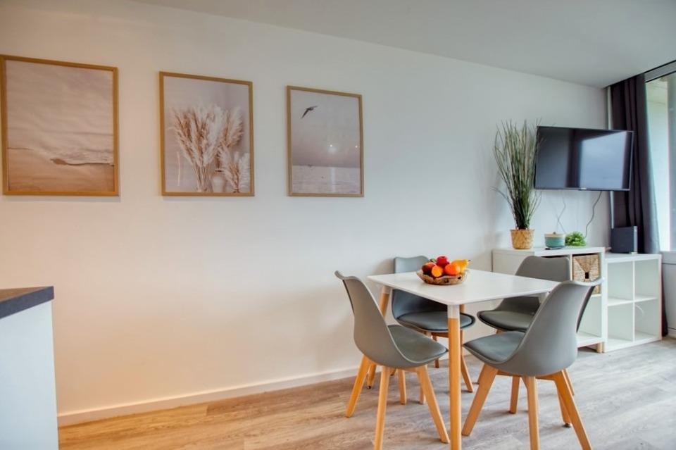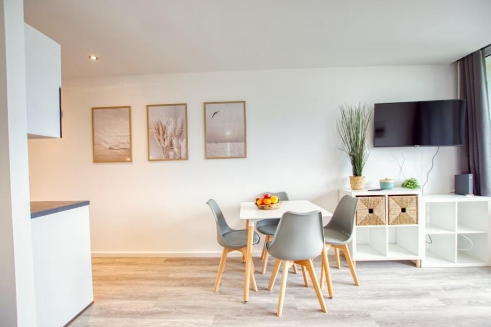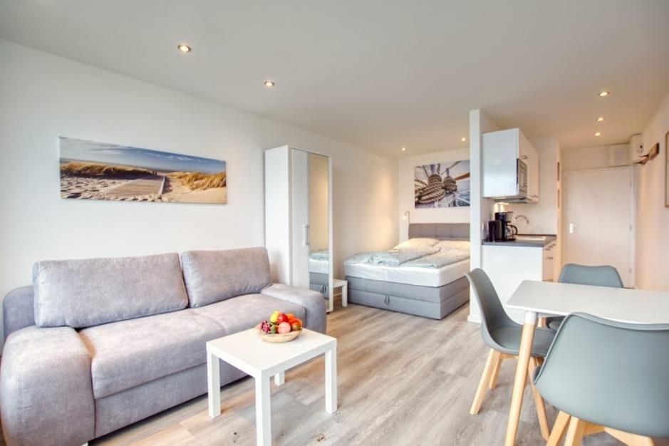 Die 30?m² große Wohnung ist ideal für bis zu 4 Personen und verfügt über einen offenen Schlafbereich mit Doppelbett, Stauraum im Bettkasten und einer umklappbaren Boxspring-Schlafcouch. Zur Ausstattung gehören eine moderne Küche mit Mikrowelle, 2-Plattenherd, Kaffeemaschine und Wasserkocher, ein saniertes Bad mit Duschkabine und Handtuchheizkörper, 42-Zoll-Smart-TV sowie WLAN.