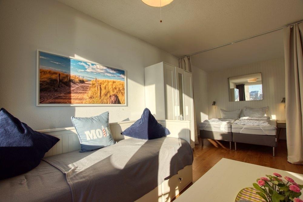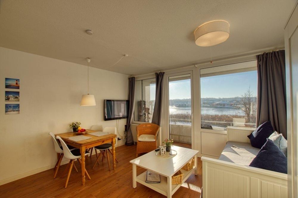 Für 2 Personen, 36?m² Wohnfläche, Wohn-Schlafbereich mit Doppelbett (Vorhang) und Sofalandschaft mit Schlaffunktion, großer Flachbild-TV, WLAN inklusive. Balkon mit Binnenseeblick. Voll ausgestattete Küche mit Ceranherd, Kühlschrank, Filterkaffeemaschine, Toaster, Wasserkocher. Badezimmer mit niedrigem Duscheinstieg und Handtuchtrockner. Fahrstuhl, eigener Pkw-Stellplatz, gemeinschaftlicher Fahrradkeller. Elektroheizung sorgt für angenehme Temperaturen. Haustiere willkommen. Strand nur wenige Meter entfernt – ideal für entspannte Ostseeferien.