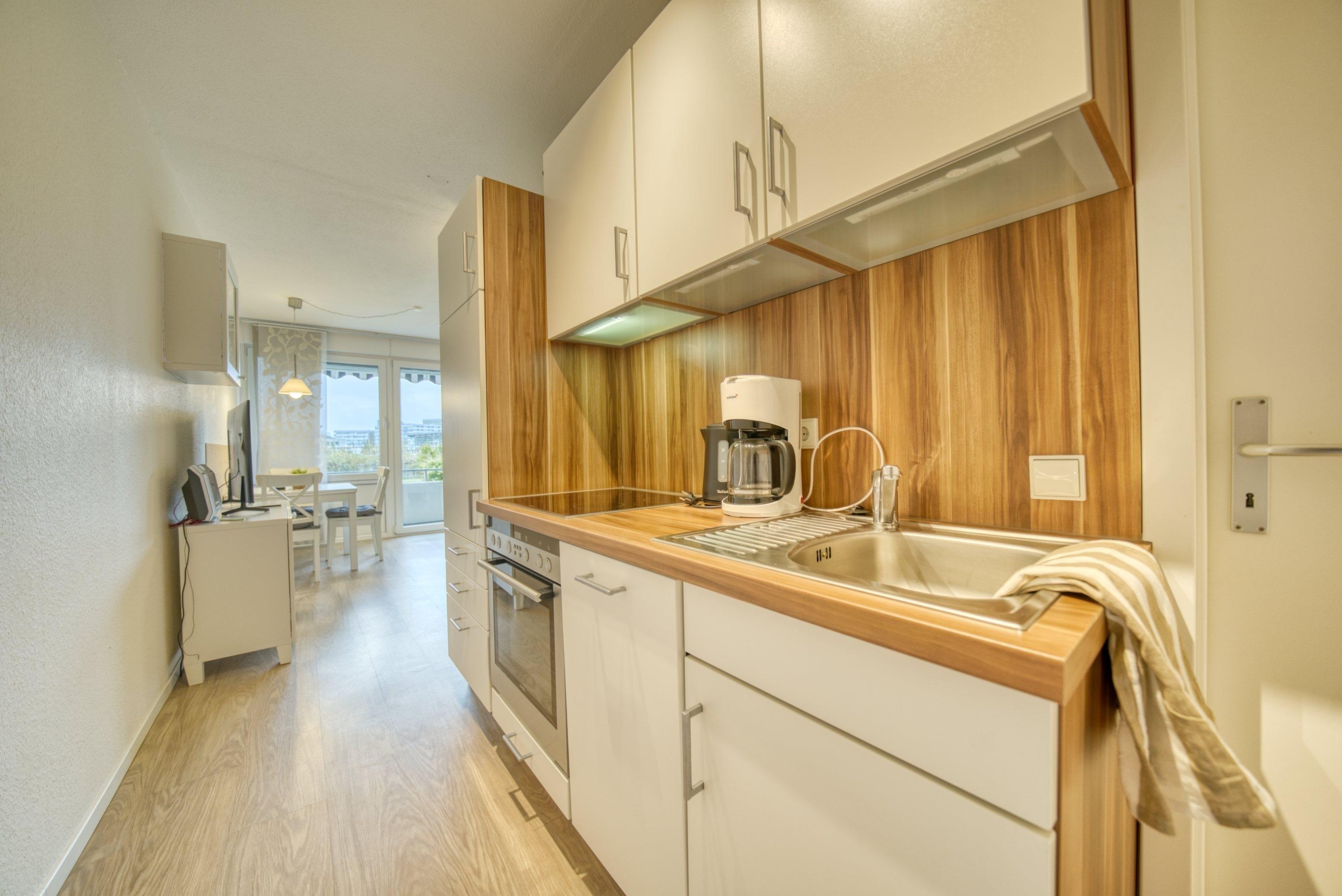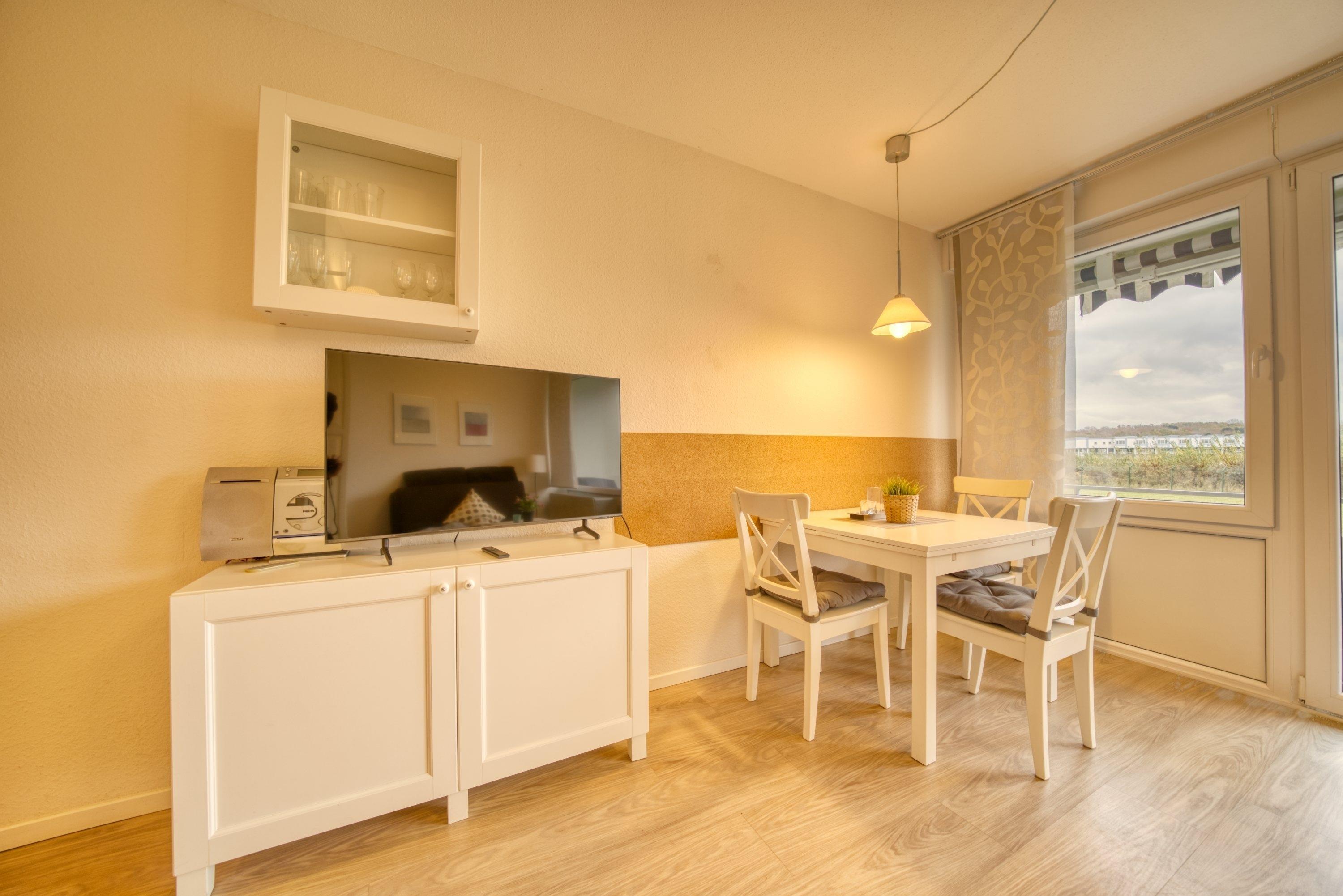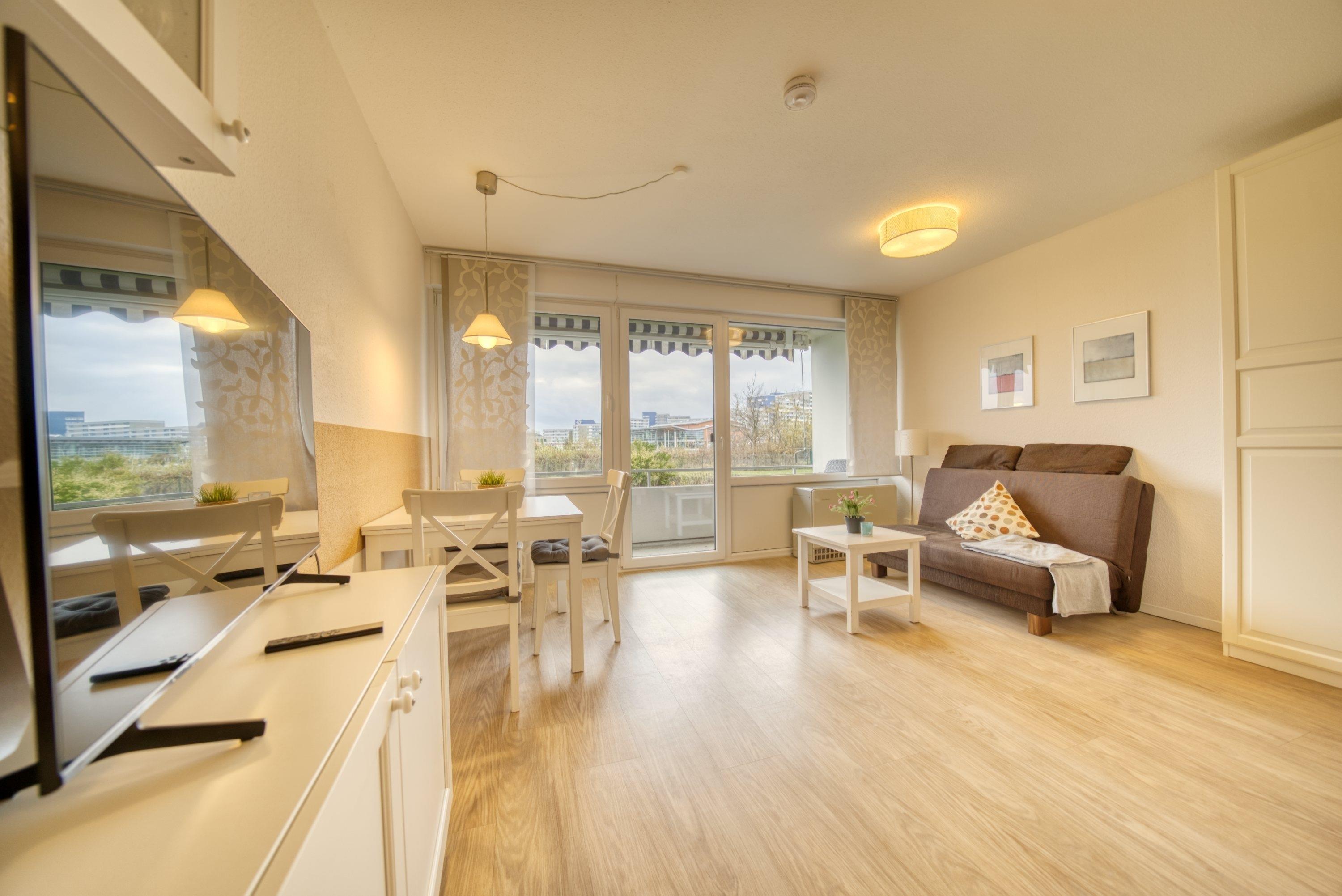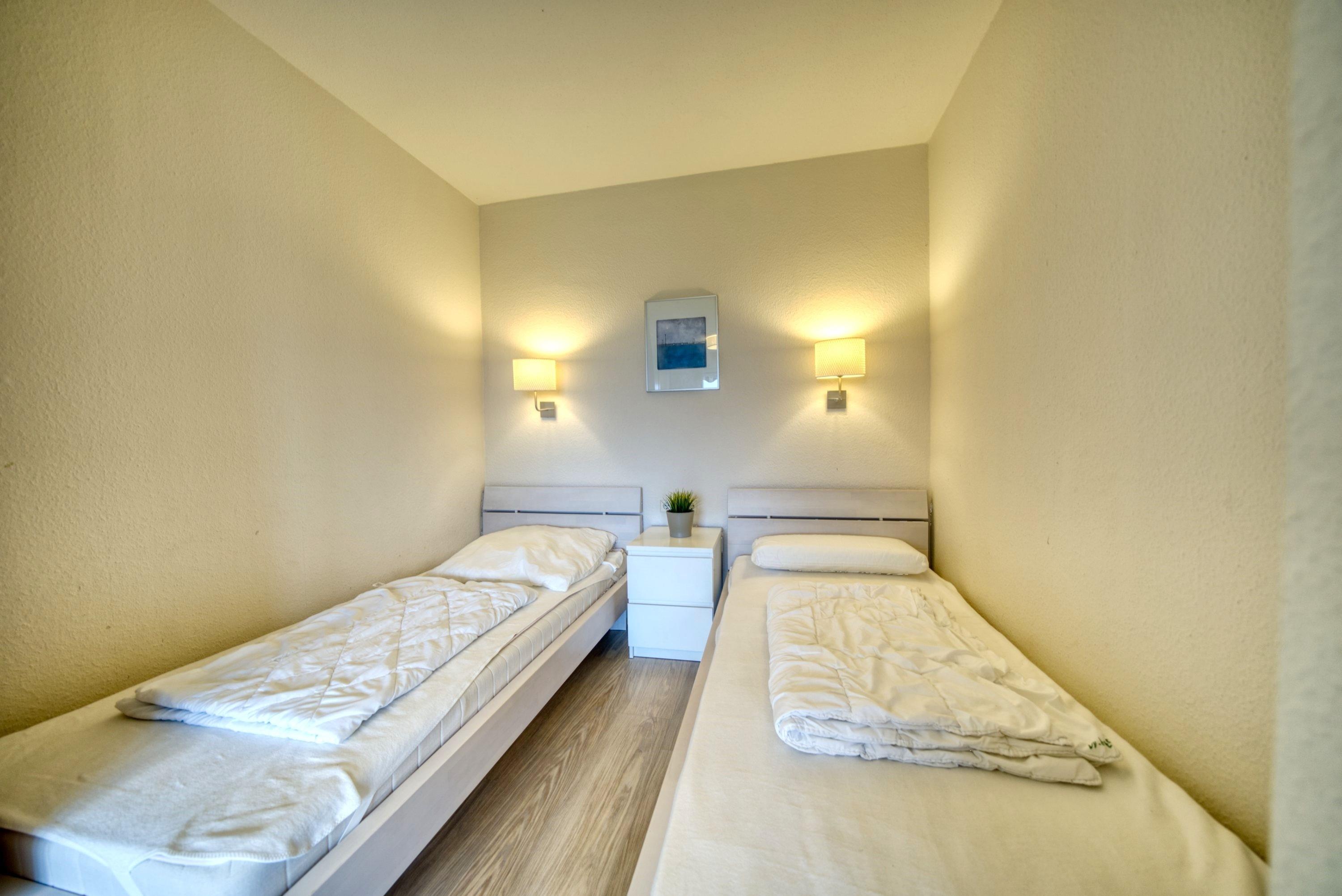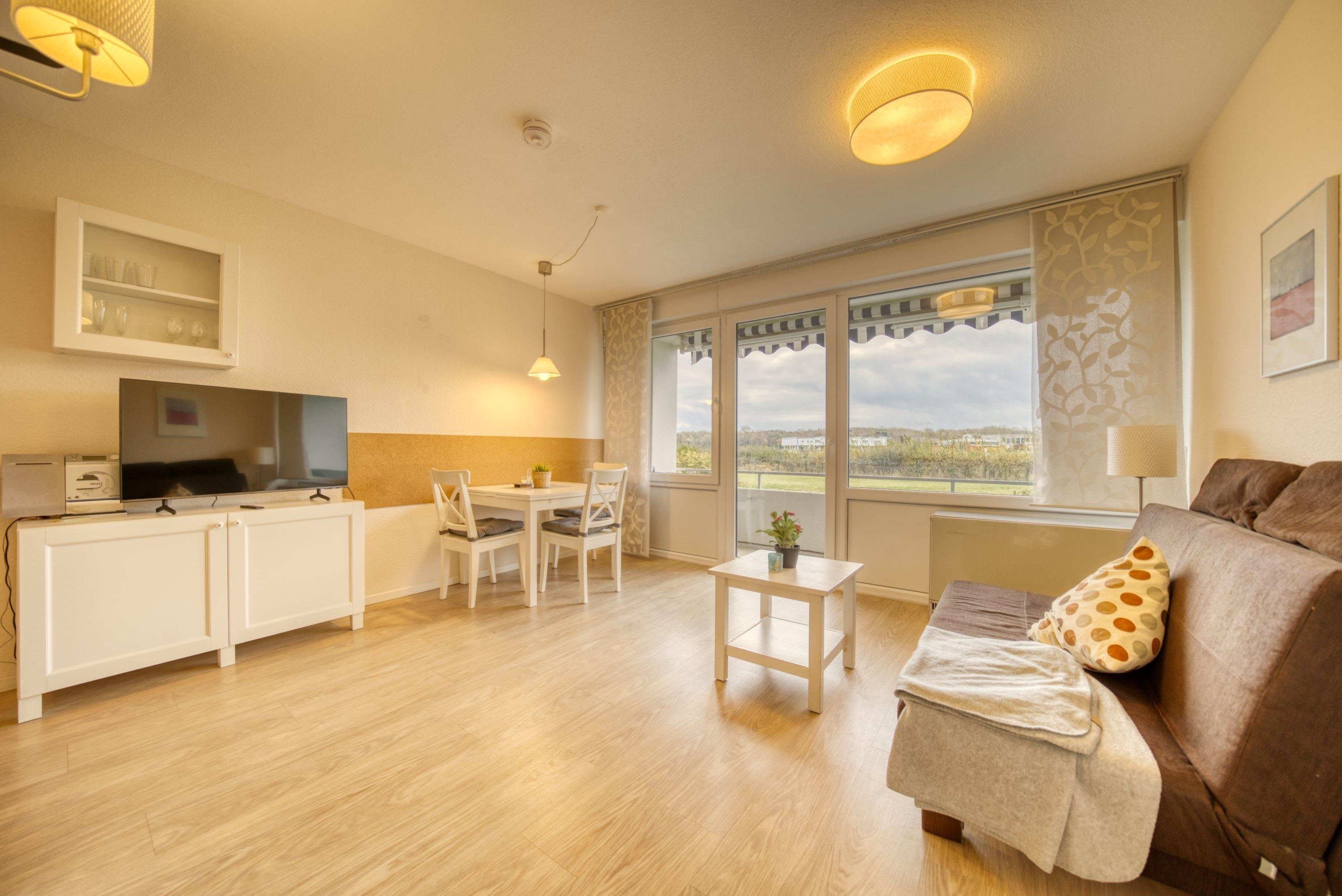 Die 36?m² große Nichtraucherwohnung für bis zu 2 Personen verfügt über Wohnbereich mit Sofa und TV, Schlafbereich mit zwei Einzelbetten (abtrennbar), modernisierte Küche mit Backofen, Geschirrspüler, Wasserkocher und Kaffeemaschine sowie Bad mit Duschvorhang und niedrigem Einstieg. Eigener Pkw-Stellplatz und gemeinschaftlicher Fahrradkeller sind vorhanden. Haustiere nicht erlaubt. Strand ca. 10?m, Ferienpark ca. 5?Gehminuten. Ideal für Paare, die Binnenseeblick, moderne Ausstattung und Strandnähe schätzen.