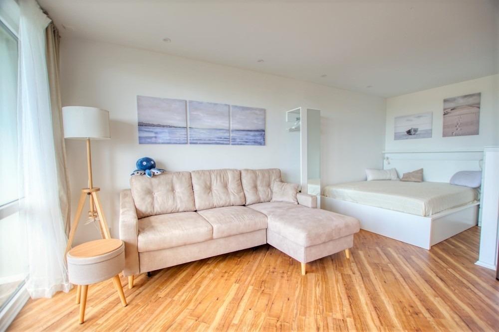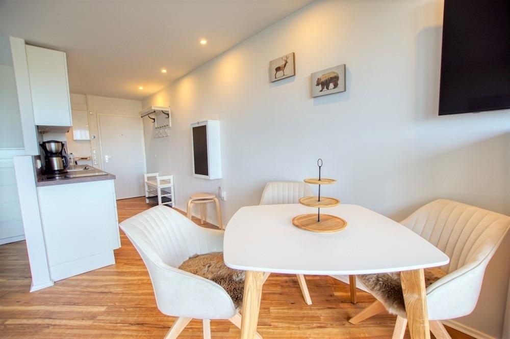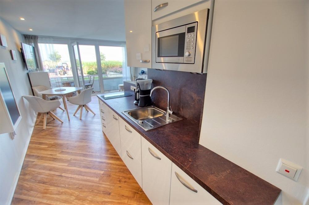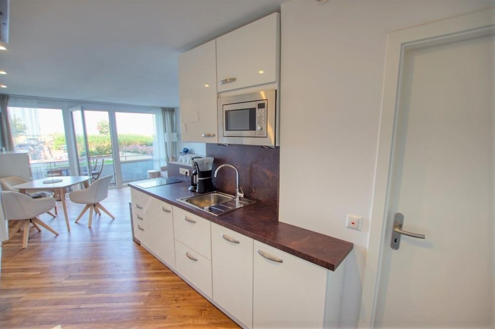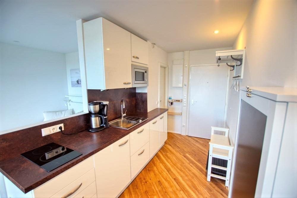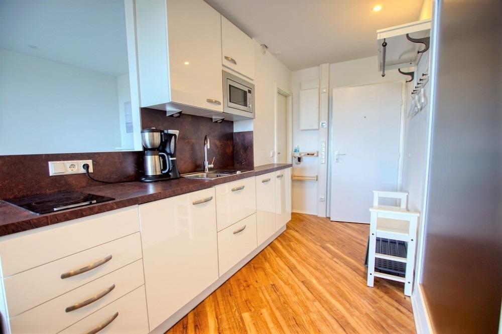 Die 36?m² große Nichtraucherwohnung für bis zu 3 Personen verfügt über Wohn-/Schlafbereich mit Doppelbett, Ecksofa mit Schlaffunktion, Flachbild-TV, Vinylboden und Fußbodenheizung. Die Küche ist ausgestattet mit 2-Platten-Herd, Kühlschrank, Mikrowelle mit Grillfunktion, Geschirrspüler und Kaffeemaschine. Modernisiertes Duschbad vorhanden. Balkon mit Ostseeblick, gemeinschaftlicher Fahrradkeller. Haustiere nicht erlaubt, kein WLAN. Strand ca. 10?m, Ferienpark ca. 5?Gehminuten. Perfekt für Paare oder kleine Familien, die Strandblick, moderne Ausstattung und Komfort schätzen.