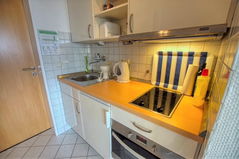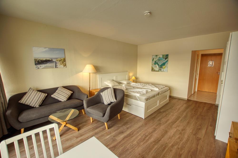 Wohn-/Schlafzimmer mit Doppelbett, Sofa und Sessel, Flachbild-TV und Esstisch. Küche mit 2-Kochfeldern, Backofen, Kühlschrank, Mikrowelle, Toaster, Wasserkocher und Filterkaffeemaschine. Badezimmer mit Duschkabine und WC. WLAN inklusive. Nichtraucherwohnung, Haustiere erlaubt, Fahrstuhl im Gebäude, Pkw-Stellplatz nach Verfügbarkeit. Direkte Strandlage, Restaurants, Cafés und Geschäfte fußläufig erreichbar, Yachthafen und Innenstadt ca. 2,5 km.