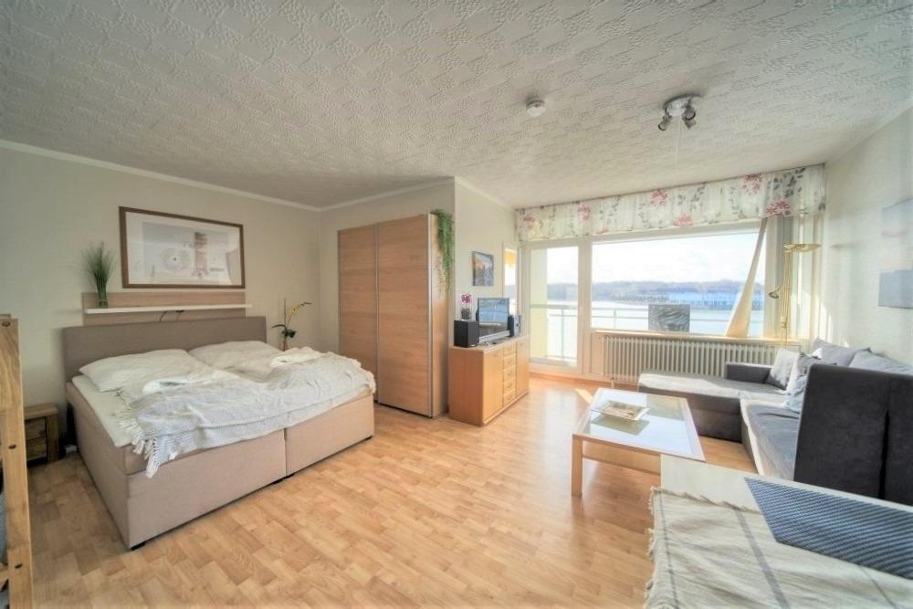 Wohn-/Schlafbereich mit Doppelbett, separates Schlafzimmer mit zwei Einzelbetten, Laminatboden, Balkon mit Blick auf den Binnensee, WLAN inklusive.