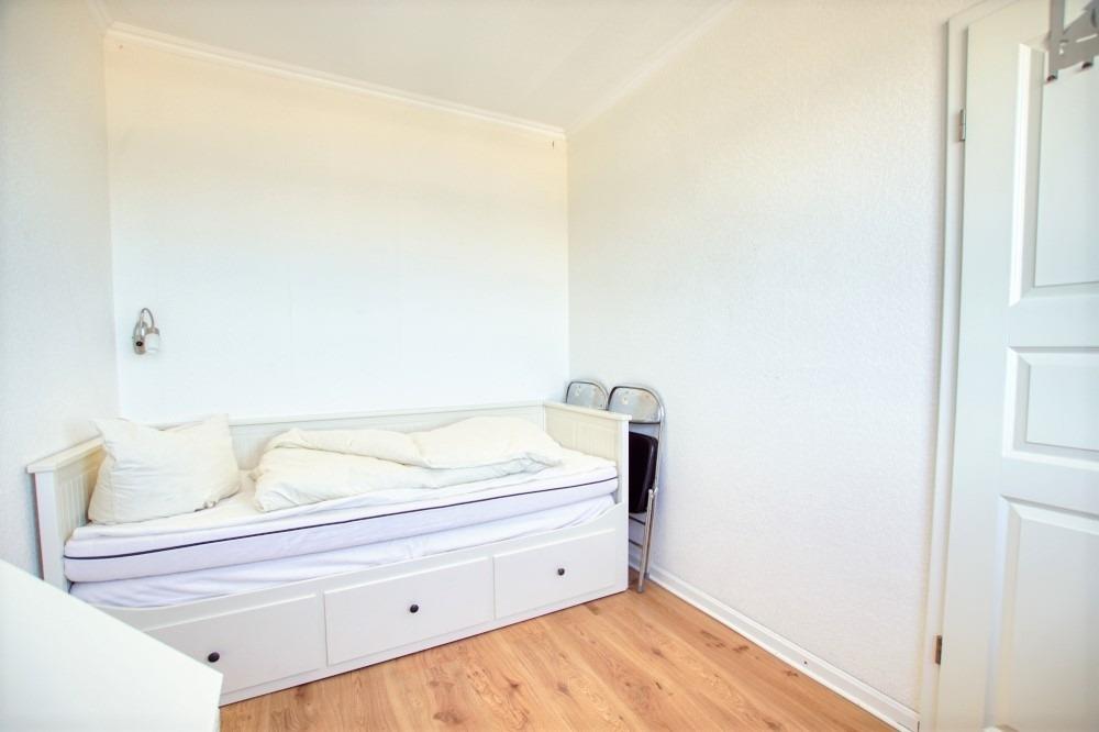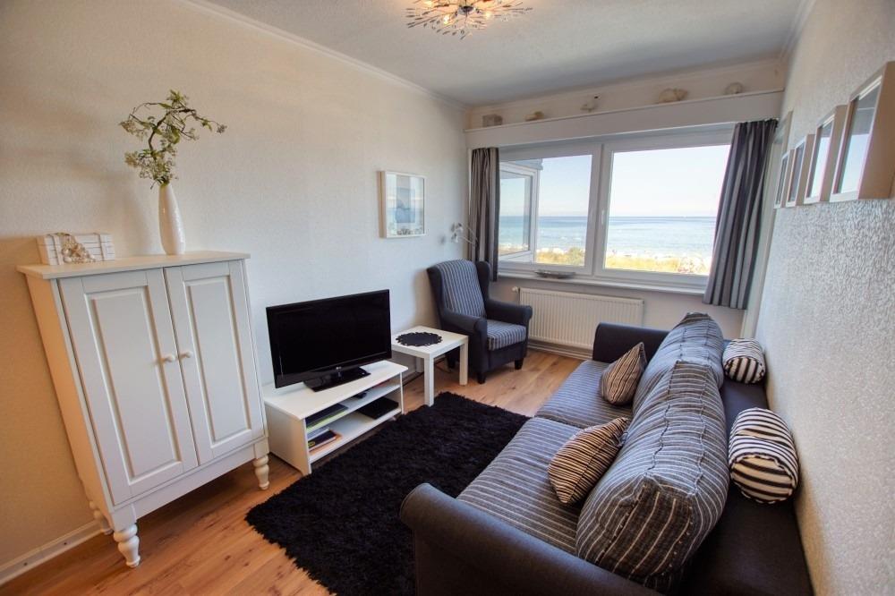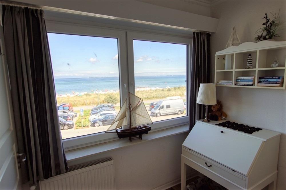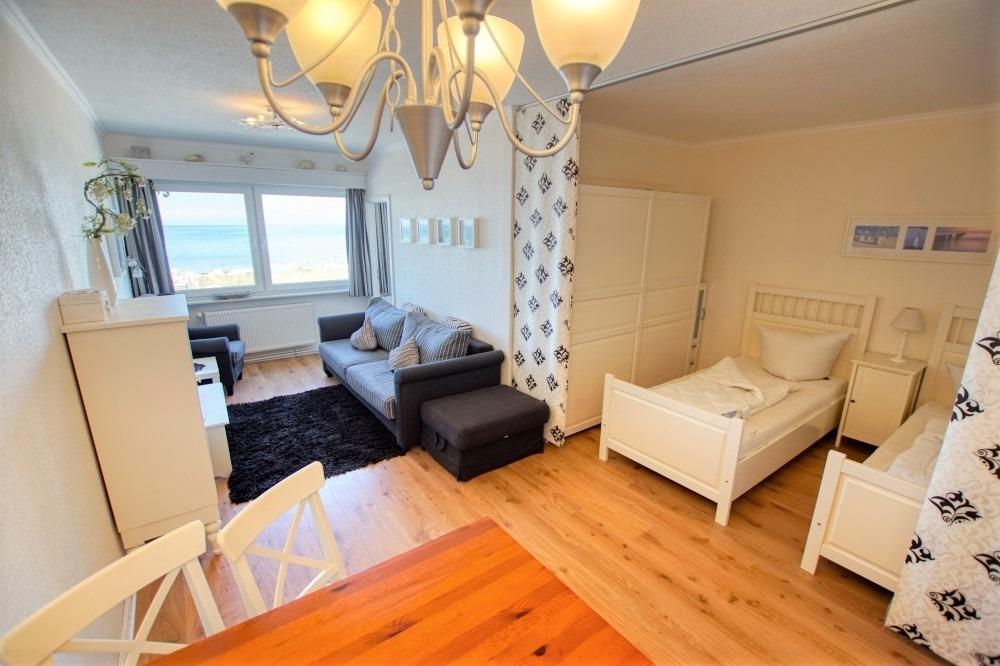 Wohnfläche ca. 41?m² für bis zu 5 Personen. 2. Geschoss mit Ostseeblick. Wohn-/Schlafbereich: Einzelbetten, Schlafcouch, Sessel, Flachbild-TV. Küche: 4-Platten-Ceranherd, Kühlschrank. Badezimmer: WC mit Duschkabine. Kinderzimmer mit Ausziehbett und Meerblick. Mückenschutz vorhanden.