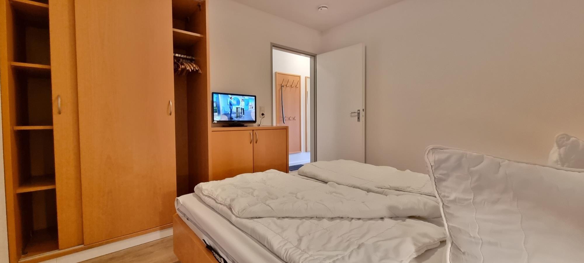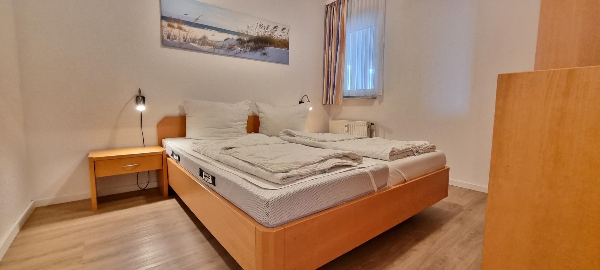 Das separate Schlafzimmer ist mit einem komfortablen Doppelbett und einem geräumigen Kleiderschrank ausgestattet, sodass erholsame Nächte garantiert sind. Der helle Wohnbereich verfügt über ein bequemes Schlafsofa, ideal für eine zusätzliche Person oder gemütliche Fernsehabende. Ein Flachbild-TV sorgt für Unterhaltung und entspannte Stunden nach einem Tag am Strand.