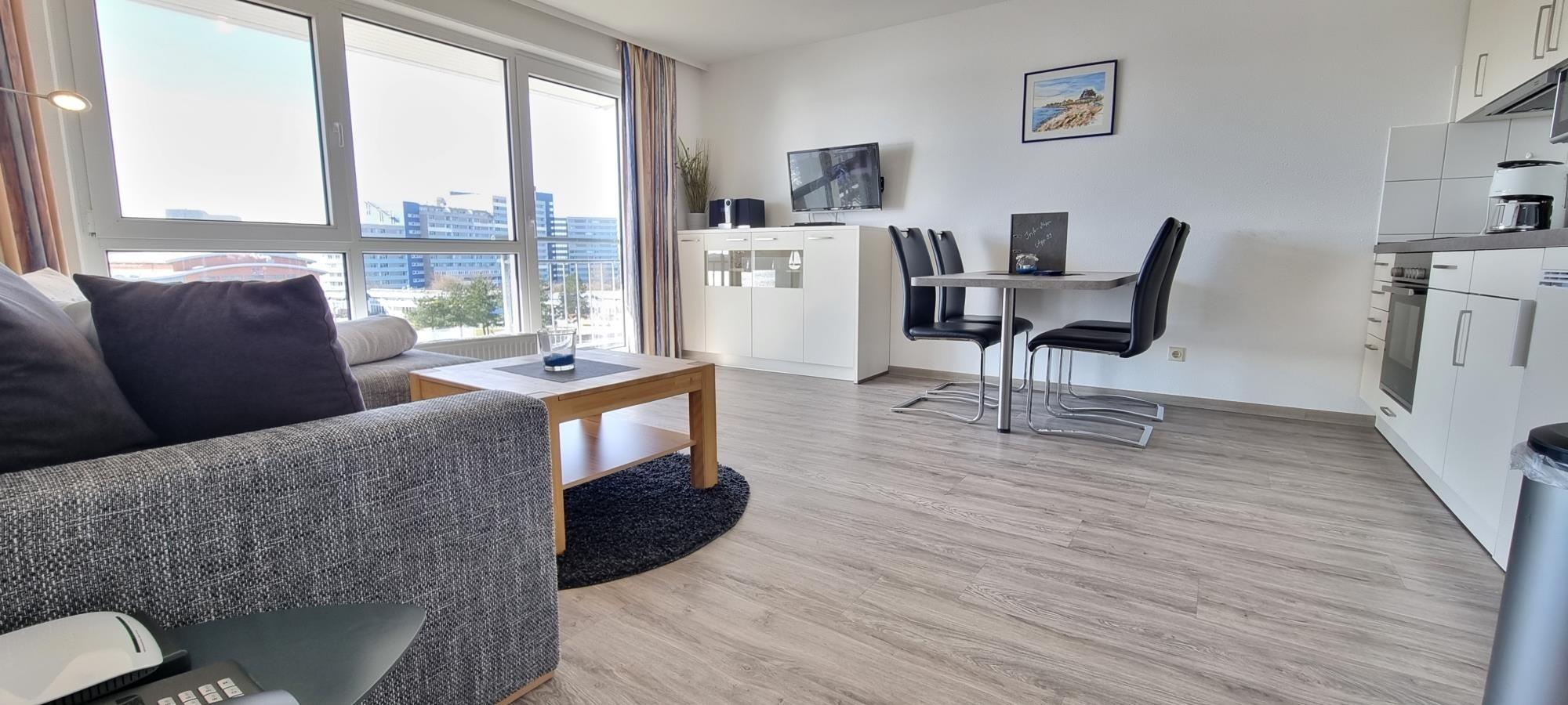 Das separate Schlafzimmer ist mit einem komfortablen Doppelbett (zwei Einzelmatratzen à 80 cm) ausgestattet und bietet beste Voraussetzungen für erholsame Nächte. Der helle Wohnbereich mit integrierter Küchenzeile schafft ein offenes Wohngefühl und lädt zum Verweilen ein. Die Küche ist funktional ausgestattet und ideal für Selbstversorger, die auch im Urlaub flexibel bleiben möchten.