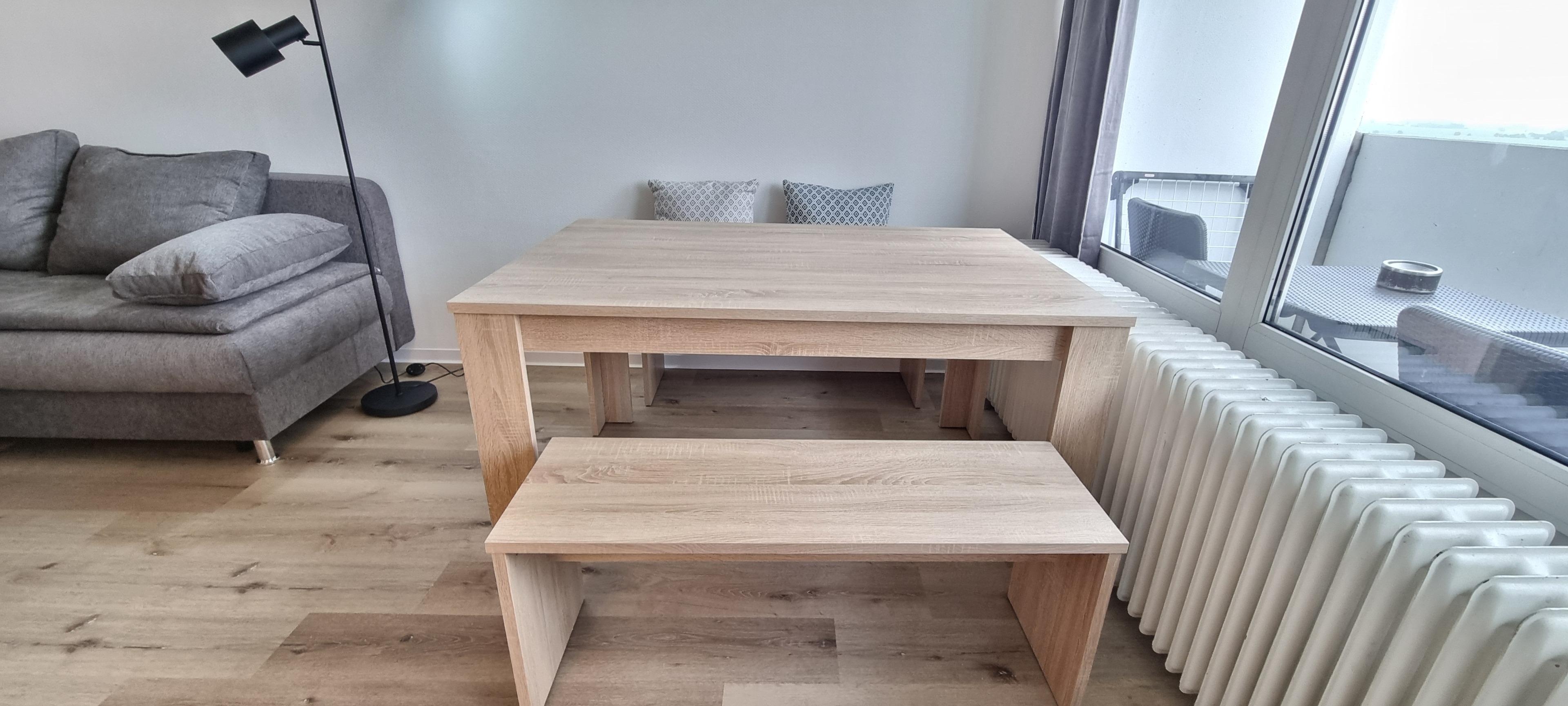 Ein separater Essbereich mit stilvoller Sitzbank schafft den perfekten Ort für gemeinsame Mahlzeiten oder gesellige Abende. Die gut ausgestattete Küchenzeile ermöglicht Ihnen eine flexible Selbstverpflegung und ist praktisch sowie modern eingerichtet – ideal für einen unabhängigen Urlaub an der Ostsee.
