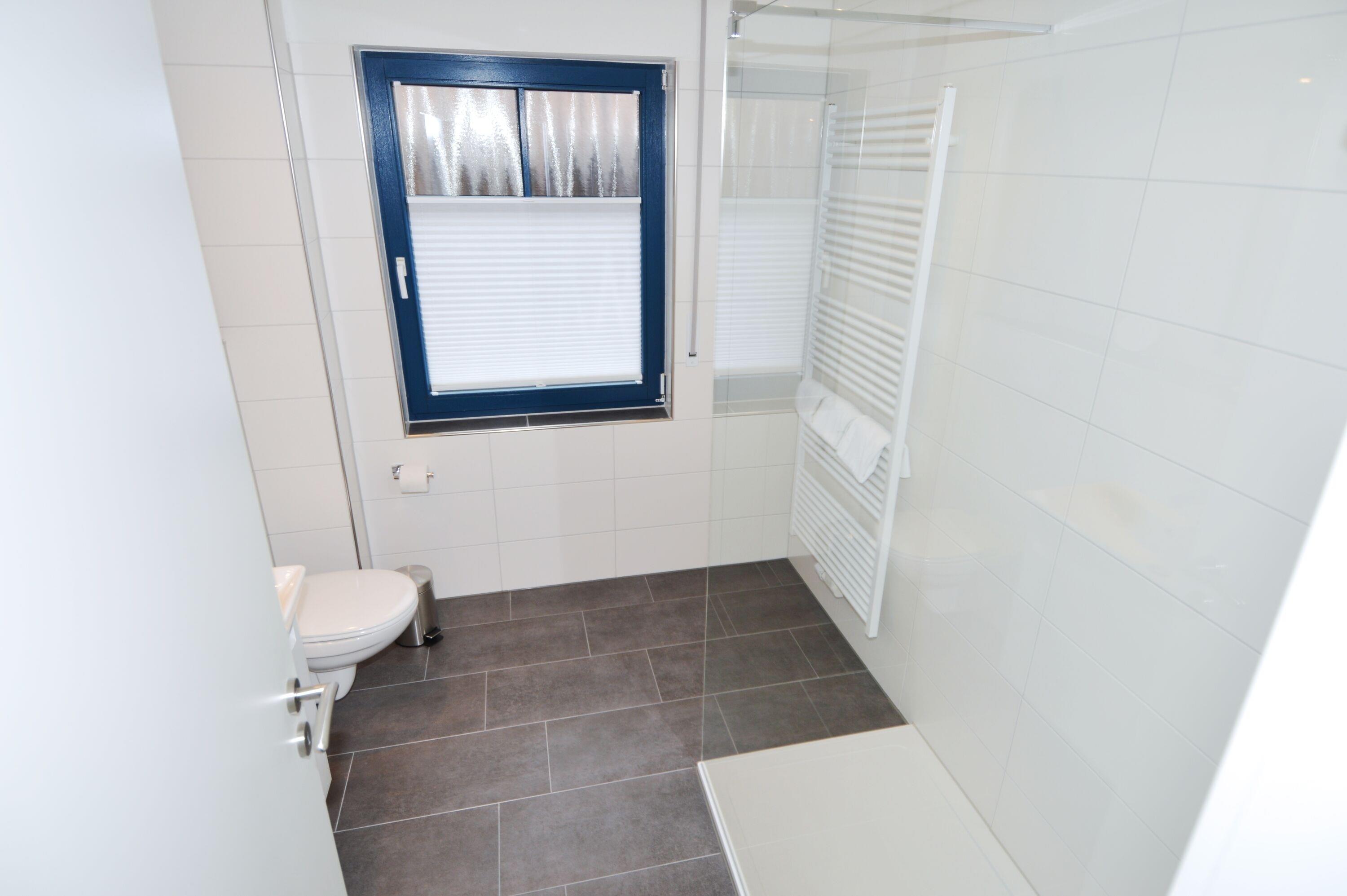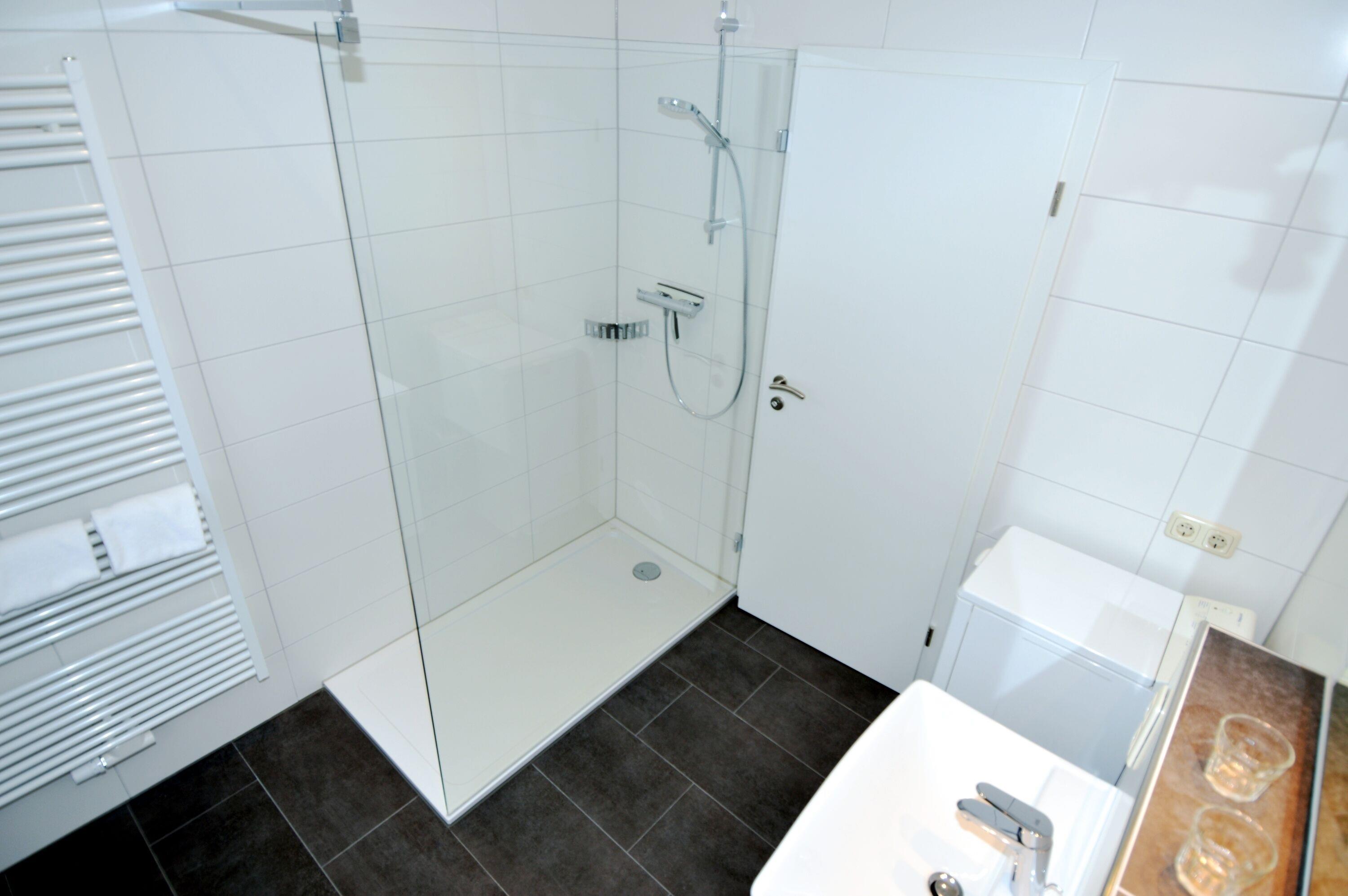 Das Bad präsentiert sich modern und komfortabel. Es verfügt über eine ebenerdige Dusche, WC, Waschbecken sowie eine Waschmaschine. Hier starten Sie erfrischt in den Tag oder entspannen nach einem erlebnisreichen Urlaubstag.