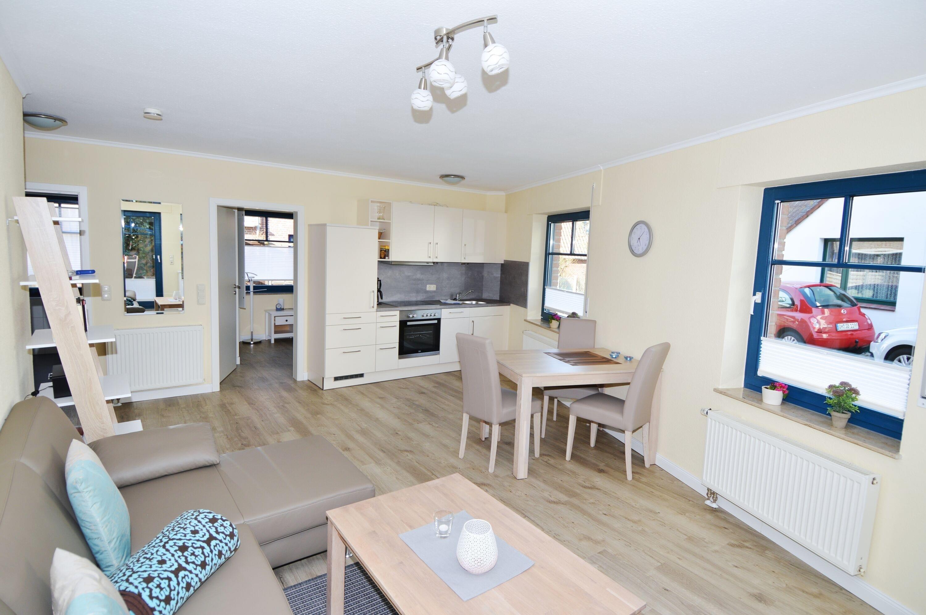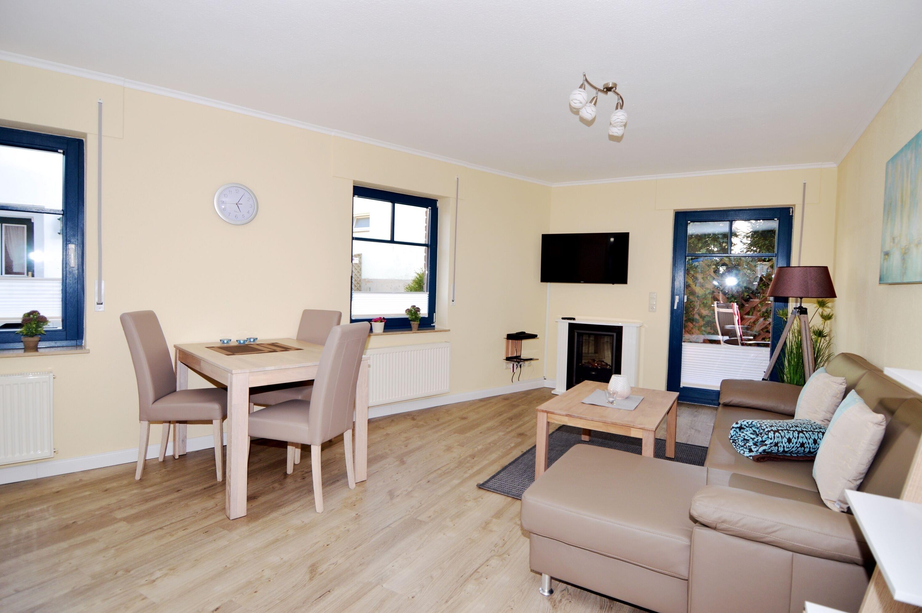 Herzstück der Wohnung ist der offene und einladende Wohnbereich. Hier können Sie auf der gemütlichen Sitzlandschaft entspannen oder den Urlaubstag in ruhiger Atmosphäre ausklingen lassen. Der Elektrokamin sorgt besonders an kühleren Tagen für behagliche Stunden und unterstreicht das wohnliche Ambiente. Große Fenster lassen viel Tageslicht herein und schaffen eine helle, freundliche Atmosphäre. Von hier aus gelangen Sie direkt auf die kleine, möblierte Terrasse, auf der Sie Ihr Frühstück an der frischen Luft oder einen entspannten Kaffee genießen können. WLAN steht selbstverständlich zur Verfügung, sodass Sie auch im Urlaub online bleiben oder Ihre Lieblingsserien streamen können.