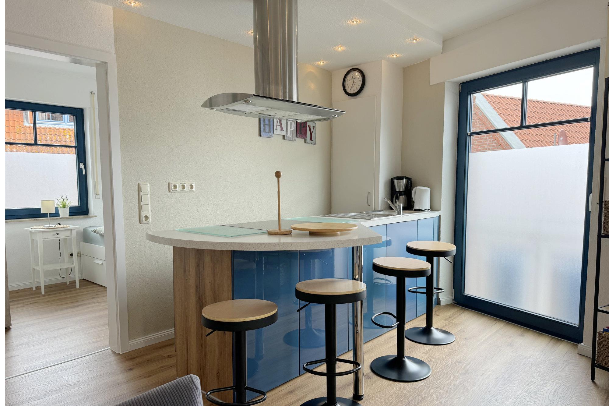 Der helle und freundlich gestaltete Wohnbereich bildet das Herzstück der Wohnung. Hier können Sie entspannte Stunden verbringen und den Urlaubstag in Ruhe ausklingen lassen. Direkt angeschlossen befindet sich der Wintergarten, der viel Tageslicht hereinlässt und zu gemütlichen Momenten bei jeder Wetterlage einlädt – ein schöner Ort für das Frühstück oder ein gutes Buch.