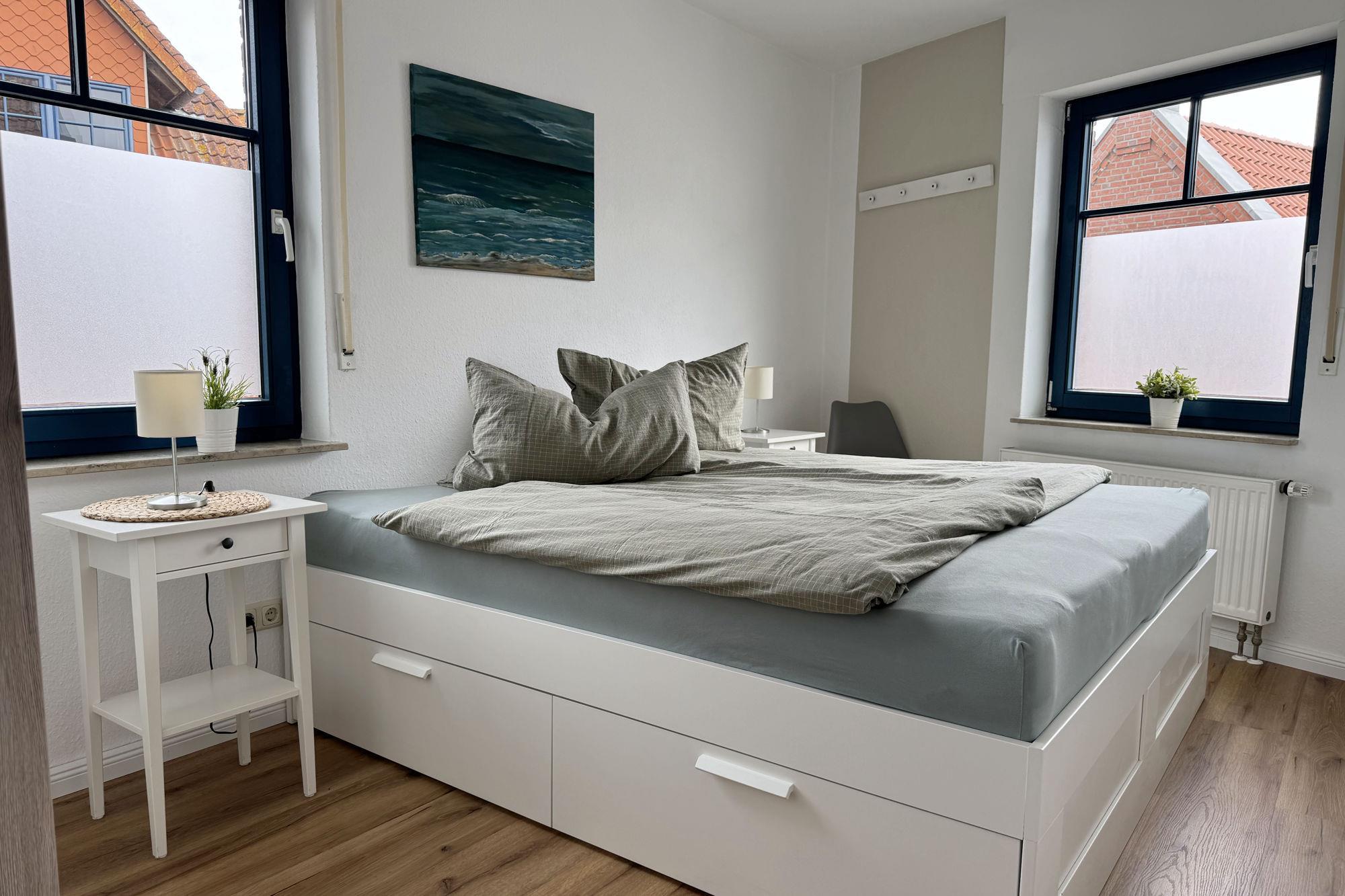 Das separate Schlafzimmer ist mit einem komfortablen Doppelbett ausgestattet und sorgt für eine erholsame Nachtruhe. Die ruhige Gestaltung unterstützt dabei entspannte Nächte nach einem erlebnisreichen Tag.