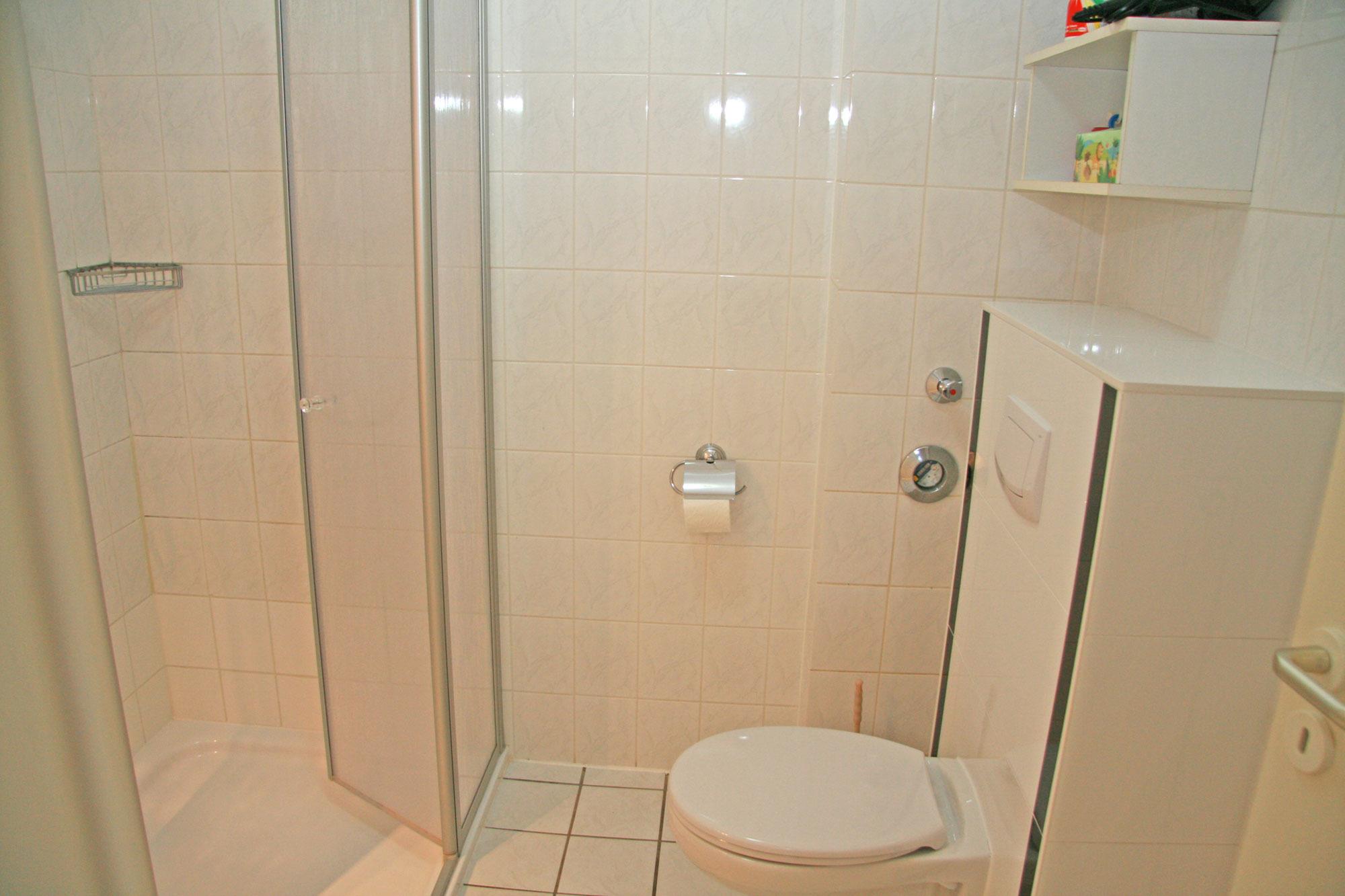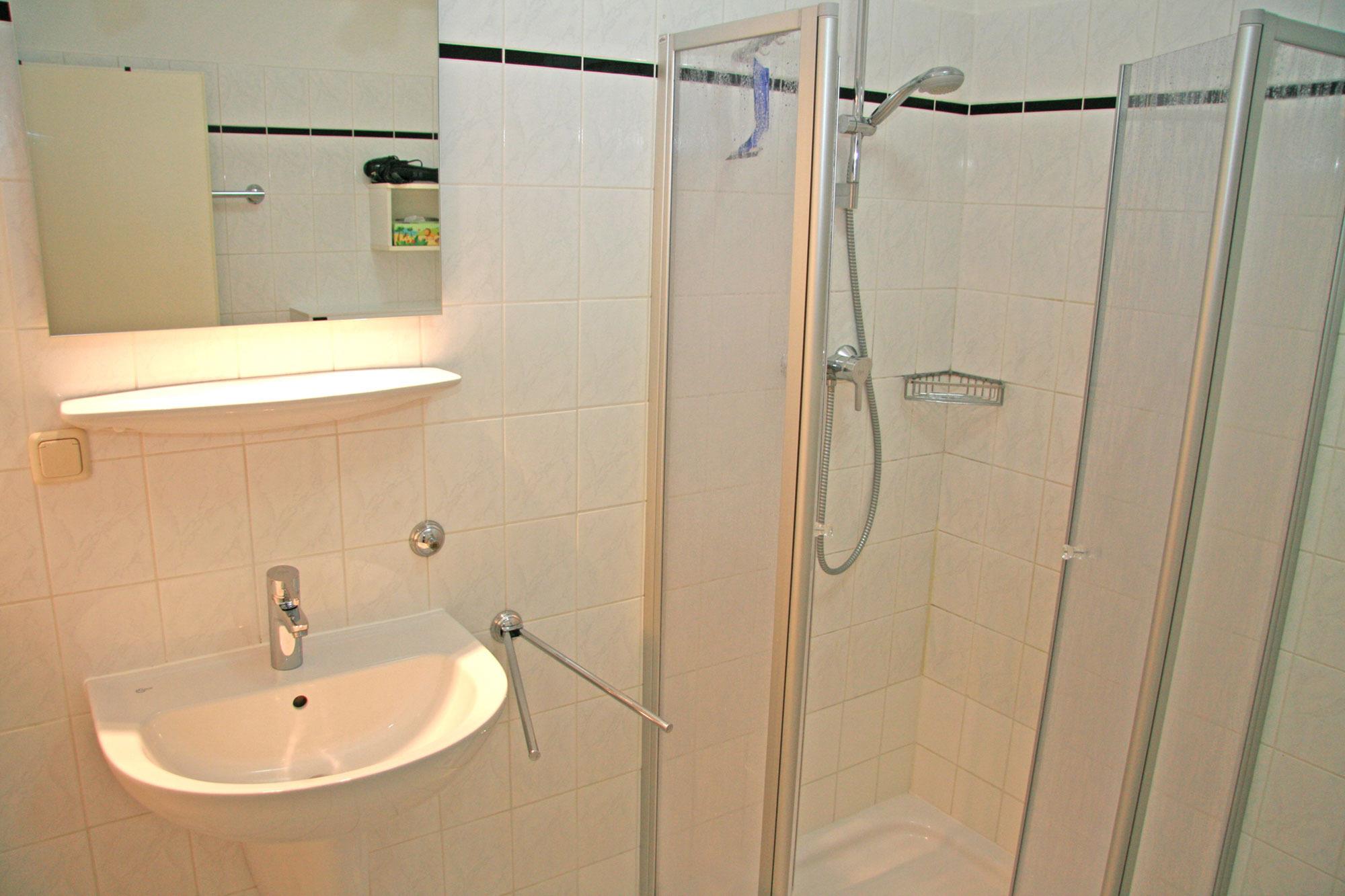 Das helle, moderne Duschbad mit Föhn, Rasierspiegel und Handtuchwärmer sorgt für zusätzlichen Komfort. Pflegeleichte Böden tragen zum Wohlfühlambiente bei. Eine gemeinschaftlich nutzbare Waschmaschine, ein Trockner und eine Gefriertruhe stehen allen Gästen des Hauses kostenlos zur Verfügung. Im eigenen Abstellraum befinden sich zudem ein Bügeleisen, ein Bügelbrett und ein Wäscheständer.