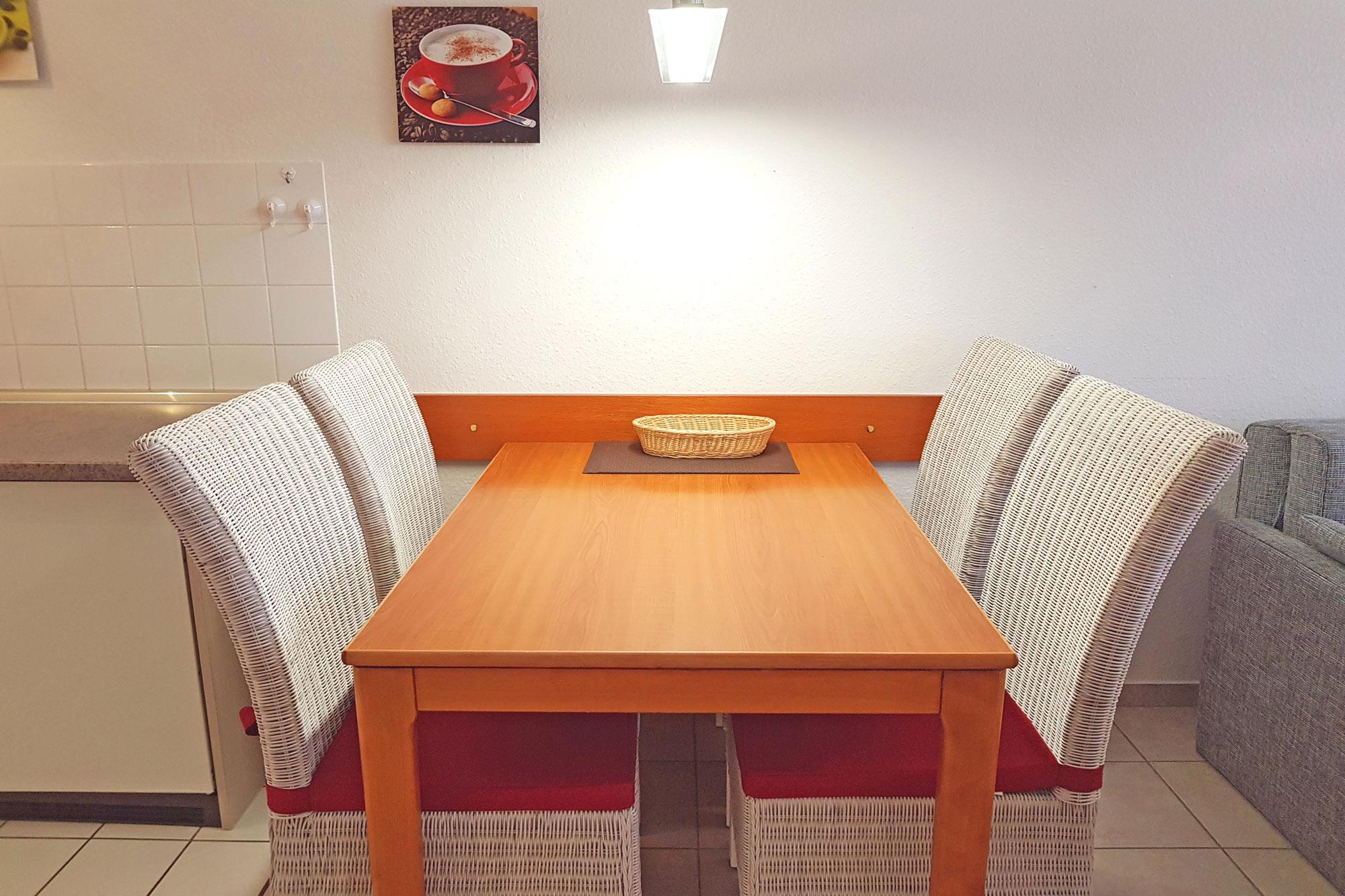 Das Apartment 3 im Erdgeschoss bietet auf etwa 40 Quadratmetern ausreichend Platz für bis zu vier Personen. Das Schlafzimmer ist mit zwei Einzelbetten und einem großen Kleiderschrank ausgestattet. Im Wohnbereich sorgt eine großzügige Schlafcouch für zwei weitere Personen für erholsame Nächte.