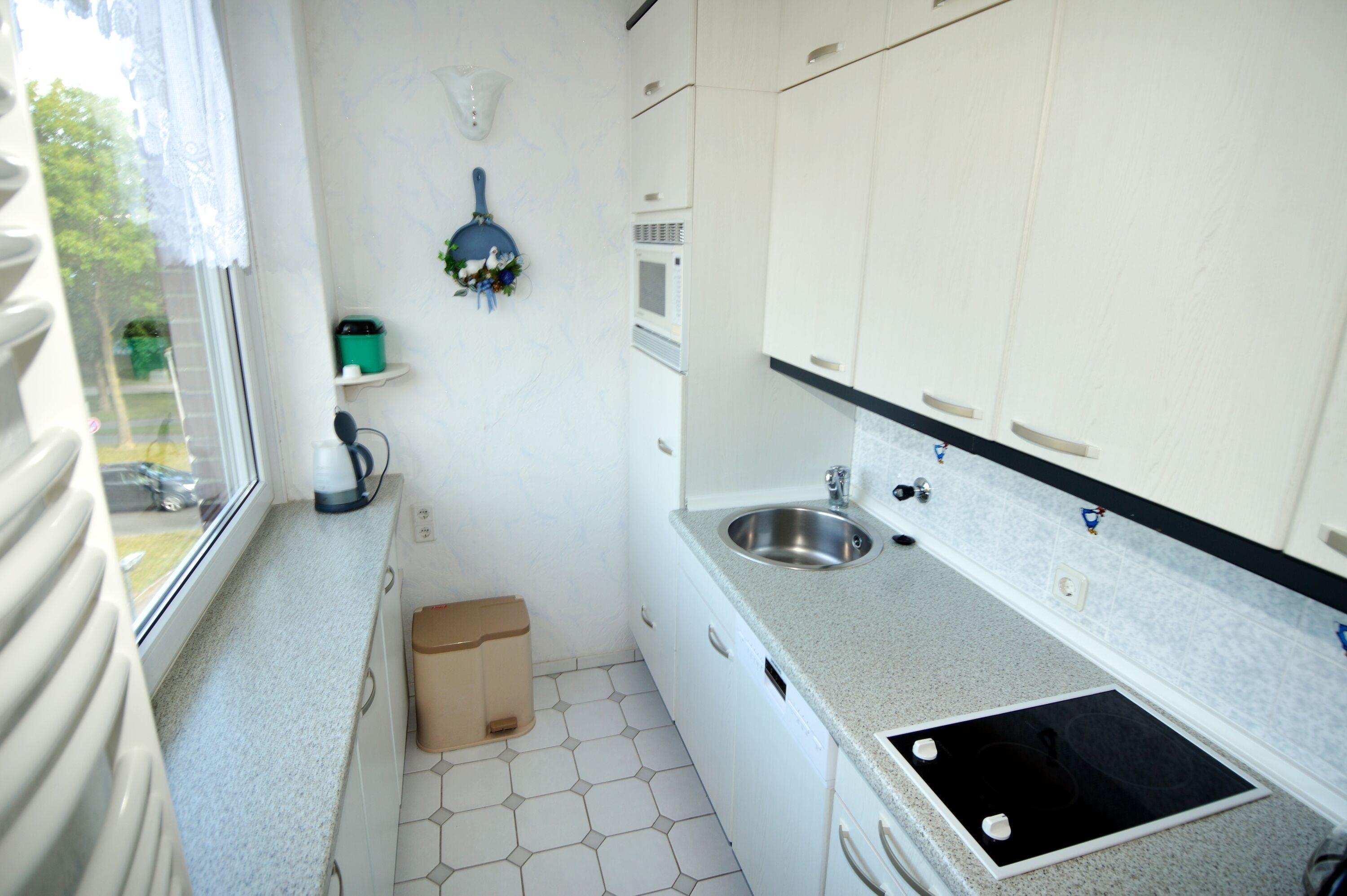 Die separate Küche ist praktisch und vollständig ausgestattet. Sie verfügt über ein Cerankochfeld, eine Mikrowelle sowie eine Geschirrspülmaschine und bietet zudem einen schönen Blick in Richtung Binnensee. Somit stehen Ihnen alle Annehmlichkeiten für die Selbstversorgung während Ihres Aufenthaltes zur Verfügung.
