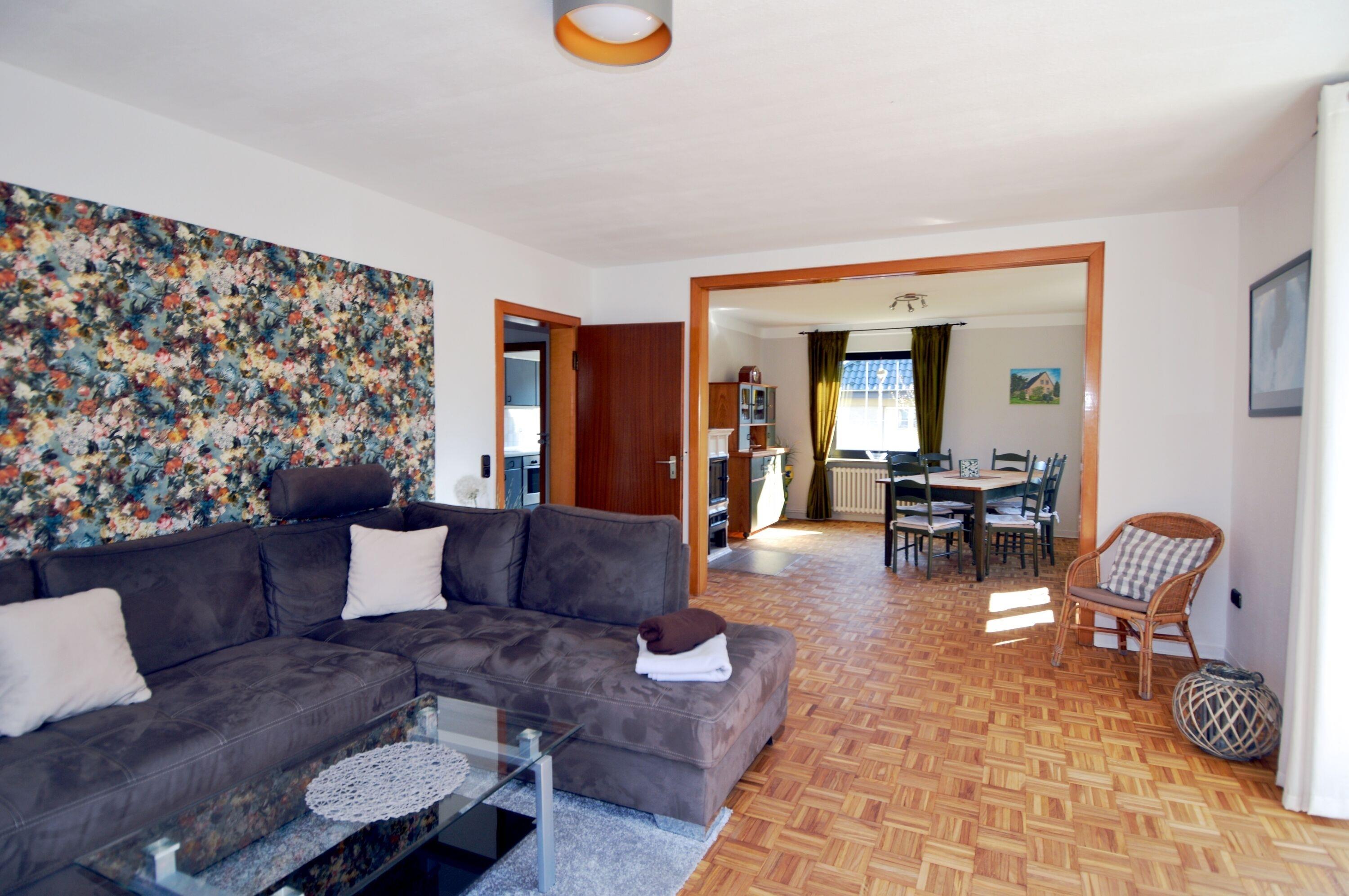 Im Erdgeschoss befindet sich der großzügig geschnittene Wohn- und Essbereich. Dieser ist mit einer großen Couch, einem Fernseher sowie einem geräumigen Esstisch ausgestattet. Ein Kaminofen ist vorhanden und kann genutzt werden (kein Holzvorrat). Vom Wohnbereich aus besteht direkter Zugang zur Terrasse, die mit Gartenmöbeln ausgestattet ist und Platz für den Aufenthalt im Freien bietet.