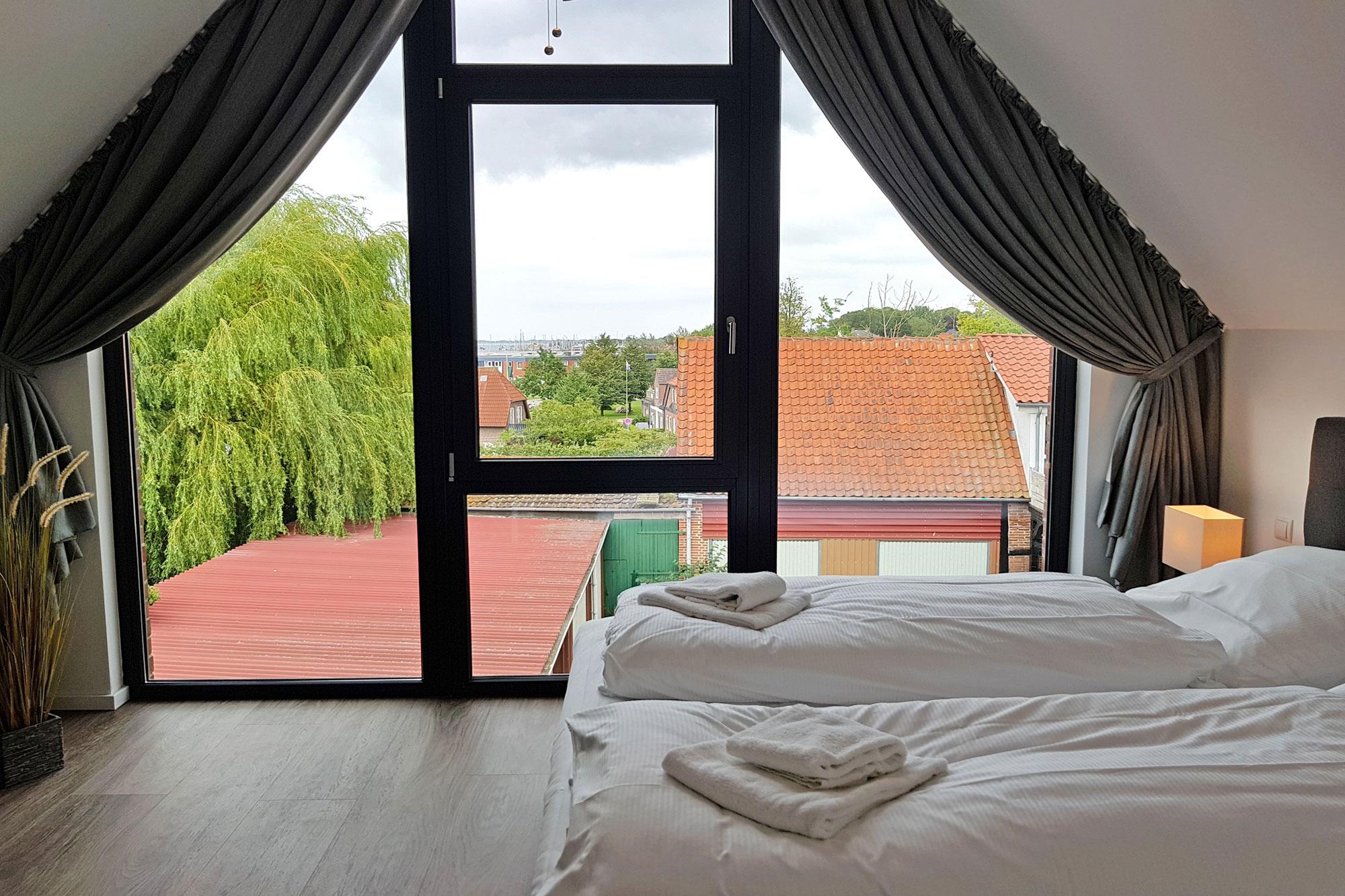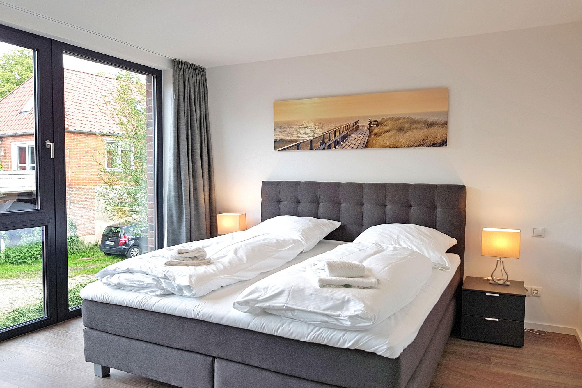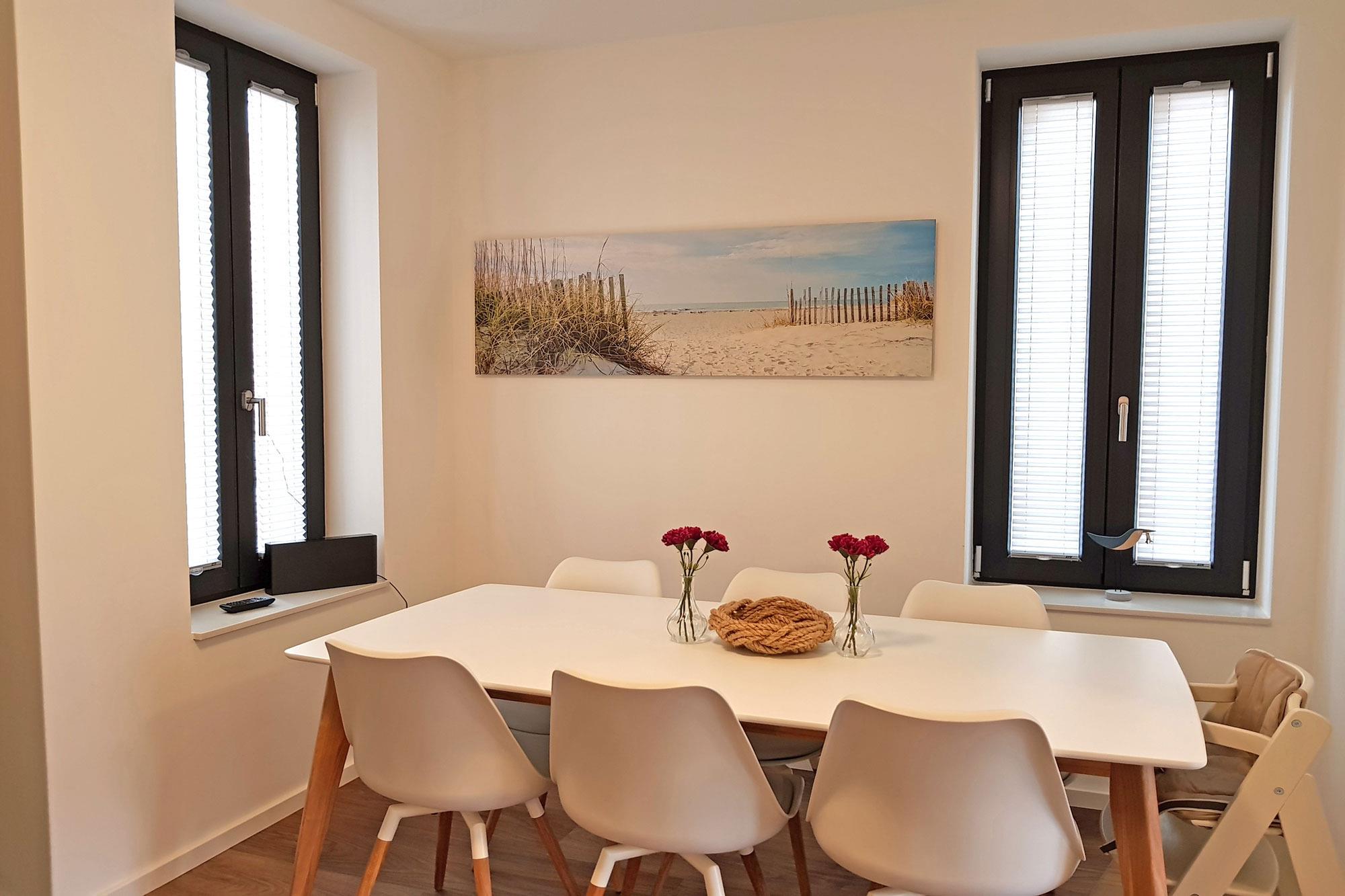 Das Haus ist ideal für Familien und Kleingruppen, da es über vier separate Schlafzimmer verfügt. Zwei Zimmer sind mit komfortablen Doppelbetten ausgestattet, eines mit zwei Einzelbetten und ein weiteres mit einem Einzelbett. Auch Ihr vierbeiniger Freund darf hier übernachten – allerdings nicht in den Betten! Falls Sie mit Kleinkindern reisen, können Baby-Reisebetten gegen Gebühr bereitgestellt werden. Große Fensterfronten sorgen in allen Räumen für viel Tageslicht, während Vorhänge und Plissees für Verdunklung und erholsamen Schlaf sorgen. Ein besonderes Highlight ist das große Schlafzimmer im Dachgeschoss, von dem aus Sie sogar Ostseeblick haben.