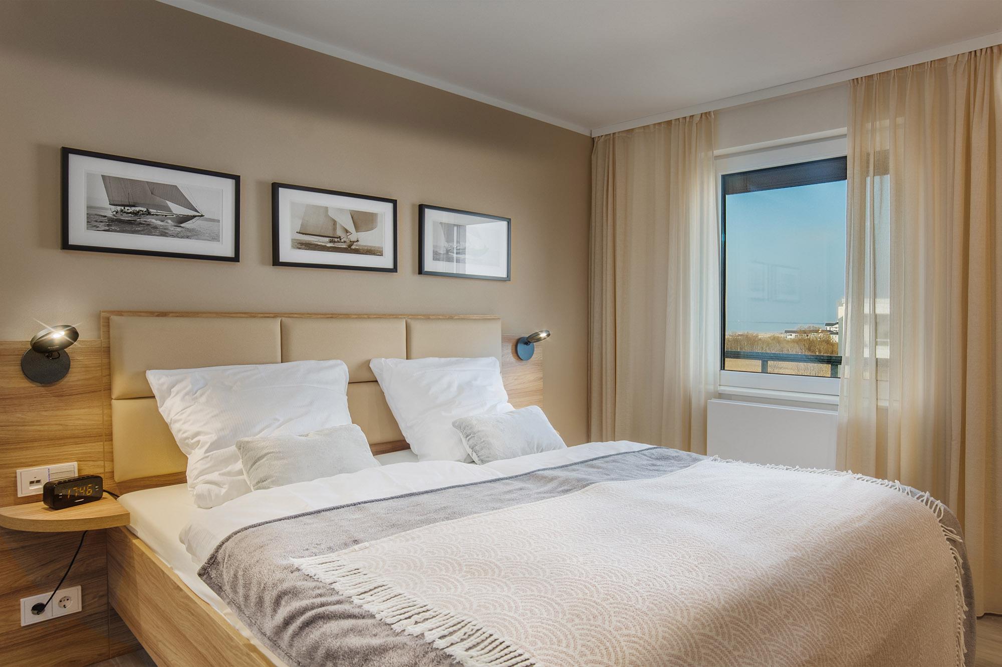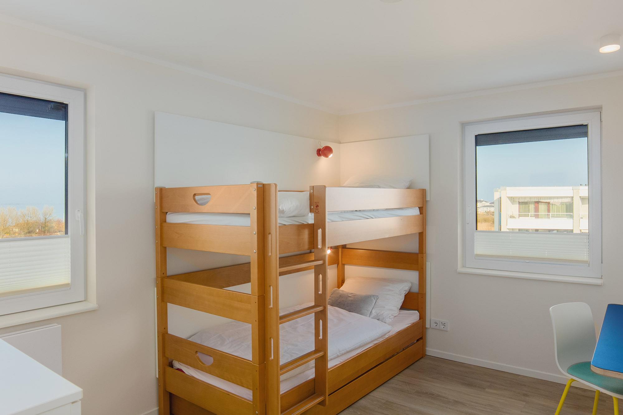 Dat Penthus verfügt über maximal 7 Schlafmöglichkeiten durch zwei separate Schlafzimmer mit Doppelbetten (160x200 und 180x200) und einem Schlafzimmer als Kinderzimmer konzipiert mit Etagenbett (90x200) und Ausziehelement für ein drittes Kind. Alle Räume haben Rollläden bzw. zusätzlich Plissees und Vorhänge zum Sichtschutz und zur Verdunklung. Komfortables Licht und Steuerelemente gehören hier einfach dazu.
