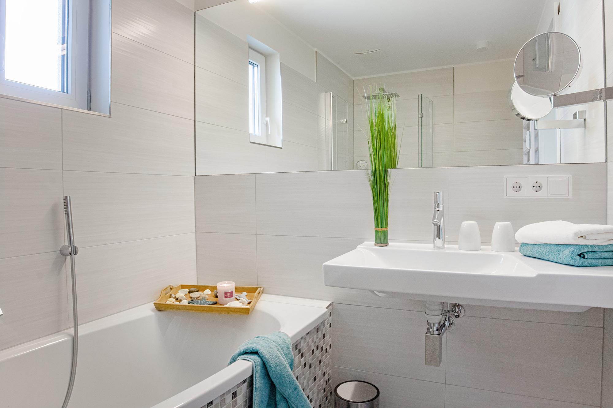 Die Wellness-Bäder, eines mit eigener Sauna und von einem Schlafzimmer direkt erreichbar, laden auch an grauen und kalten Tagen zur Entspannung ein. Handtuchwärmer, große Dusche oder Wanne sorgen für extra Annehmlichkeit. Eine Waschmaschine + Trockner (Münznutzung) stehen zudem im Erdgeschoss des Hauses zur Nutzung bereit. Als Besonderheit hierbei sei das kleine Fenster der Sauna, mit direktem Blick auf die Ostsee, genannt.