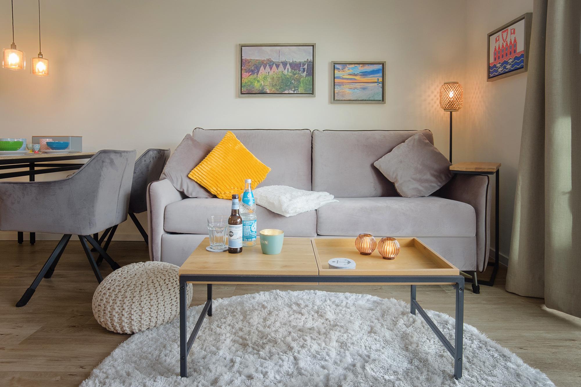 Der großzügige Wohnbereich mit einem Dauerschläfer-Sofa (1,60 m breit, 2 m lang) und einem zweiten Flat-Smart-TV bietet viel Raum für gemütliche Fernsehabende.