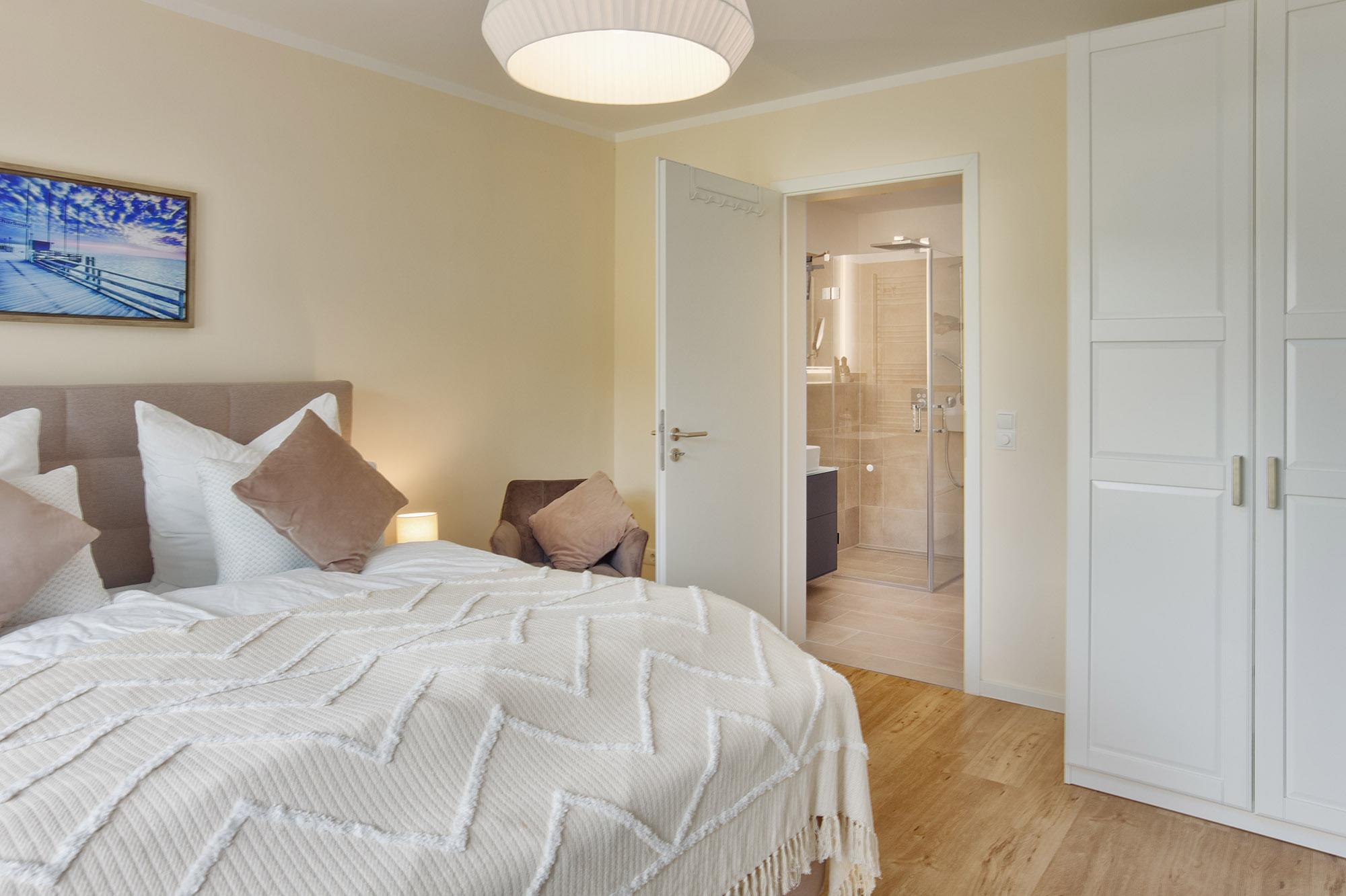 Vom Schlafzimmer mit Boxspringbett, Flat-Smart-TV und Verdunkelungsvorhängen für eine erholsame Nacht, gelangt man direkt ins Badezimmer mit ebenerdiger Dusche und angrenzender Sauna, die Sie in Ihrem Urlaub selbstverständlich nutzen dürfen.