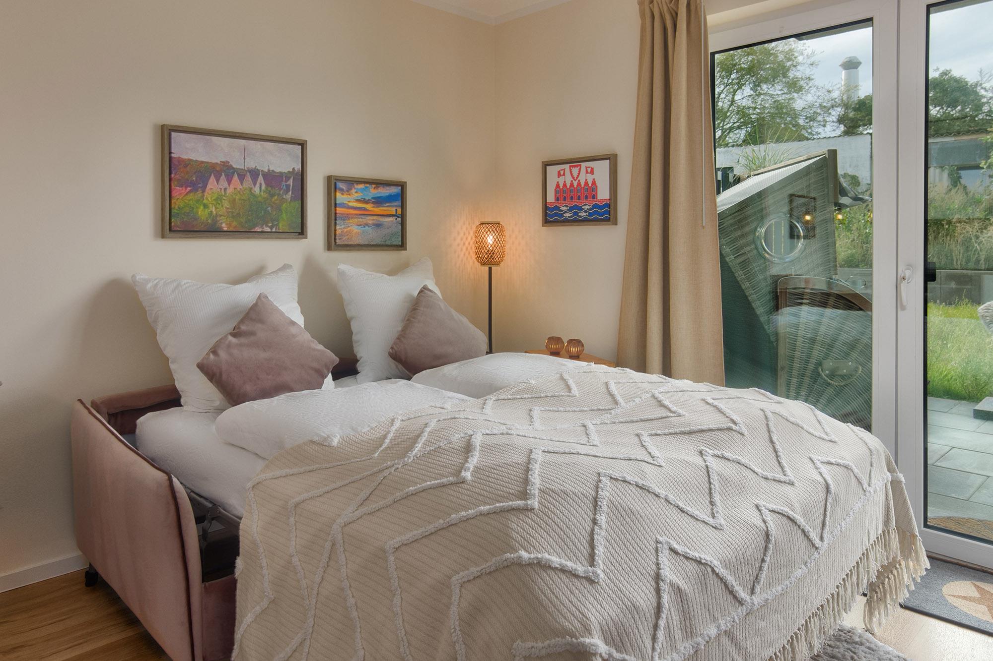 Das Besondere: Zum Erfrischen nach dem Saunagang braucht man nur noch die Terrassentüren des Schlafzimmers zu öffnen und schon kann man sich auf der großen Wohlfühl-Terrasse die Ostseebrise um die Nase wehen lassen.