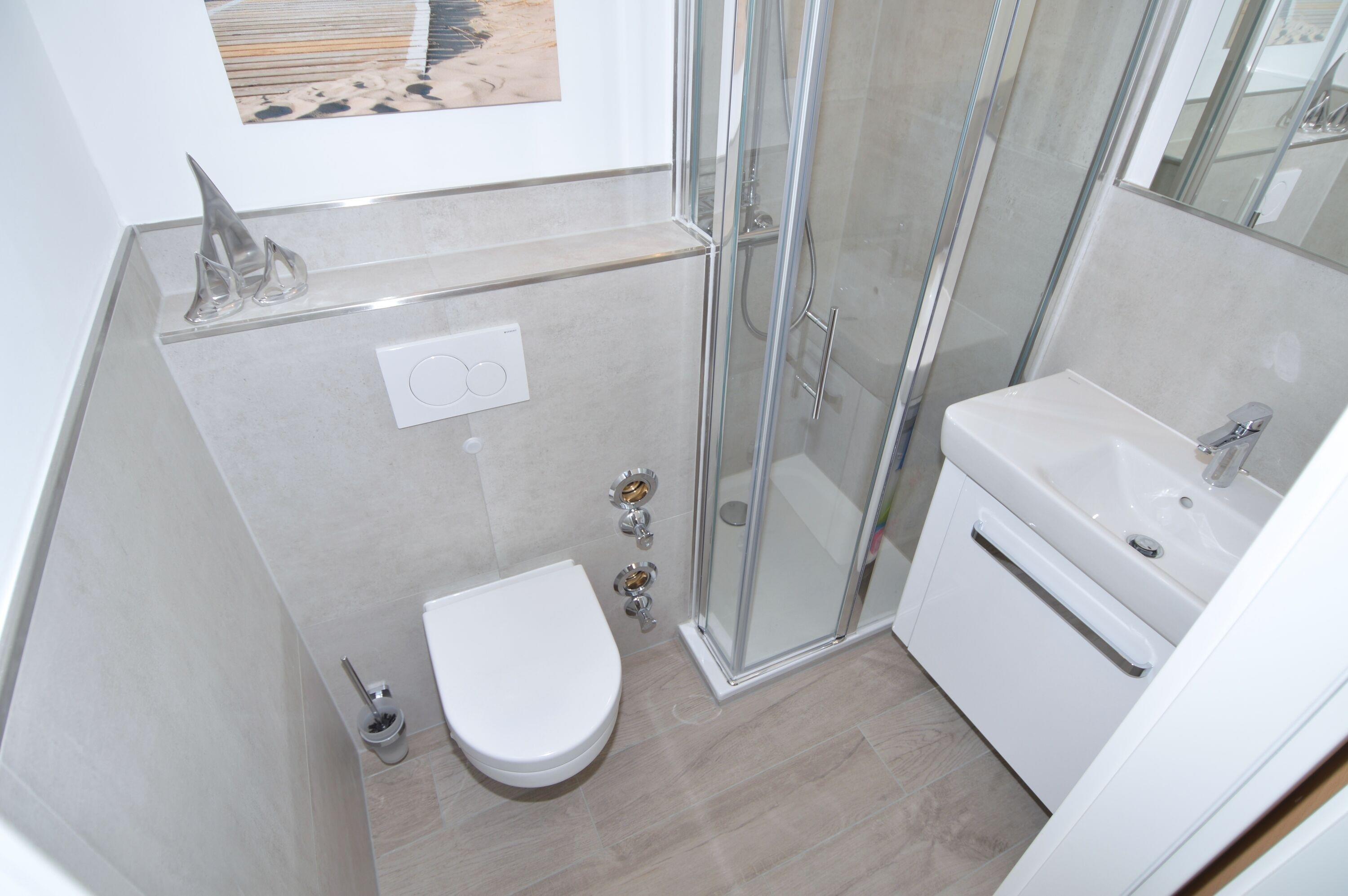Das moderne Duschbad mit schmalem Eckeinstieg ist funktional gestaltet und bietet viel Platz zum Entspannen. Genießen Sie entspannende Momente nach einem langen Tag am Strand oder bei sportlichen Aktivitäten.