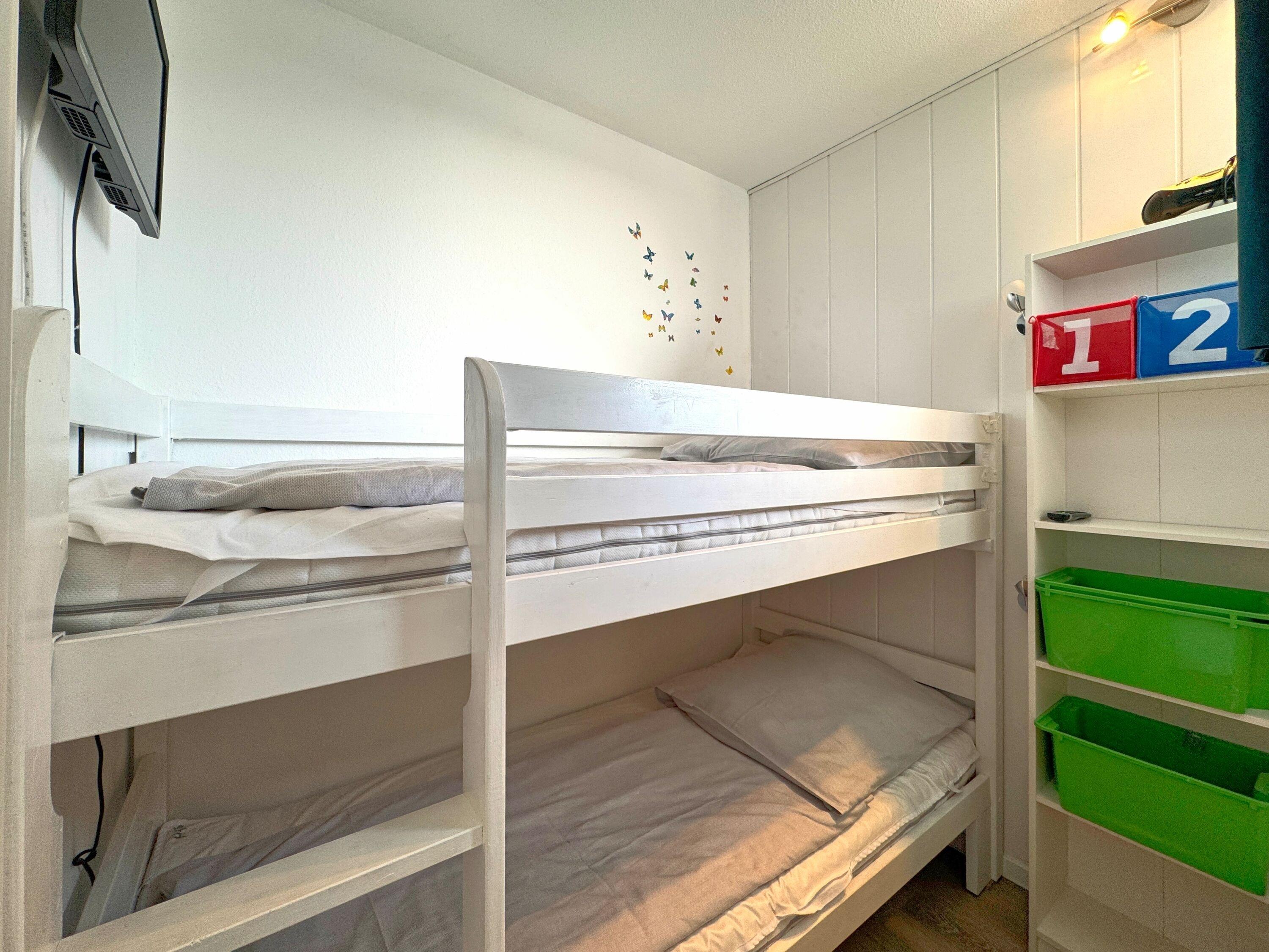 Der kombinierte Wohn- und Schlafbereich ist funktional eingerichtet und bietet den Eltern einen komfortablen Schlafplatz. Für die kleinen Urlaubsgäste steht ein separater Schlafbereich zur Verfügung, der ausreichend Platz zum Ausruhen bietet.
