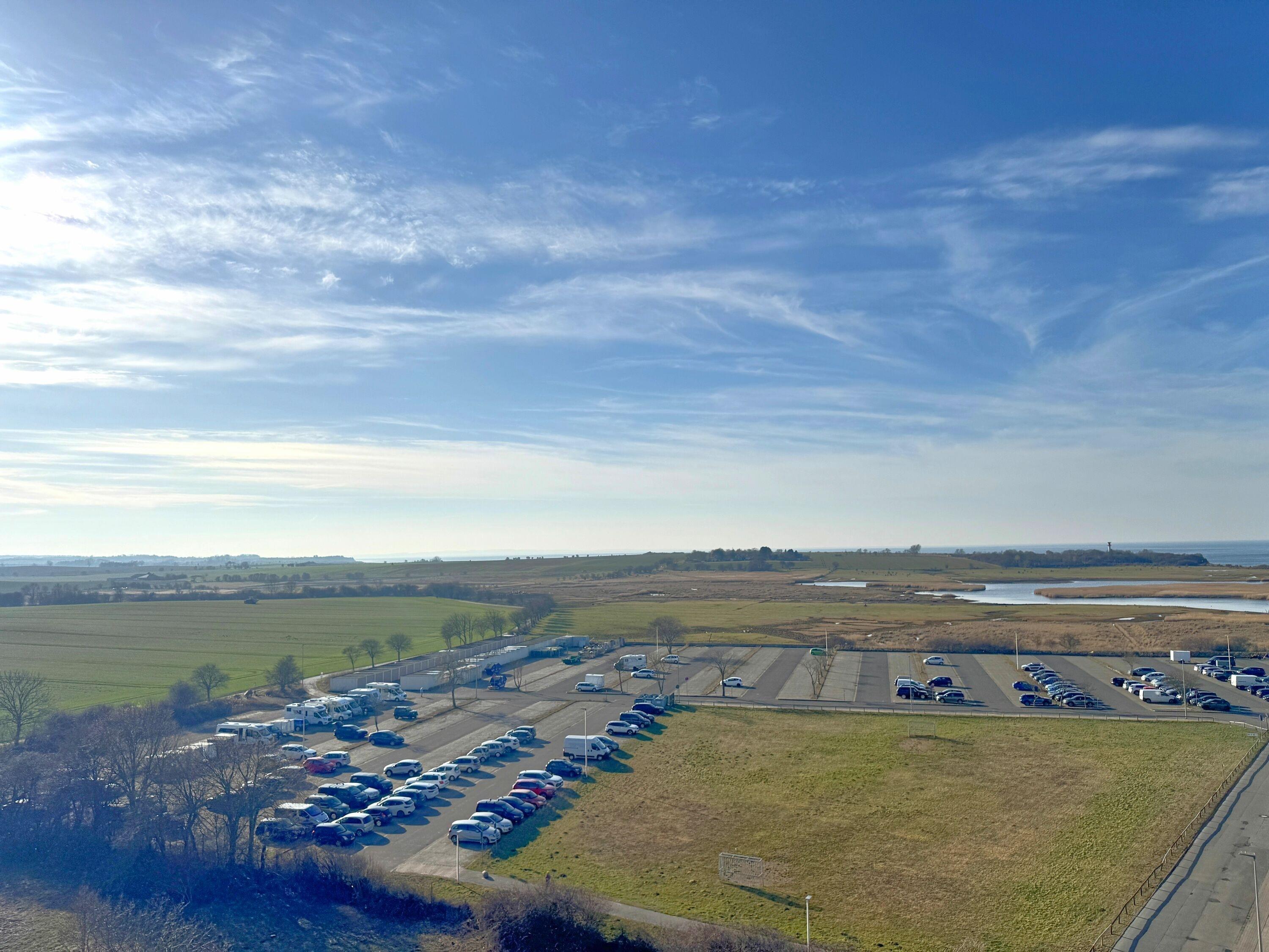 Von hier aus genießen Sie einen beeindruckenden Blick über die Salzwiesen des Eichholzes bis hin zur Ostsee. Besonders in den Abendstunden sorgt die tief stehende Sonne für eine stimmungsvolle Atmosphäre, die Sie entspannt vom möblierten Balkon aus erleben können. Hier lässt sich der Tag wunderbar ausklingen – mit Blick in die Natur und frischer Seeluft.