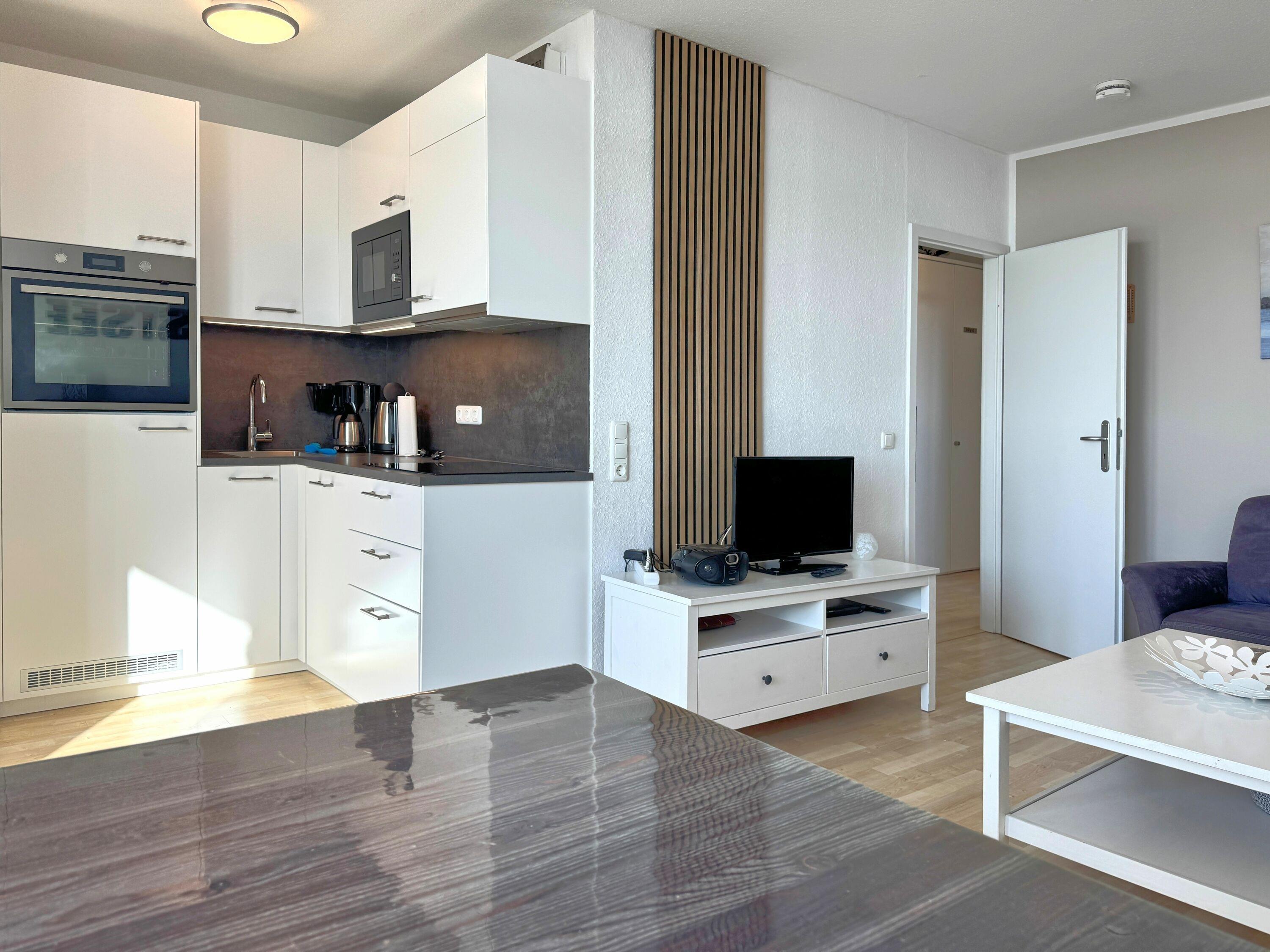 Die Küche ist vollständig und familienfreundlich ausgestattet. Neben einem Cerankochfeld, Backofen und einer Spülmaschine stehen Ihnen auch eine Waschmaschine, ein Kühlschrank mit Gefrierfach, eine Mikrowelle, Kaffeemaschine, Toaster und ein Wasserkocher zur Verfügung – ideal für eine komfortable Selbstversorgung während Ihres Aufenthalts.