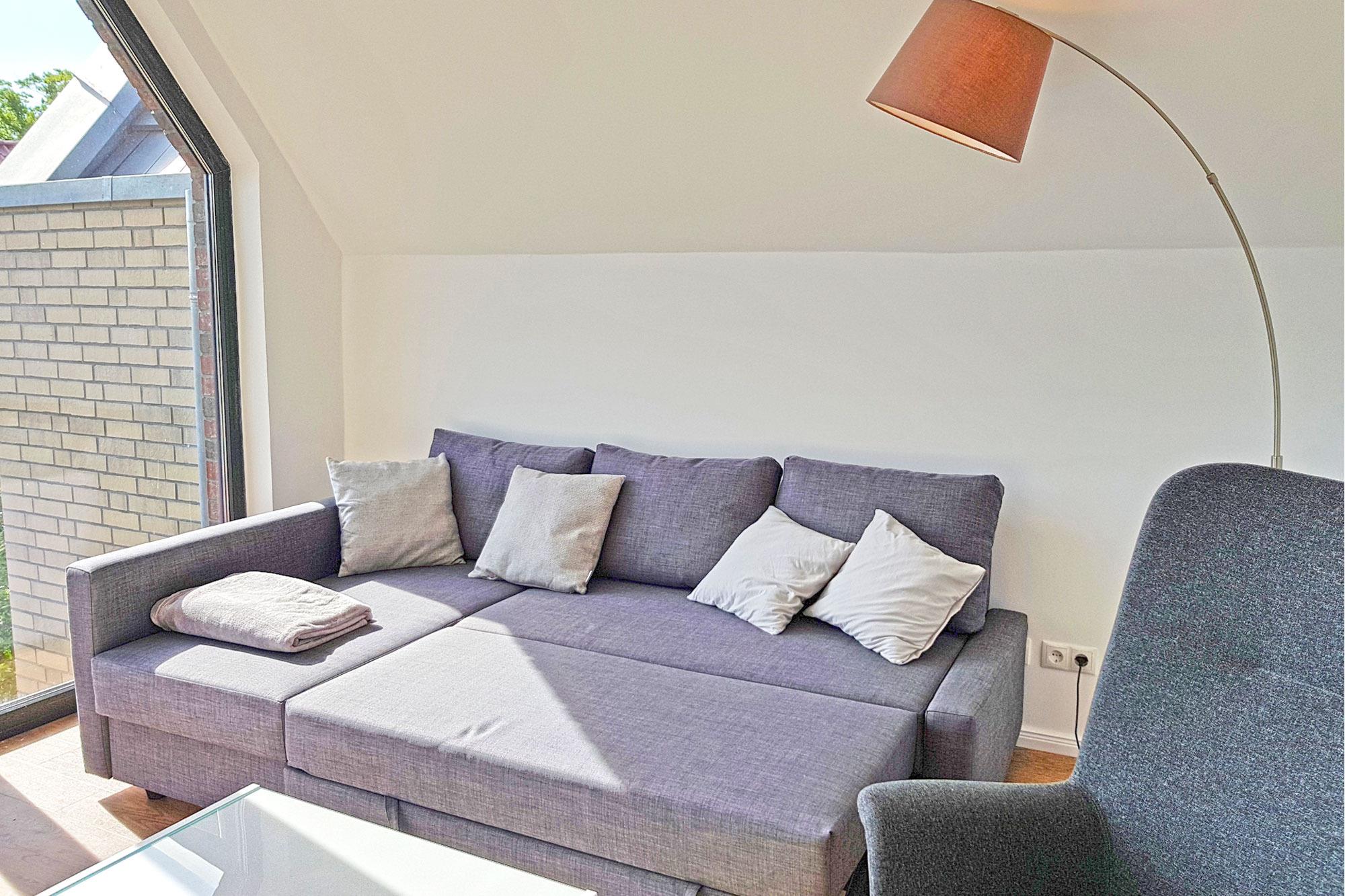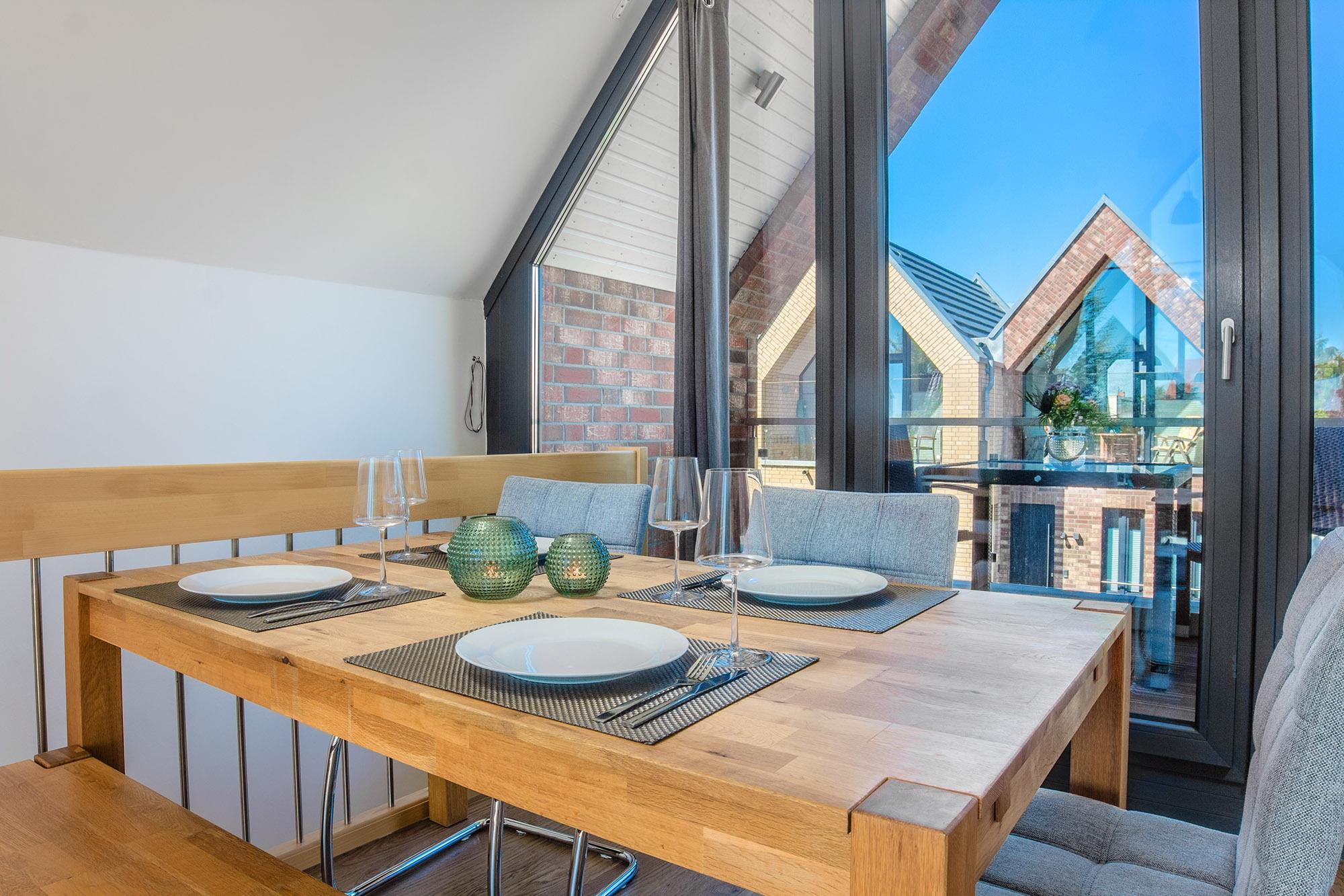 Über die Treppe gelangen Sie ins Dachgeschoss, wo sich neben dem Wohnbereich die offene, voll ausgestattete Küche befindet. Diese bietet Ihnen alle Annehmlichkeiten, die Sie für Ihren Aufenthalt benötigen, darunter eine Spülmaschine und moderne Küchengeräte. Der angrenzende Essbereich lädt zu geselligen Mahlzeiten in stilvollem Ambiente ein. Auf dem West-Balkon genießen Sie entspannte Stunden und lassen die Sonne über der Ostsee untergehen – der perfekte Ort, um den Tag bei einem Glas Wein ausklingen zu lassen.