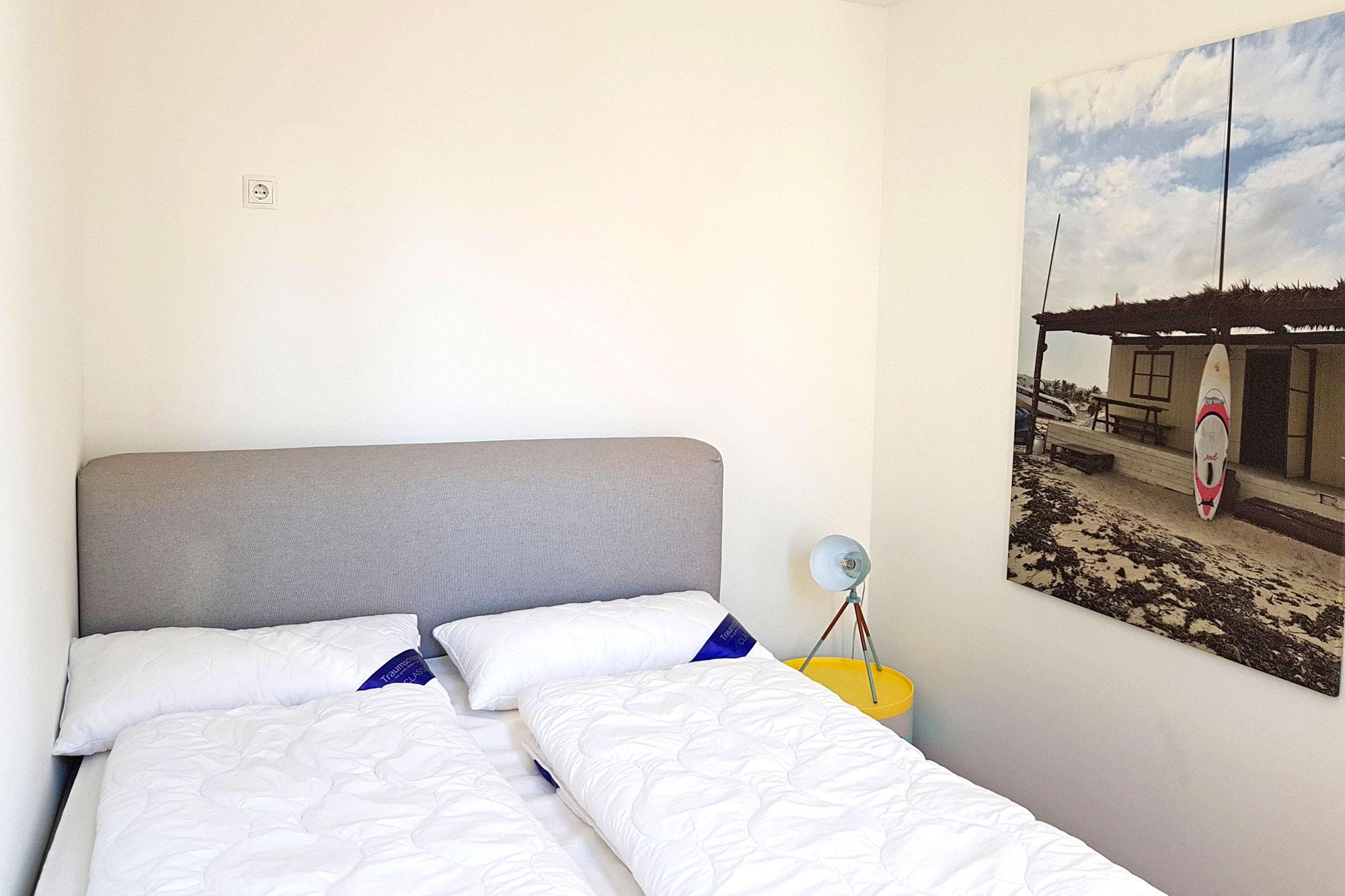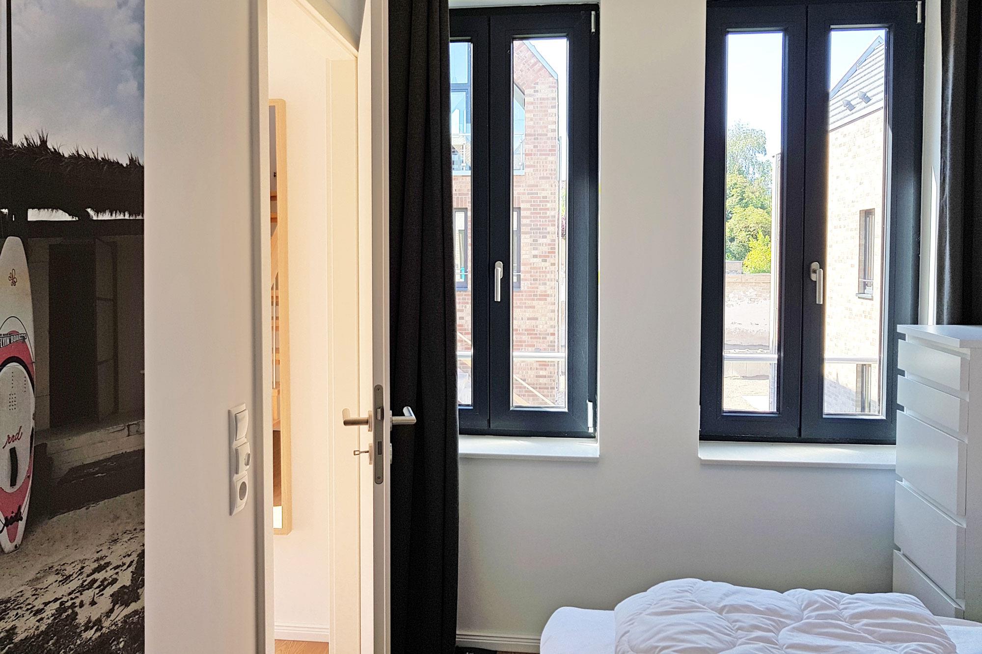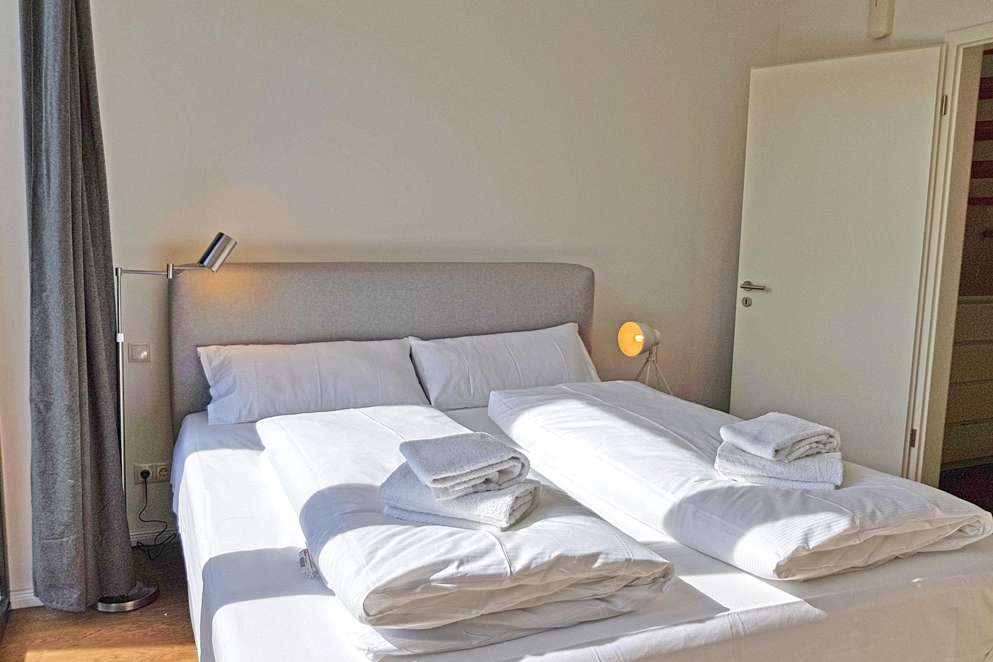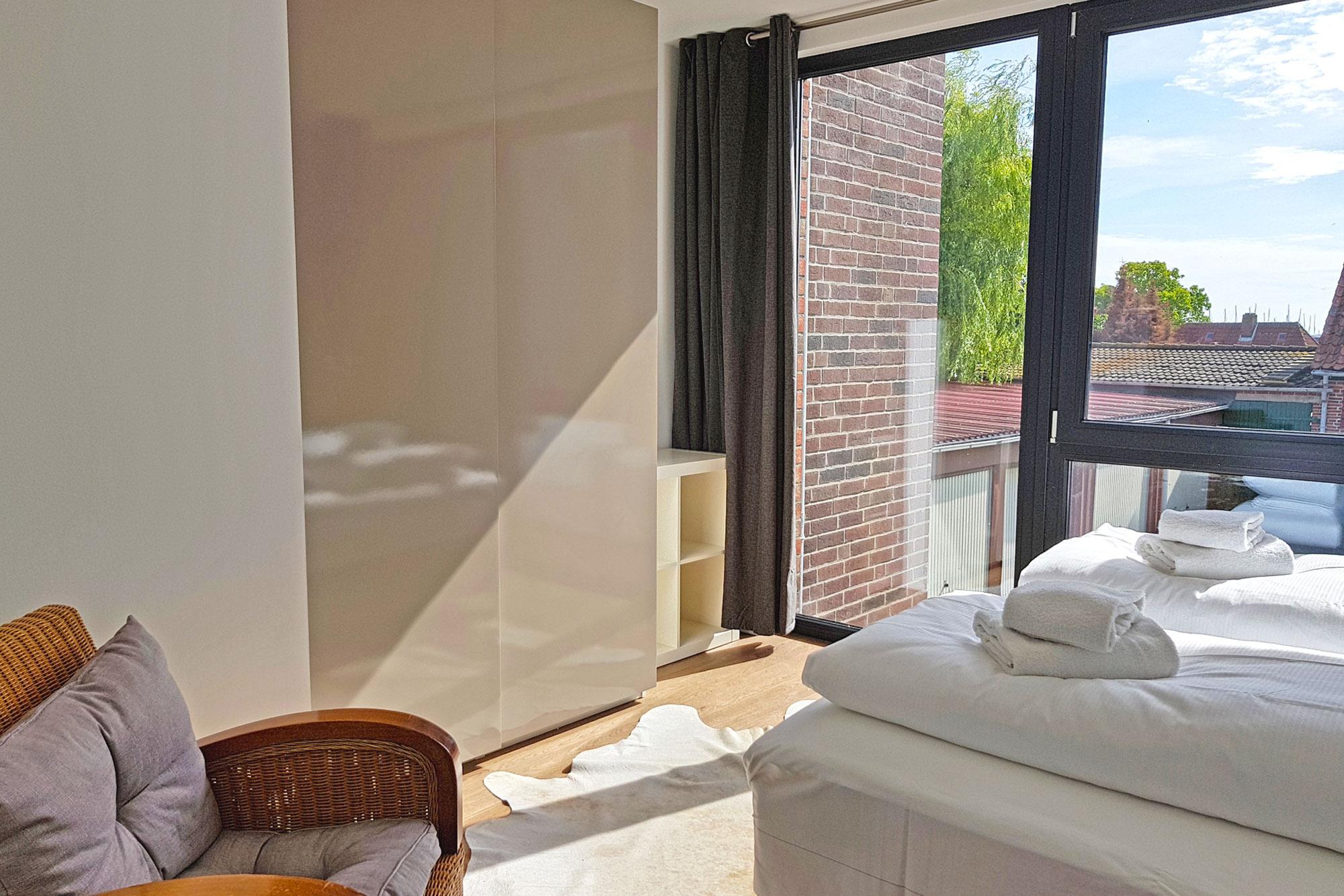 Die Ferienwohnung ist ideal für Familien und Paare geeignet, denn sie verfügt über zwei separate Schlafzimmer mit komfortablen Doppel-Boxspringbetten, die sich im ersten Obergeschoss befinden. Besonders das große Schlafzimmer überzeugt mit einer großzügigen Fensterfront, die ein helles und freundliches Ambiente schafft. Verdunkelungsvorhänge sorgen für erholsame Nächte und einen ungestörten Schlaf. Gegen eine kleine Gebühr stehen allergikerfreundliche Bettwäsche, Handtuchsets, ein Babyreisebett sowie ein Hochstuhl zur Verfügung.