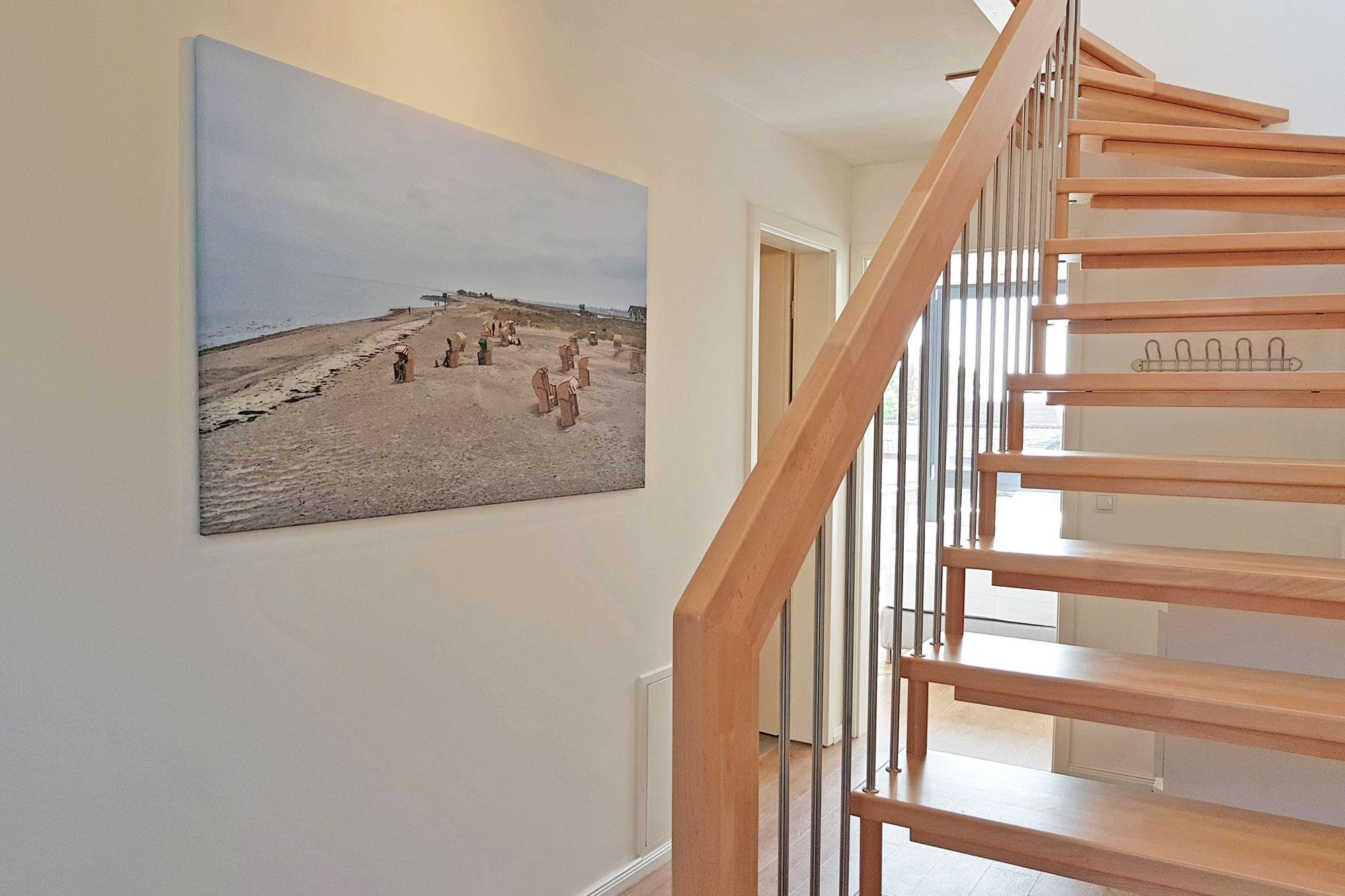 Das moderne Badezimmer ist mit einer ebenerdigen Dusche, einem Waschbecken und einem WC ausgestattet und bietet Ihnen nach einem erlebnisreichen Tag an der Ostsee die perfekte Erfrischung. Im Flur unter der Treppe befindet sich eine praktische Kommode für Ihre alltäglichen Dinge.
