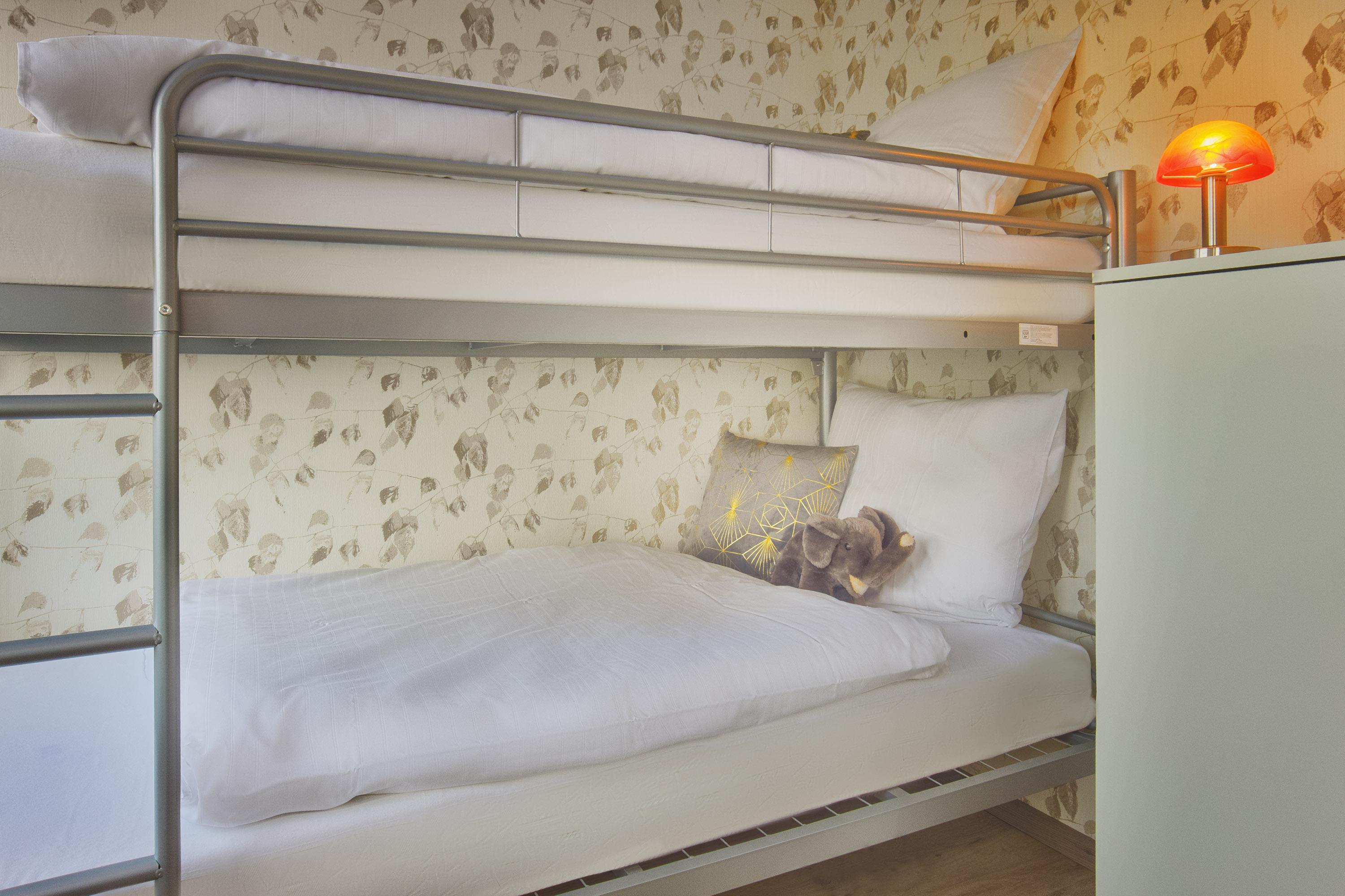 Ebenso komfortabel geht es in den zwei Schlafzimmern der Wohnung weiter. Einmal mit einem bequemen Doppelbett (180x200) und großem Kleiderschrank und im anderen Schlafzimmer ein Etagenbett, welches auch für Erwachsene geeignet ist. Für Verdunklung sorgen Plissees bzw. Rollo.