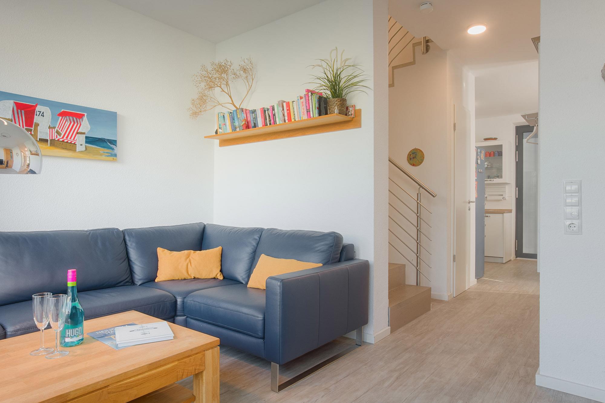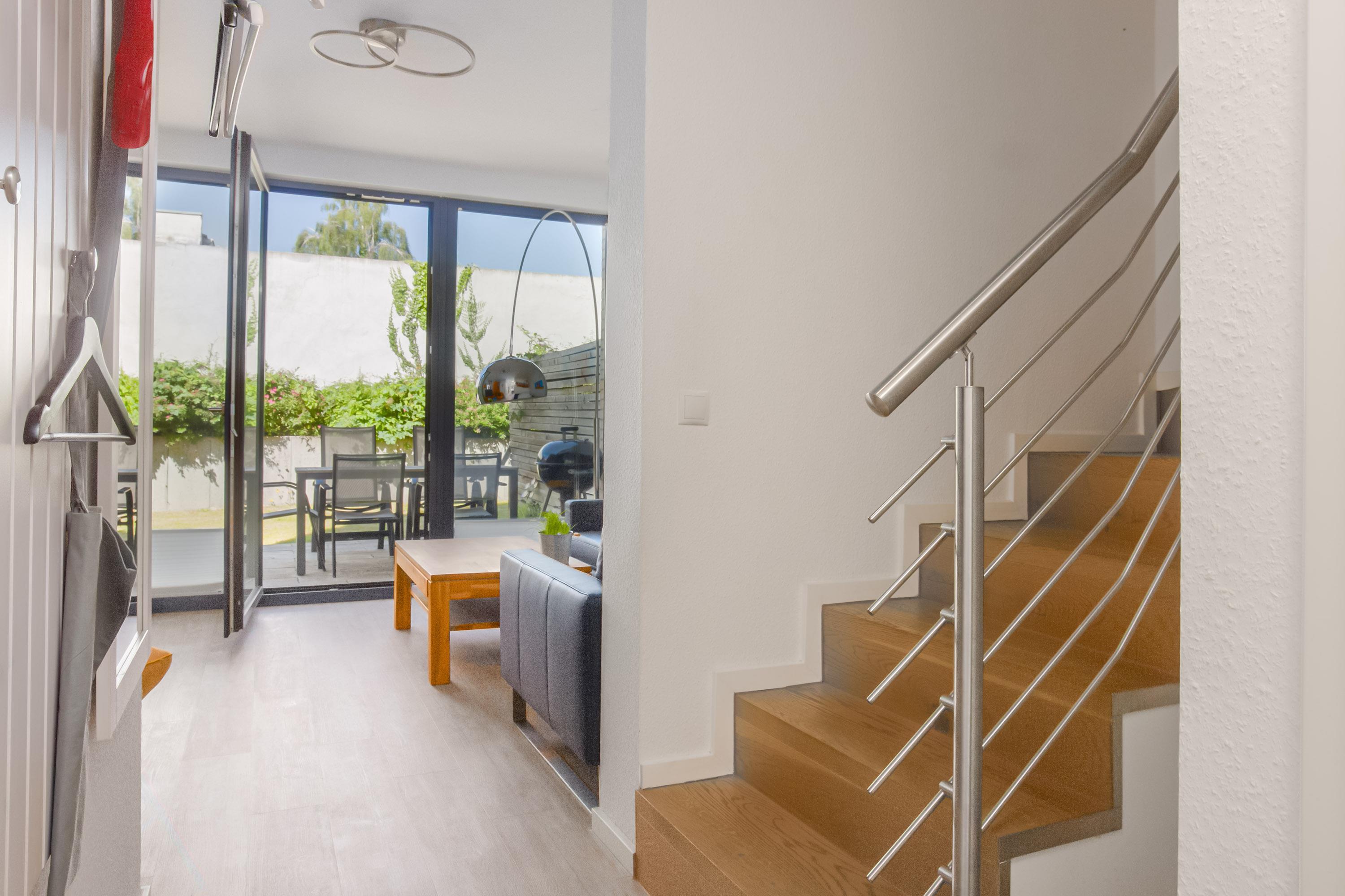 Das stilvolle Ferienhaus Frische Brise bietet auf ca. 100 m² Wohnfläche, verteilt über drei Ebenen, eine hochwertige Ausstattung und ausreichend Platz für bis zu sechs Personen. Hier erwartet Sie eine geschmackvolle Kombination aus modernem Design und gemütlicher Atmosphäre. Der Wohnbereich besticht durch warme Holzoptik, einen hochwertigen Vinylplanken-Bodenbelag im Holzlook sowie eine komfortable Polsterlandschaft, die zum Entspannen einlädt. Dank bodentiefer Fenster strömt viel Tageslicht ins Haus und schafft eine helle, freundliche Umgebung. Vom Sofa aus genießen Sie den direkten Blick auf die möblierte Terrasse und den angrenzenden Gartenbereich – ein perfekter Ort, um die frische Ostseeluft zu genießen. Ein Sonnenschirm sorgt für angenehmen Schatten, und ein Gas-Grill steht für gesellige Barbecue-Abende bereit.
